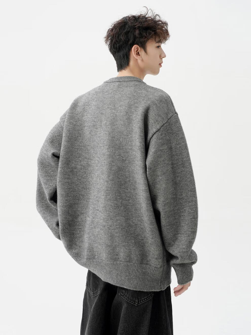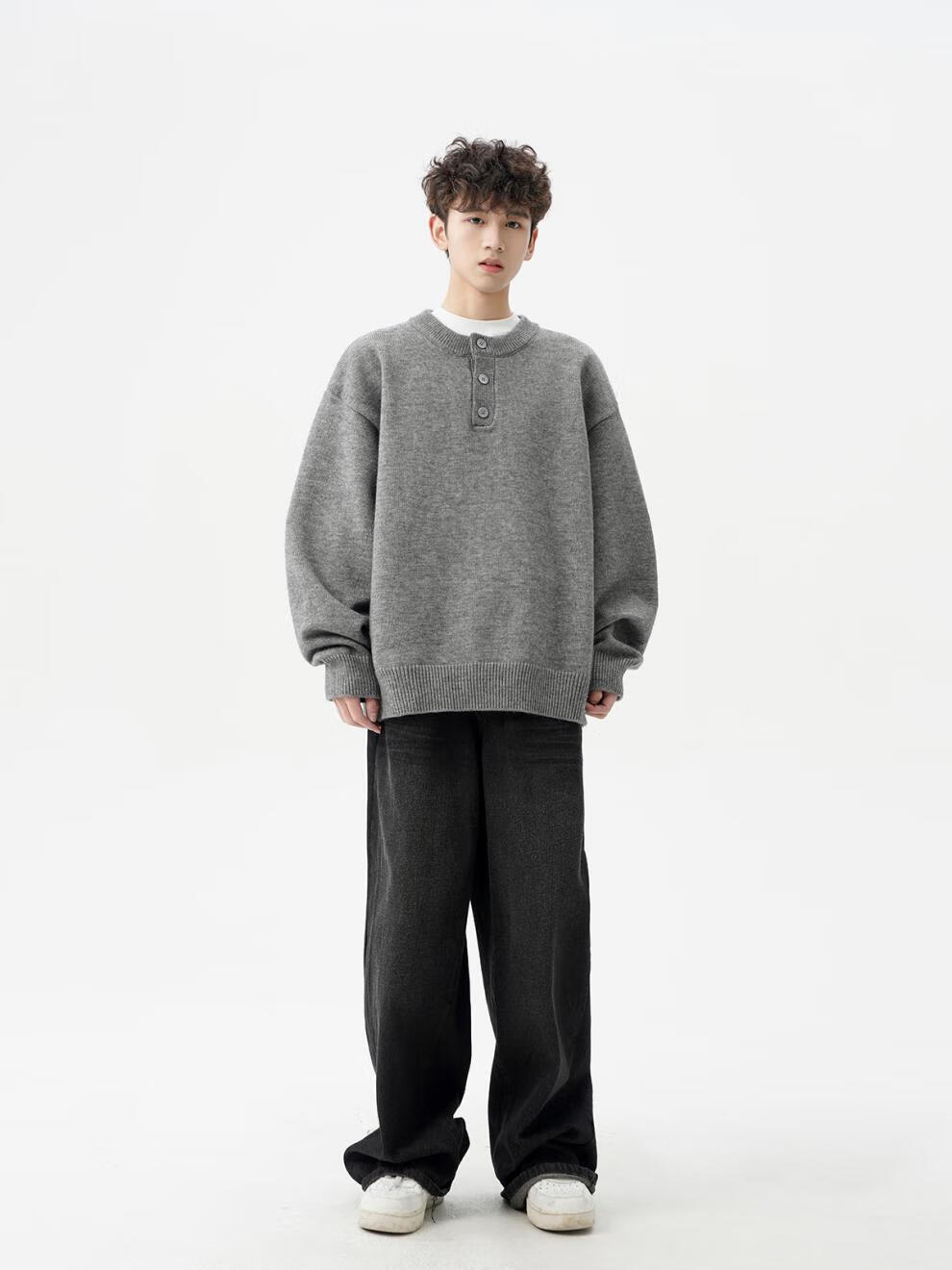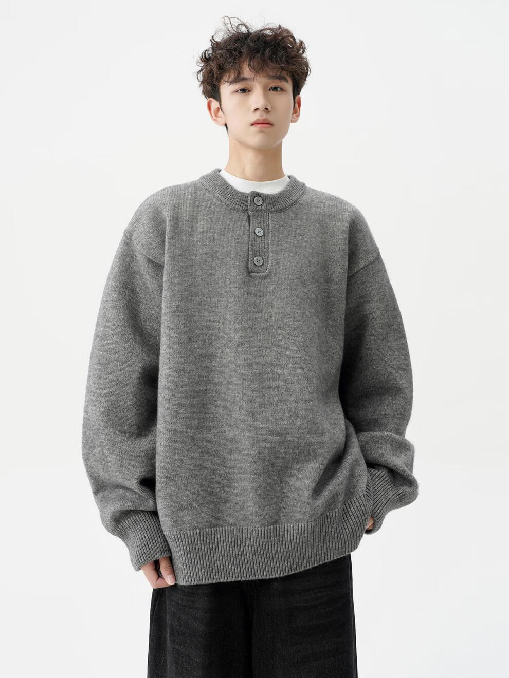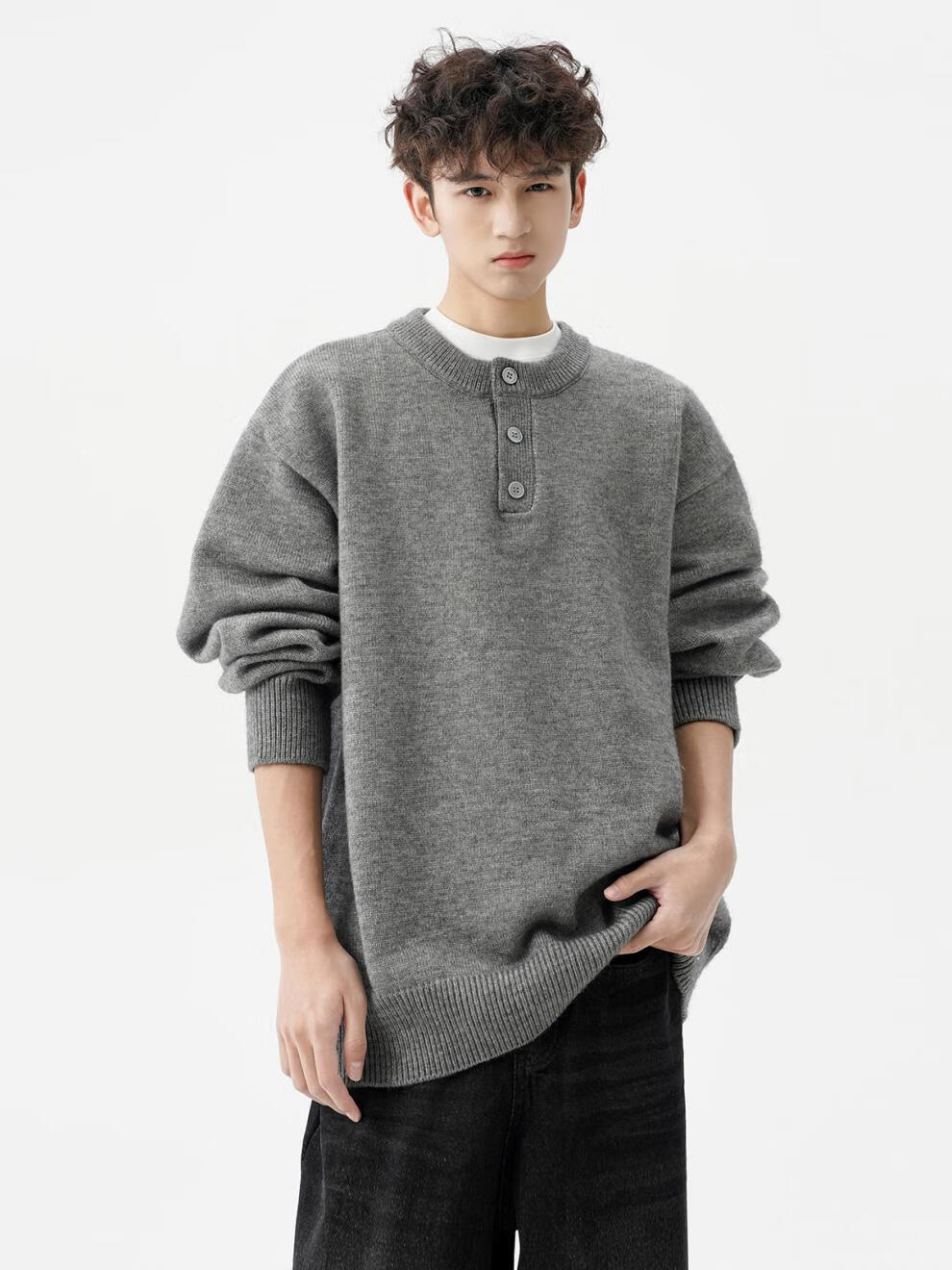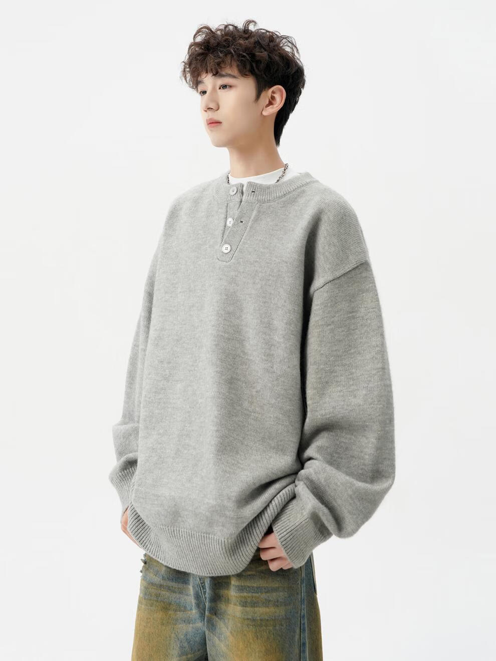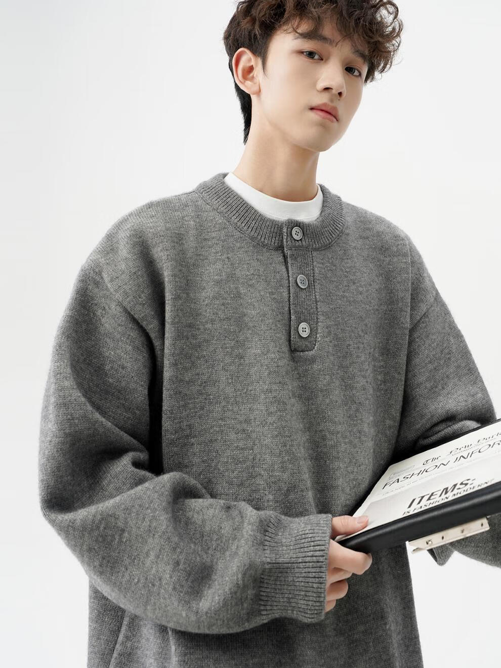 Playboy (PLAYBOY) American solid color Henry collar sweater men's autumn and winter new trendy brand-style sweater casual warm couple jacket light gray XL