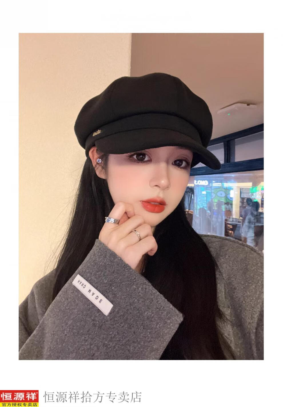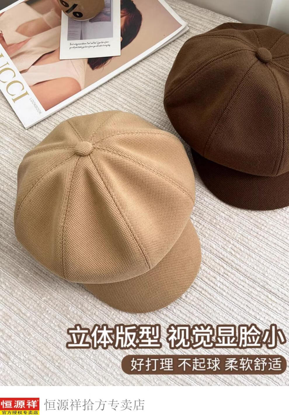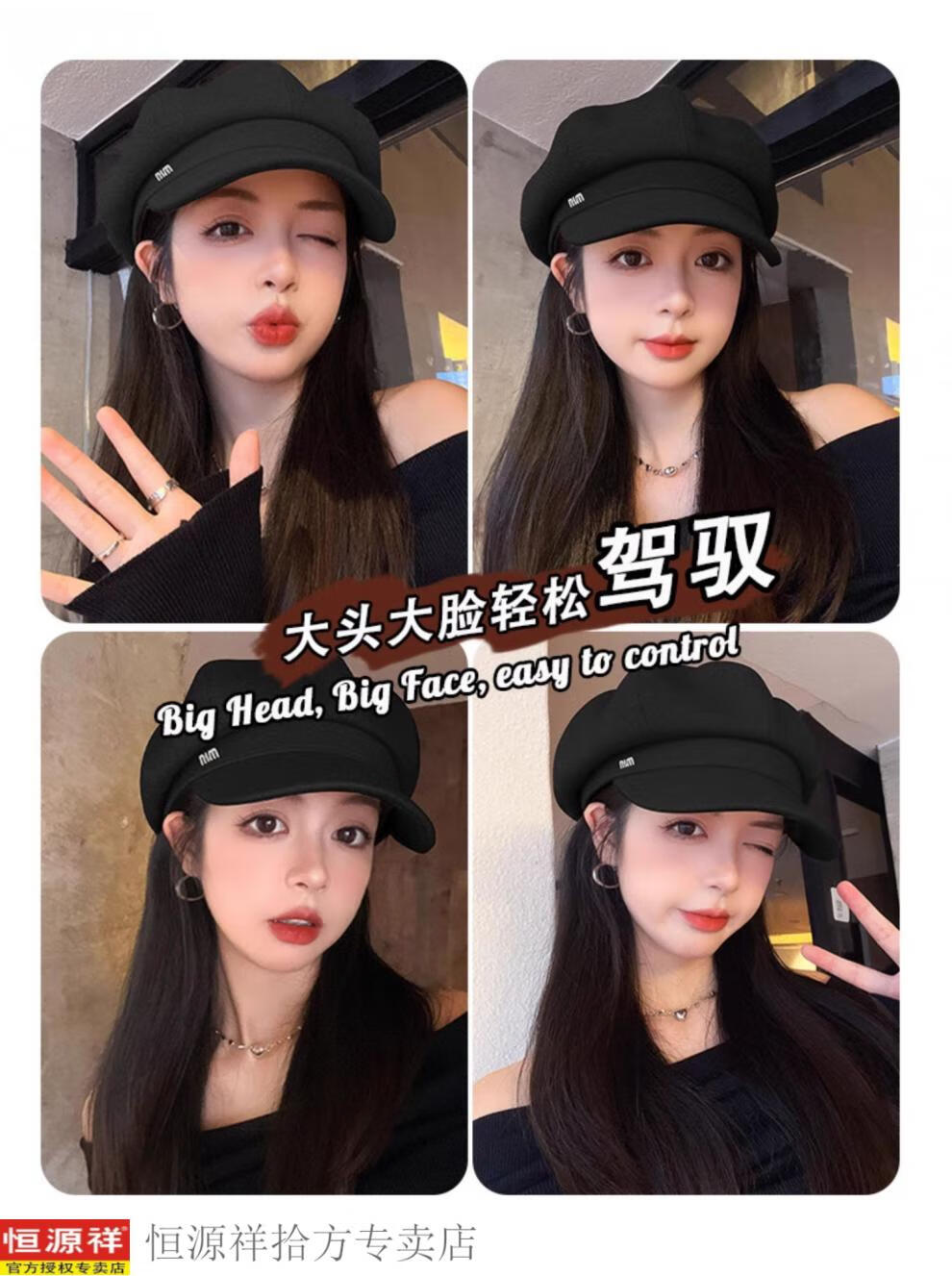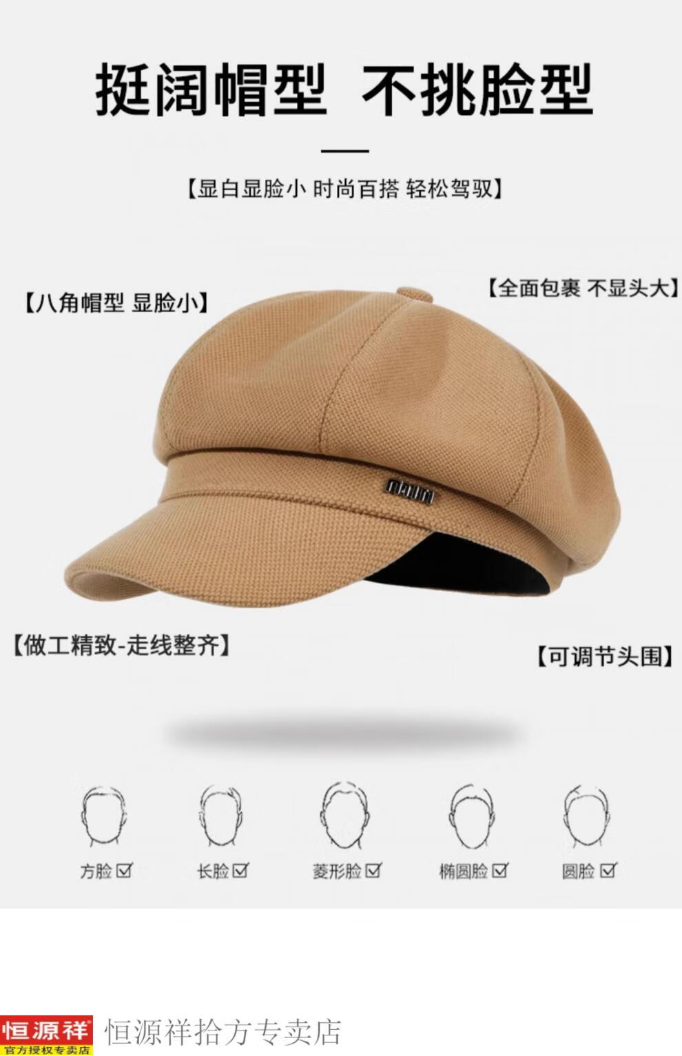 Hengyuanxiang's new beret for women in autumn and winter, small duck tongue, octagonal hat, large head circumference, French retro black newsboy hat, trendy black M, one size fits all, adjustable (54-58c)