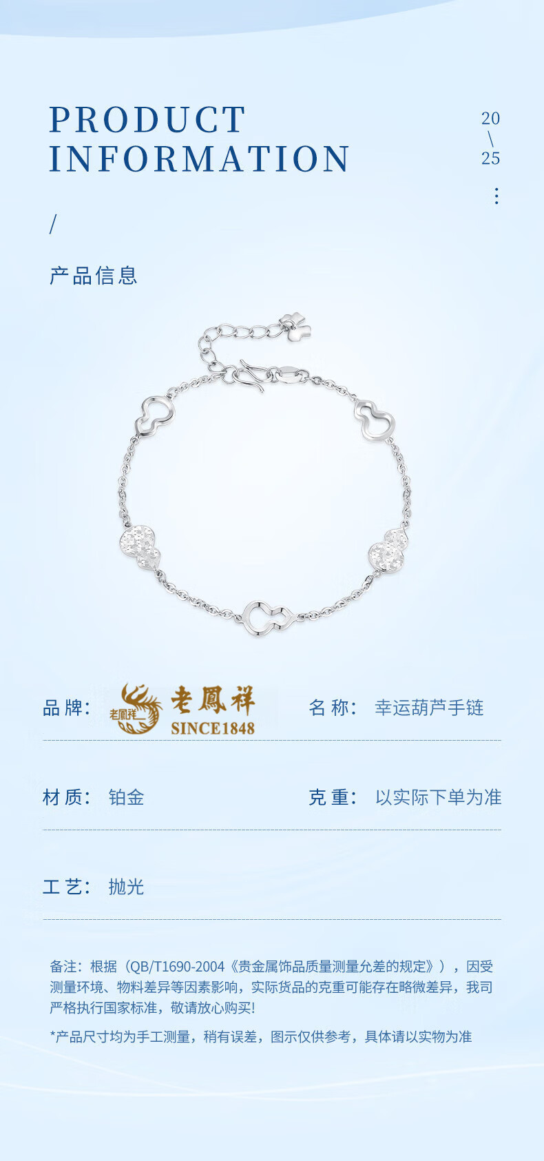 Lao Fengxiang pt950 platinum bracelet for women, platinum lucky gourd chain bracelet, Valentine's Day birthday gift for girlfriend and wife, platinum lucky gourd bracelet, about 6g, brand gift box