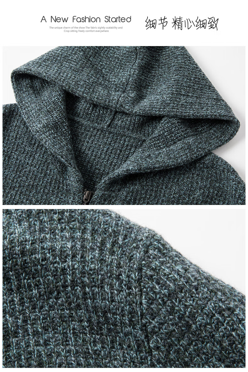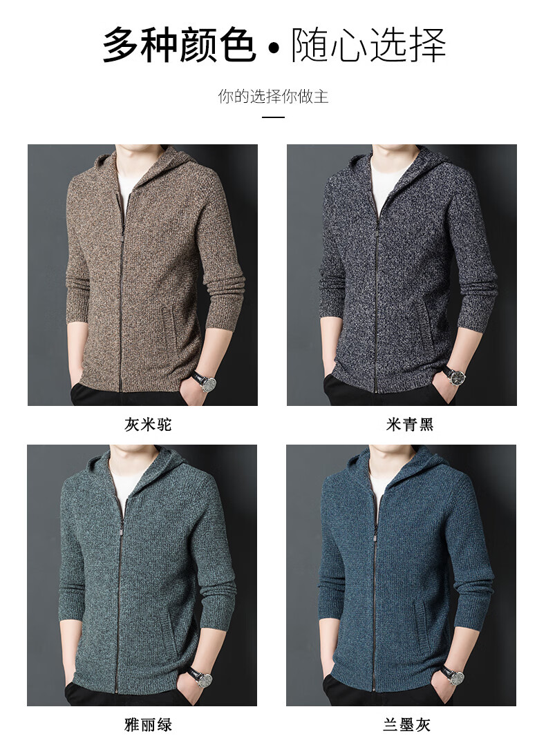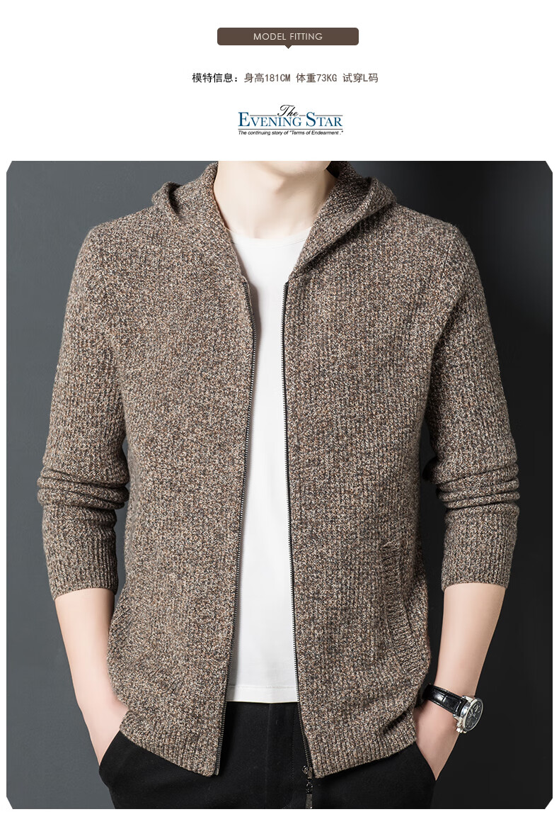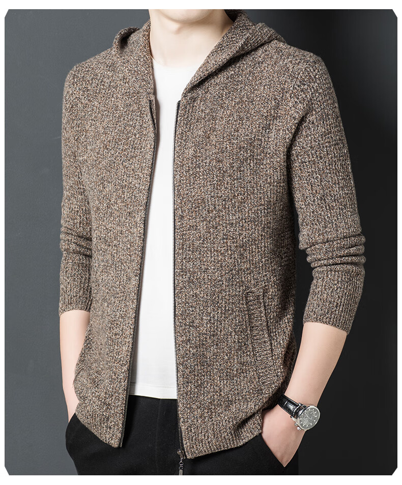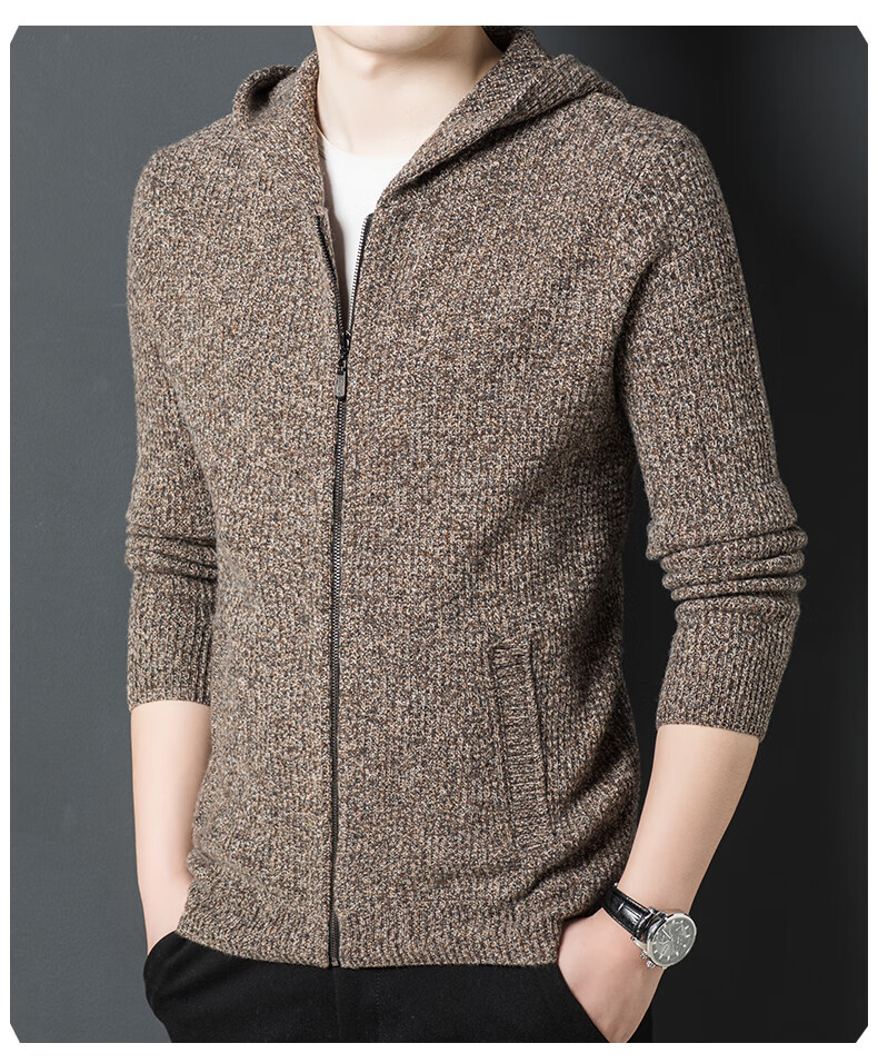 Hengyuanxiang New Pure Wool Cashmere Cardigan Men's Hooded Autumn and Winter Thick Cotton Wool Jacket 2025 Worsted Knitted Sweater Men Gray Rice Camel XL /175