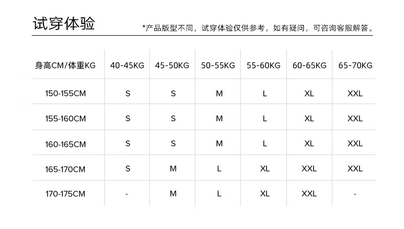 China (cm) 165 / 88-90 170 / 96-98 175 / 108-110 180 / 118-122 185 / 126-130