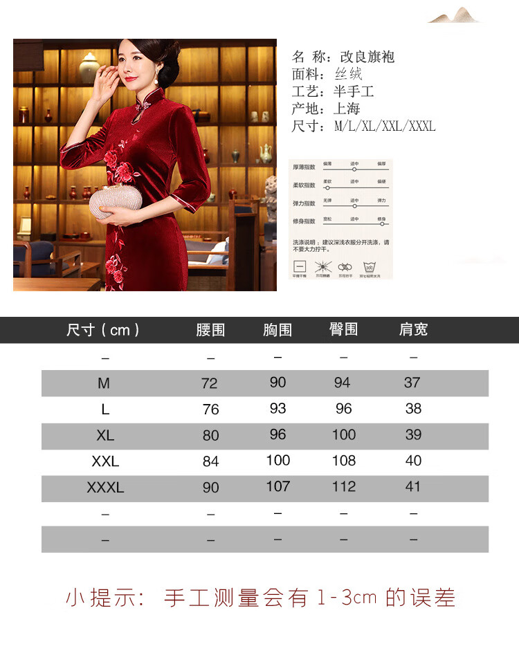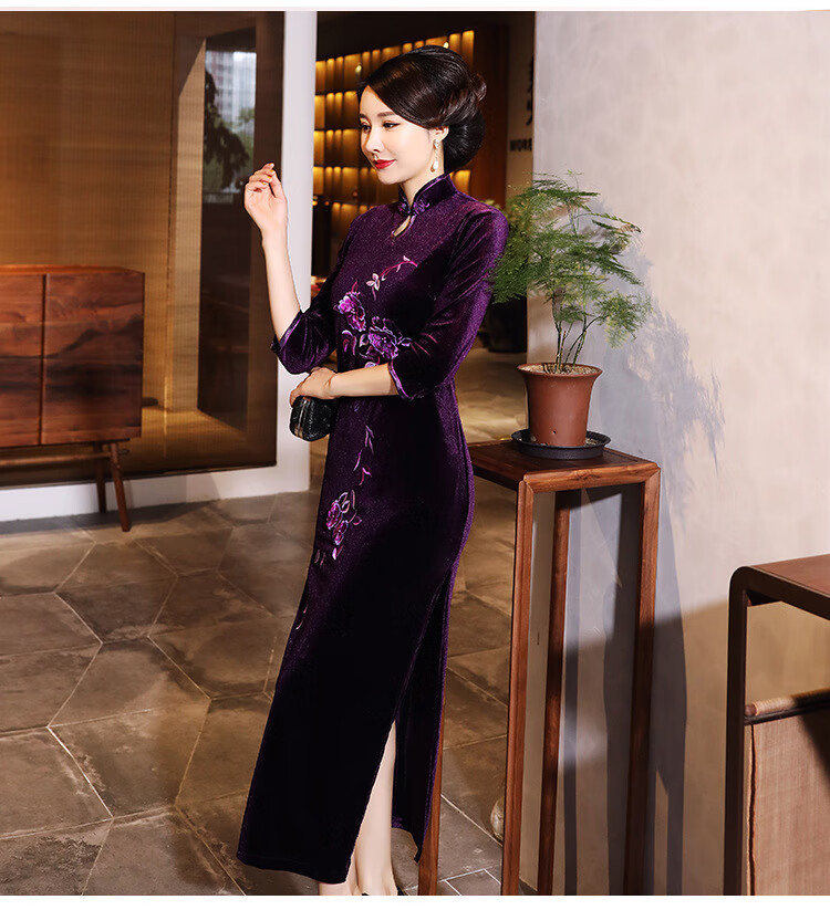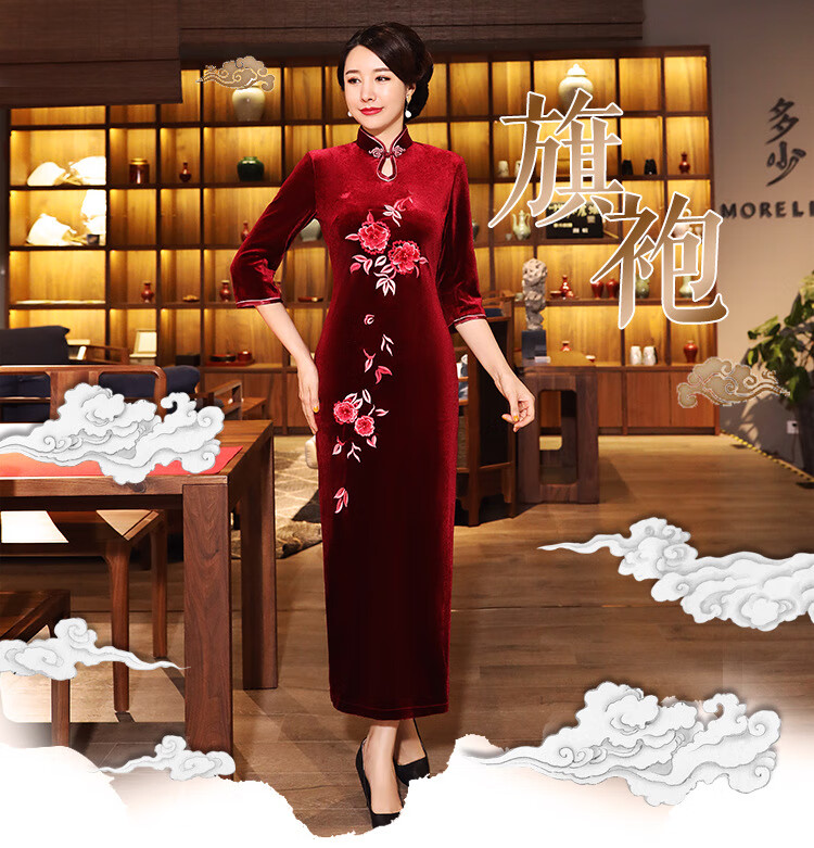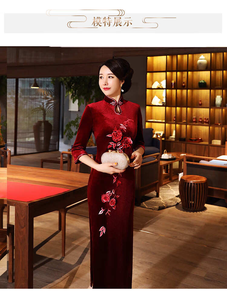 New autumn and winter cheongsam velvet improved long embroidered performance clothes slim mother clothes daily wear new Chinese clothes blue T0063-A M recommended 90-100Jin Jin equals 0.5 kg