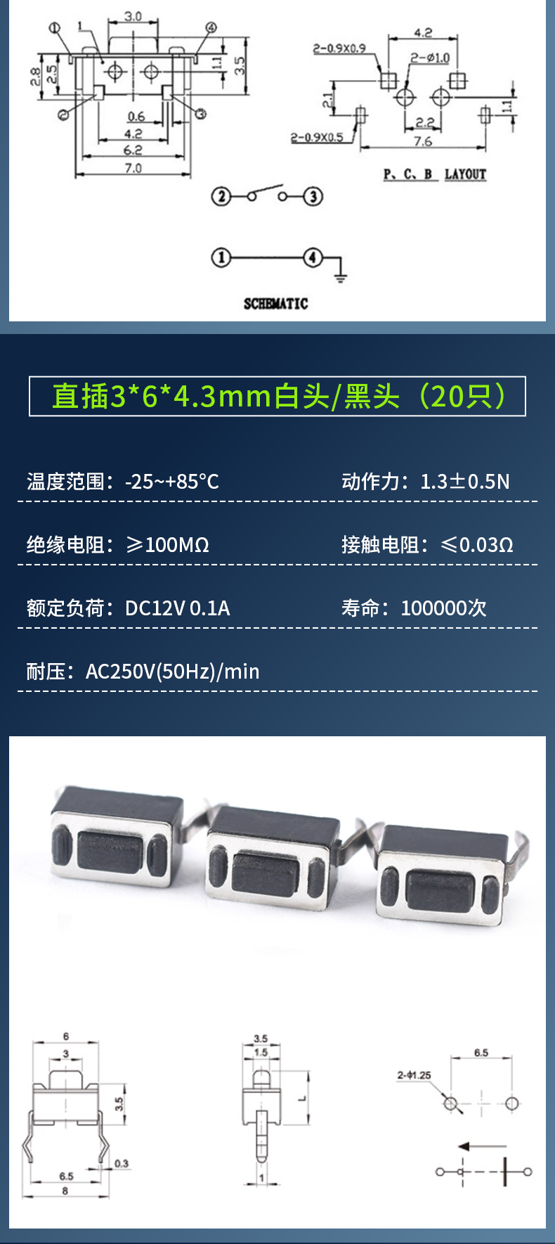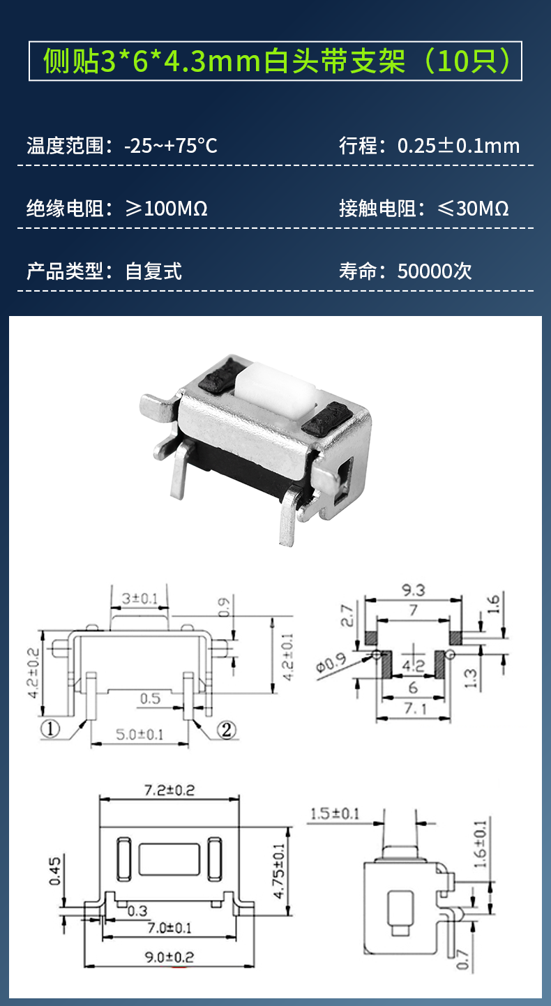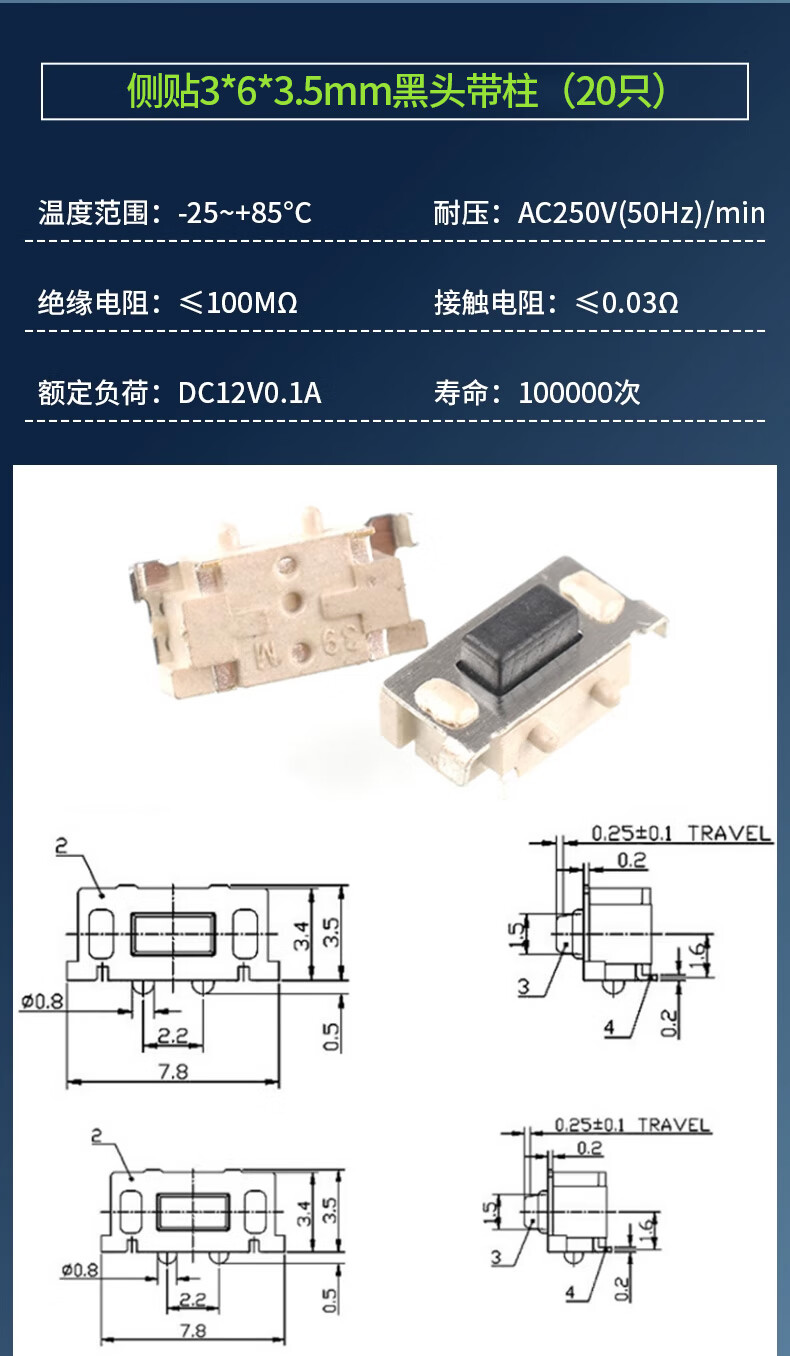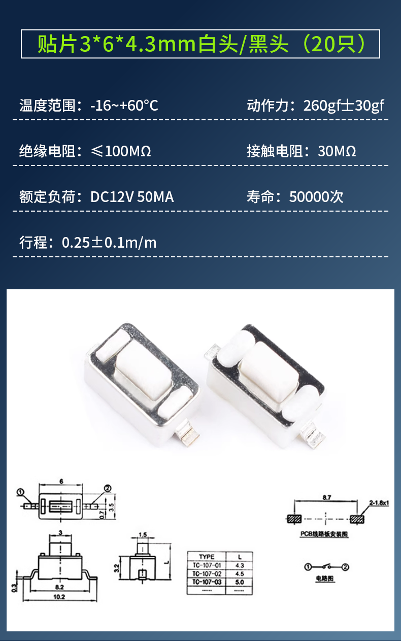 3*6*4.3/5/7/2.5/3.5MM light touch button micro switch patch straight plug side with bracket side 2 pins straight plug 3*6*4.3mm white head (20 pieces) No Specifications