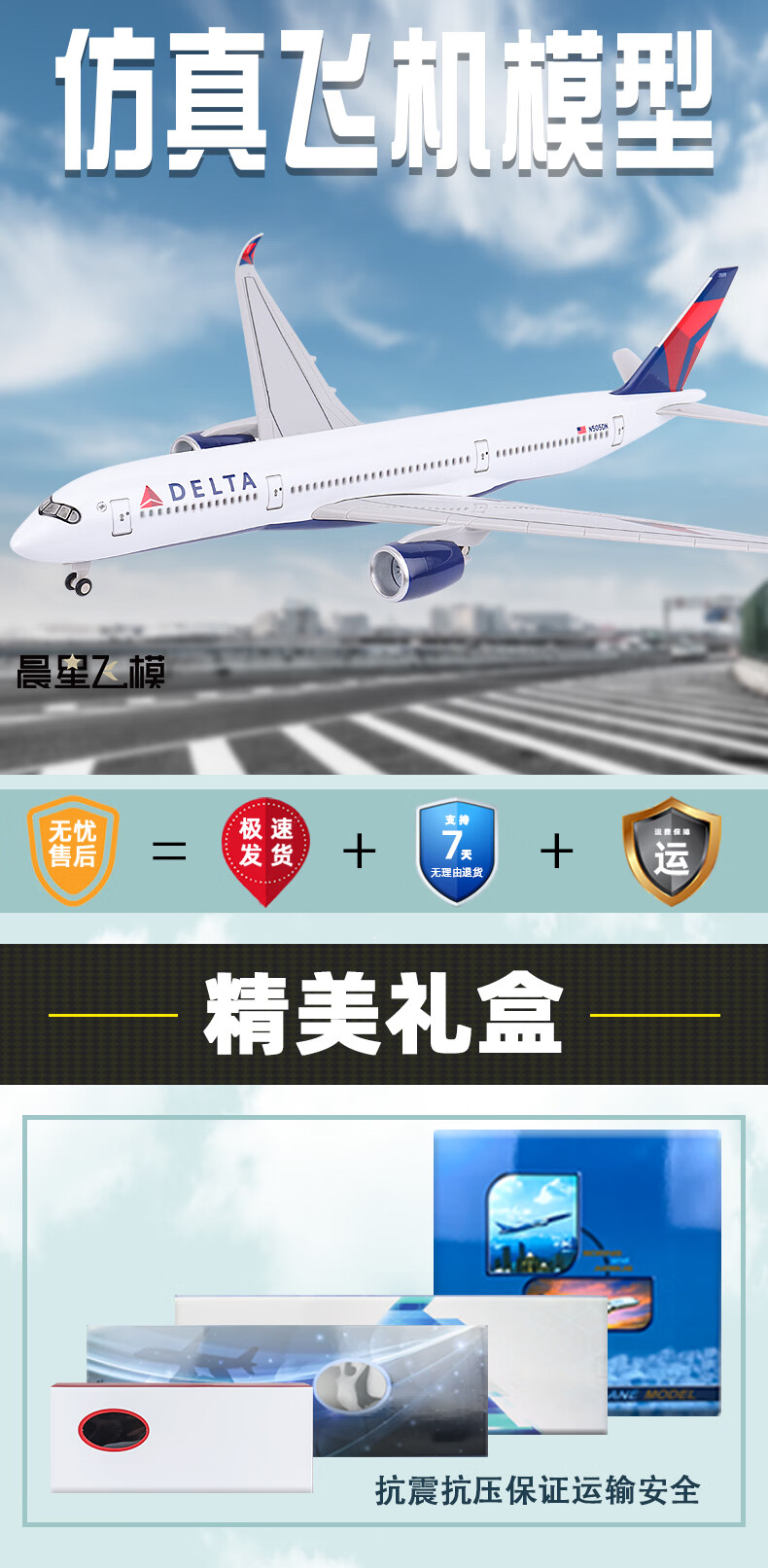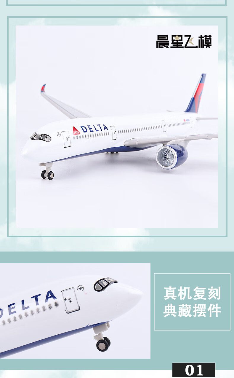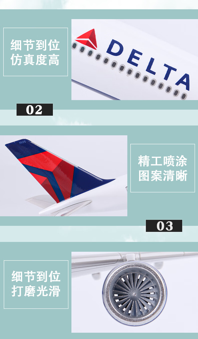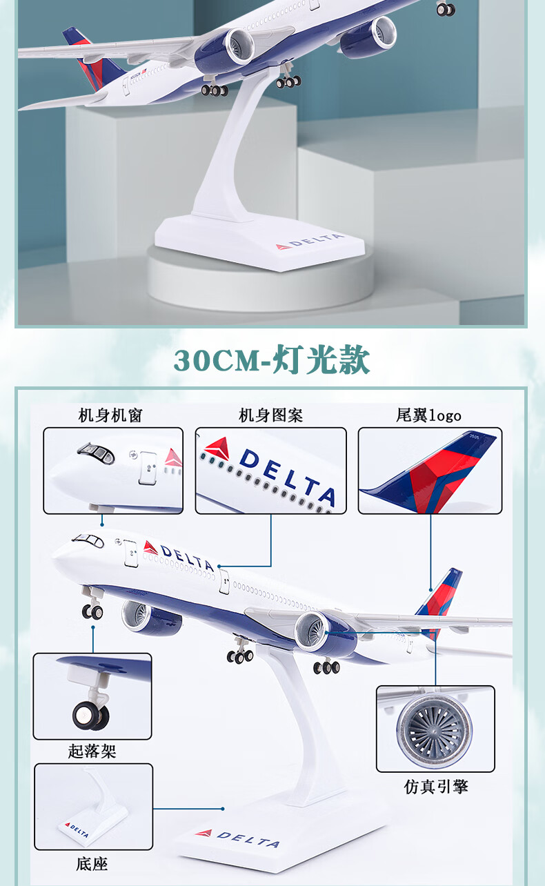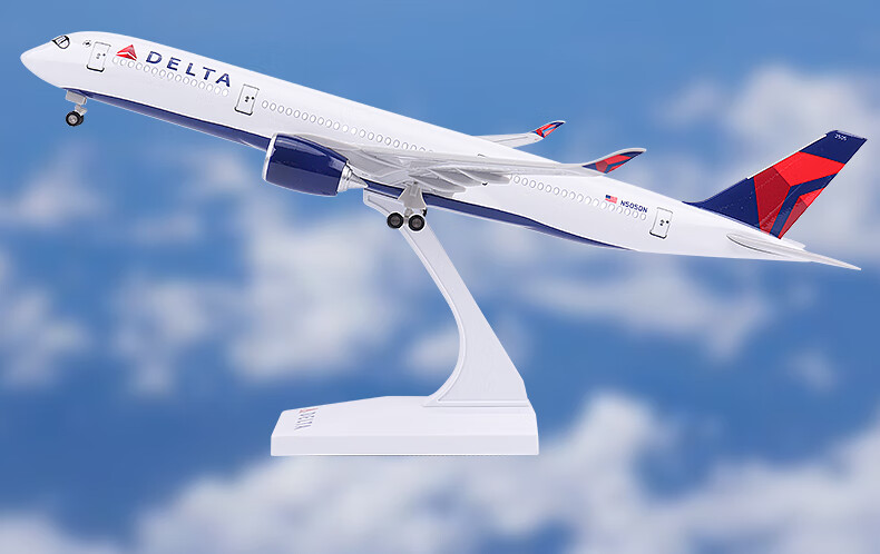 Junmin Delta Airlines A350 aircraft model simulation passenger aircraft with lights and landing gear static ornaments gift collection 30CM with wheels and lights Delta Airlines A350