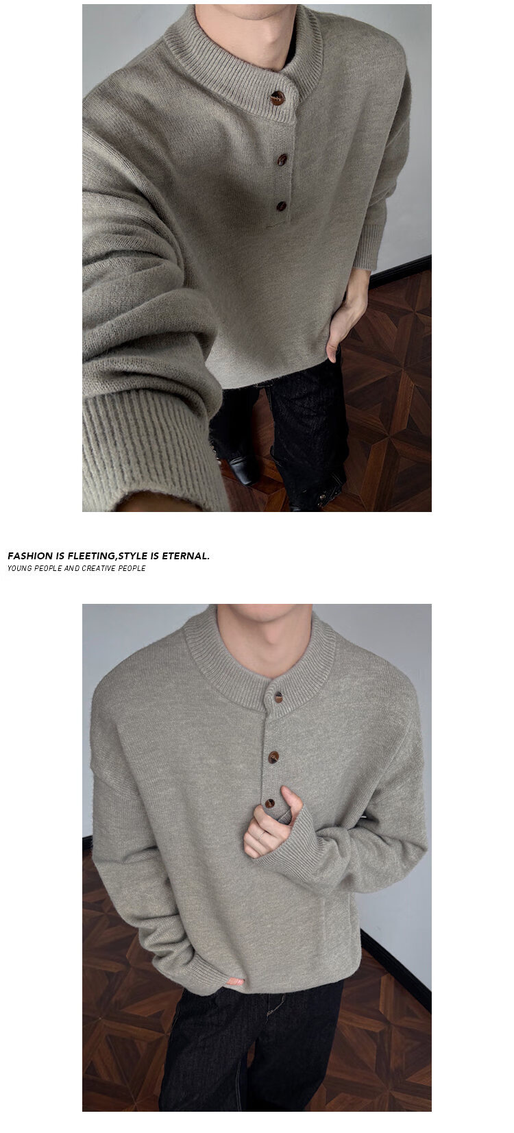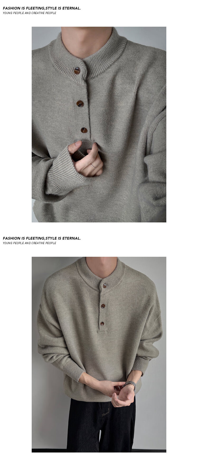 Yilunhe Gray Henley Collar Sweater Men's Autumn and Winter Premium American Retro Bottoming Shirt Cleanfit Knitted Sweater Floral Gray XL