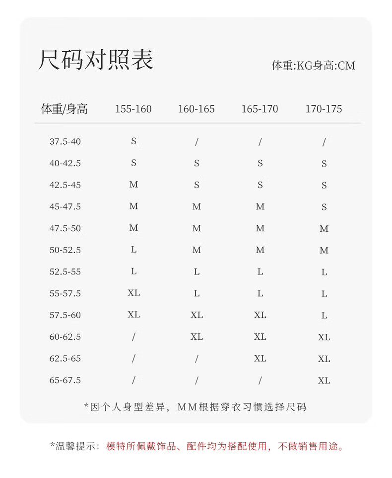 China (cm) 160-165/84-86 165-170 / 88-90 167-172 / 92-96 168-173 / 98-102 170-176 / 106-110
