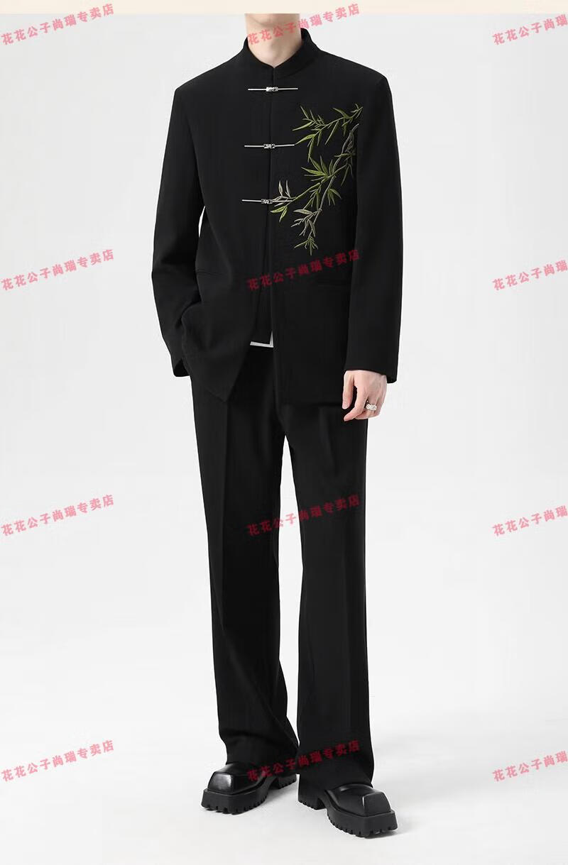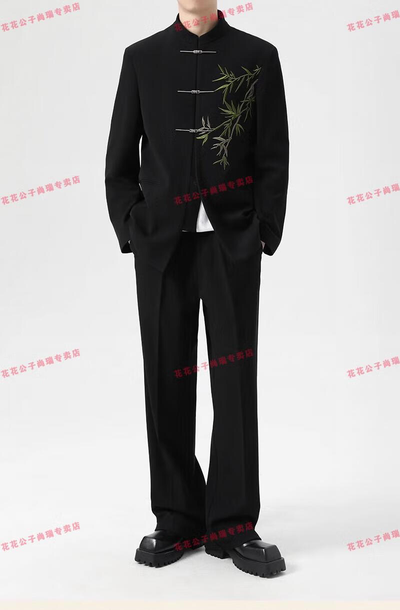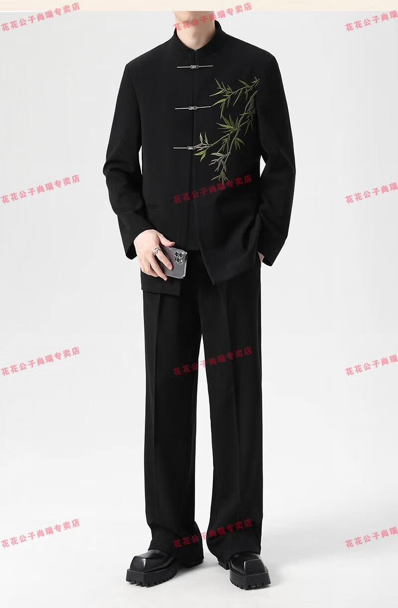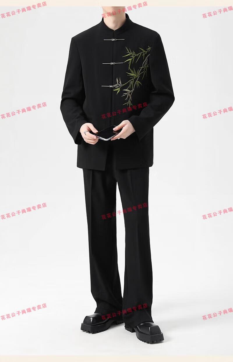 Playboy New Chinese Style National Style Casual Suit Suit for Men Spring and Autumn Chinese Style Embroidered Mao Suit Hanfu Men's Clothes Black Jacket + Tailor-made Pants Two-piece Set L High Quality