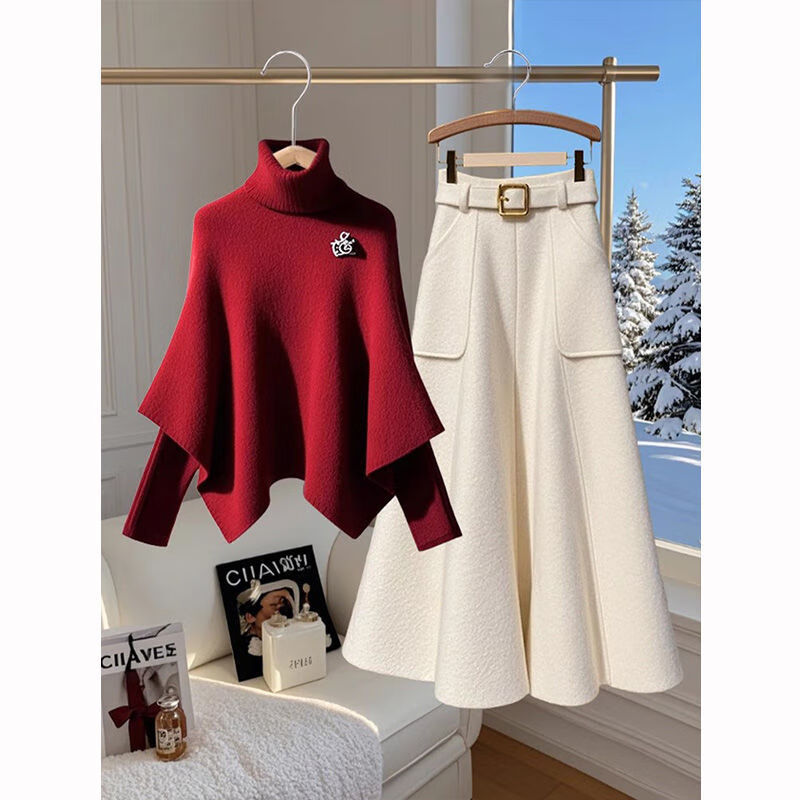 Hengyuanxiang autumn and winter complete set of 2025 new temperament and high-end Christmas turtleneck cape sweater skirt two-piece suit red sweater + white skirt 2XL recommended 125-140Jin Jin equals 0.5 kg