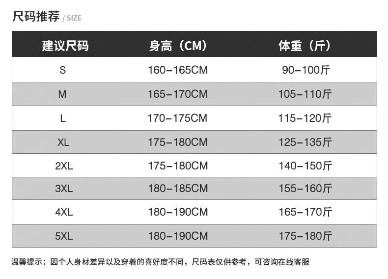 China (cm) 165 / 88-90 170 / 96-98 175 / 108-110 180 / 118-122 185 / 126-130