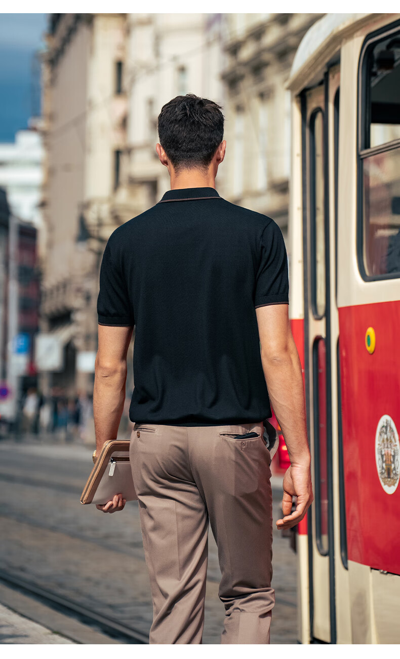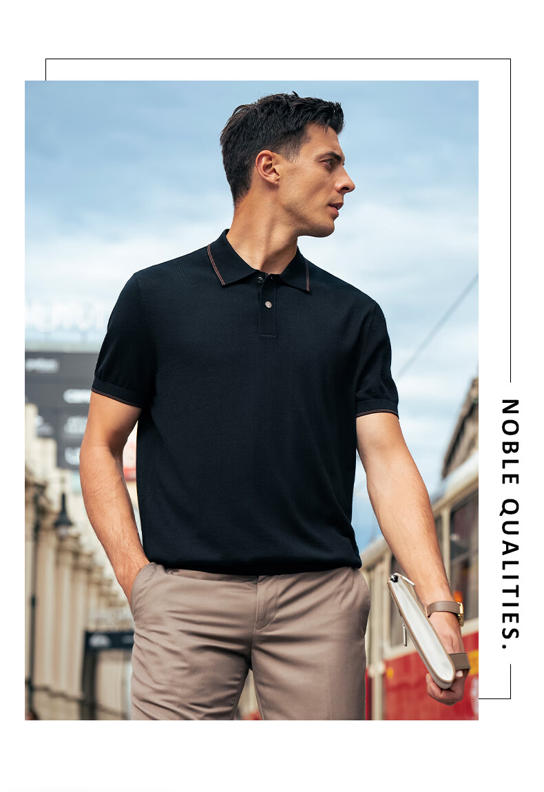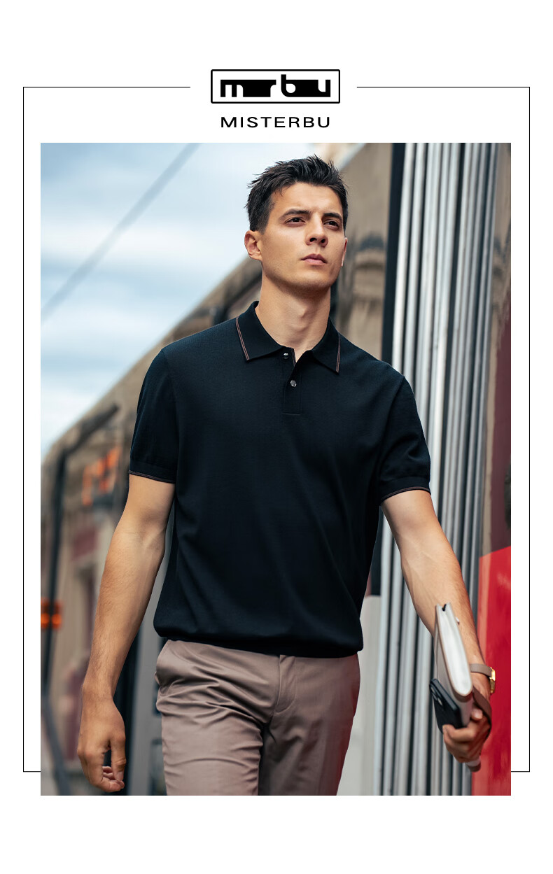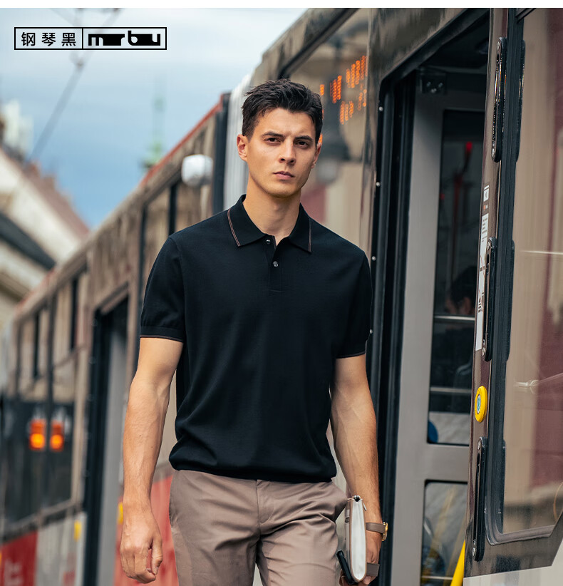 Mr. Bu machine washable lapel cardigan T-shirt 2025 autumn new solid color business sweater short-sleeved bottoming shirt BT16888 piano black 2XL (185)