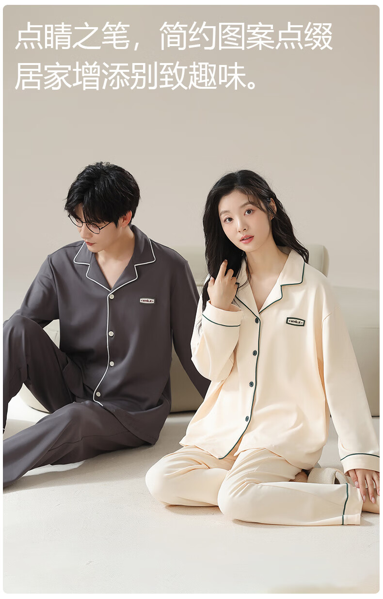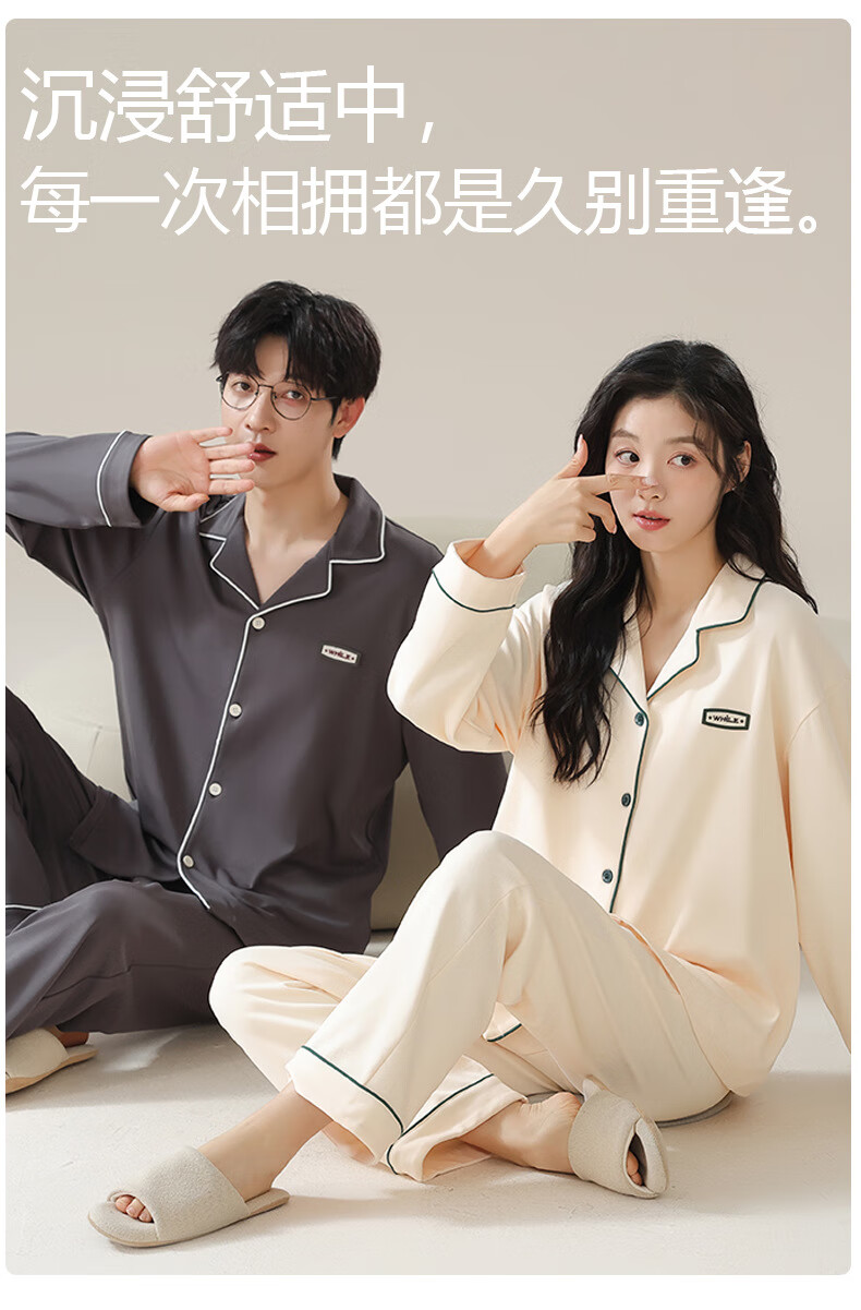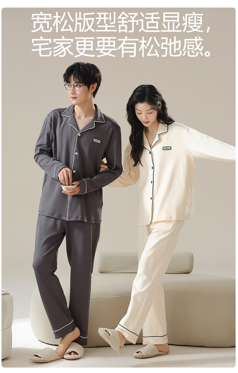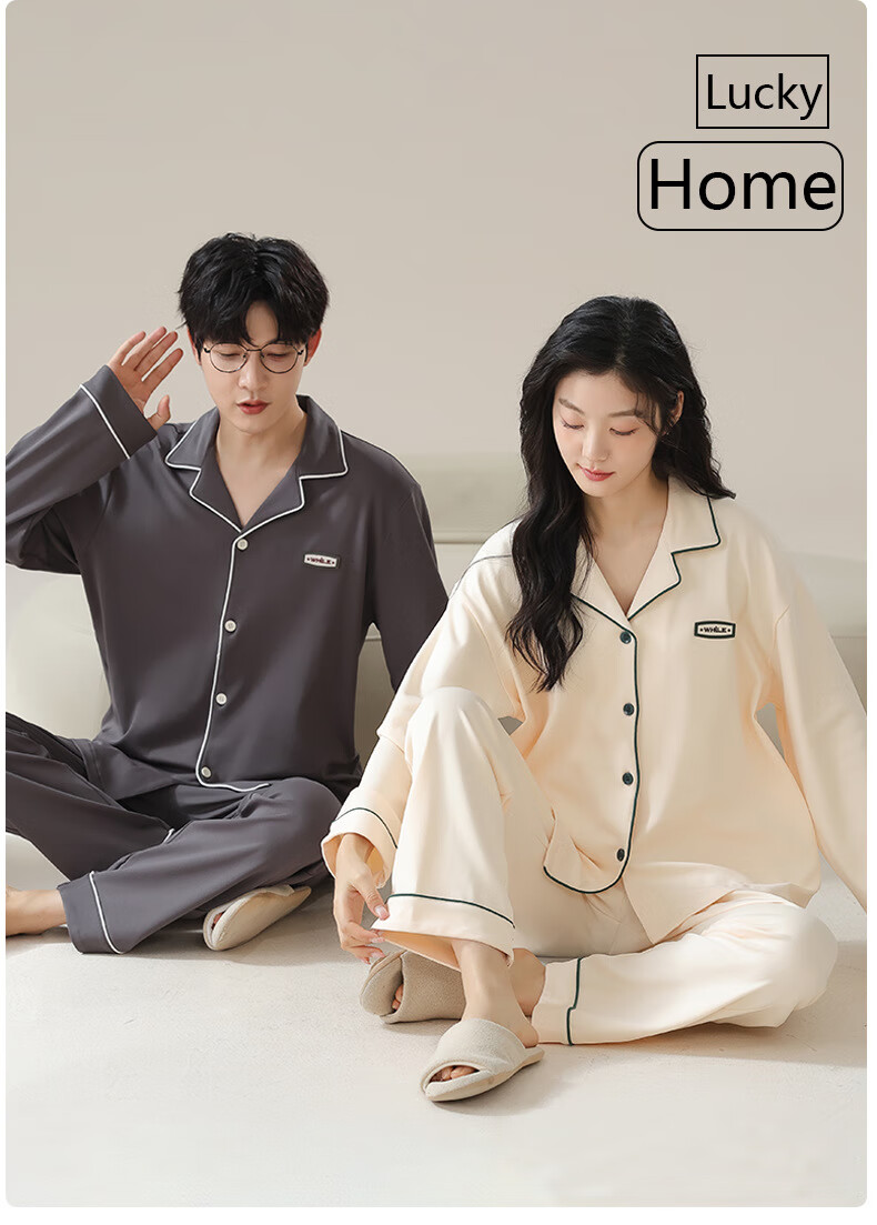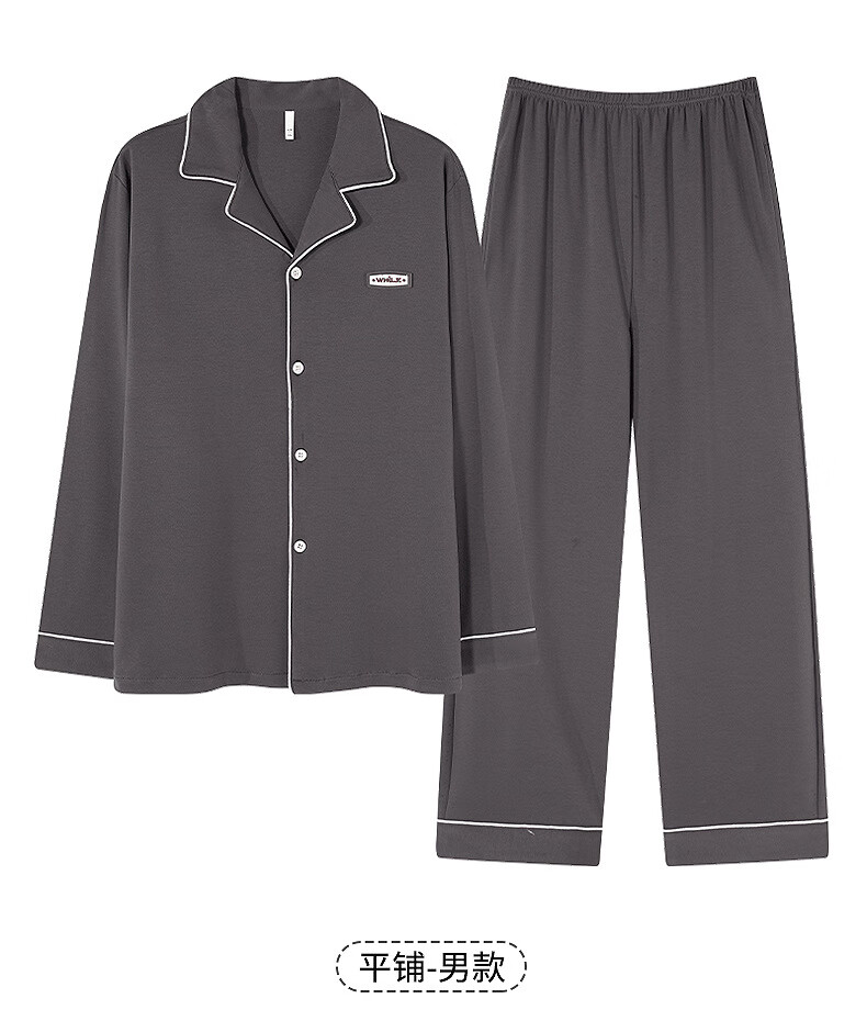 Xia Wa Zhi Xiu Couple Pajamas Pure Cotton Long Sleeves Spring and Autumn Style Women's Simple Casual Men's Comfortable Cardigan Cotton Home Clothes Set Z58330 Women's L