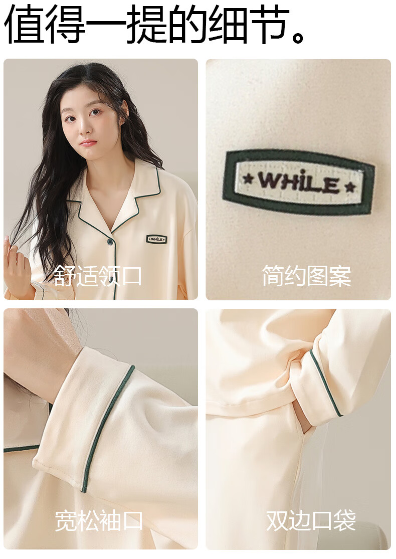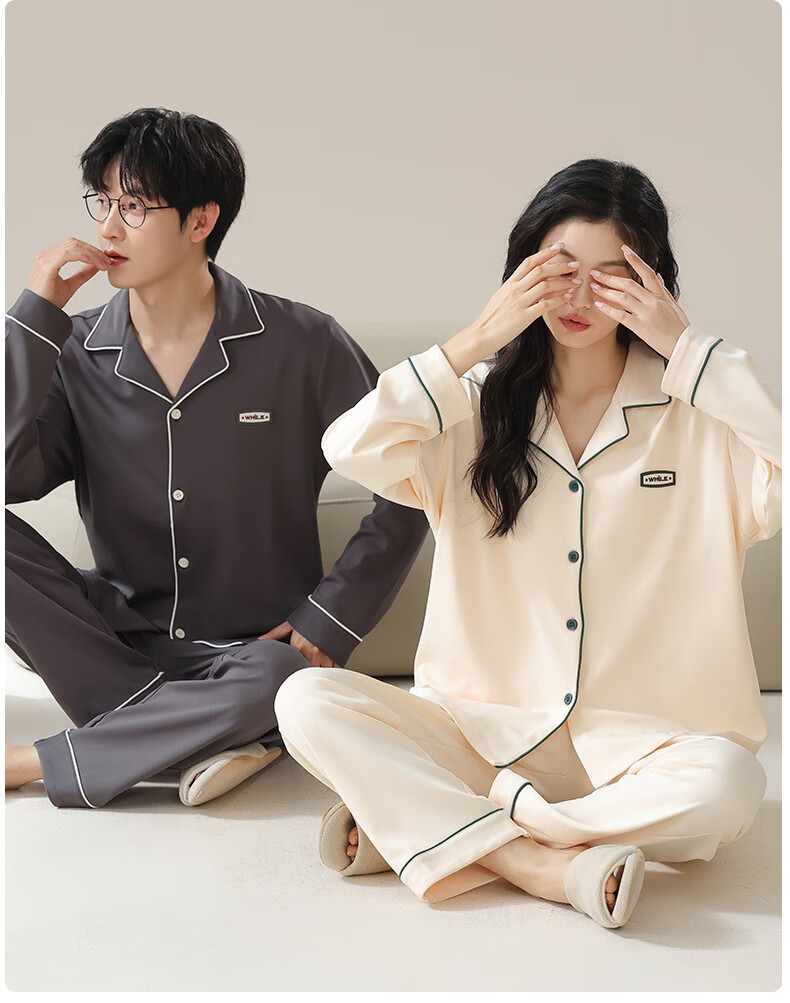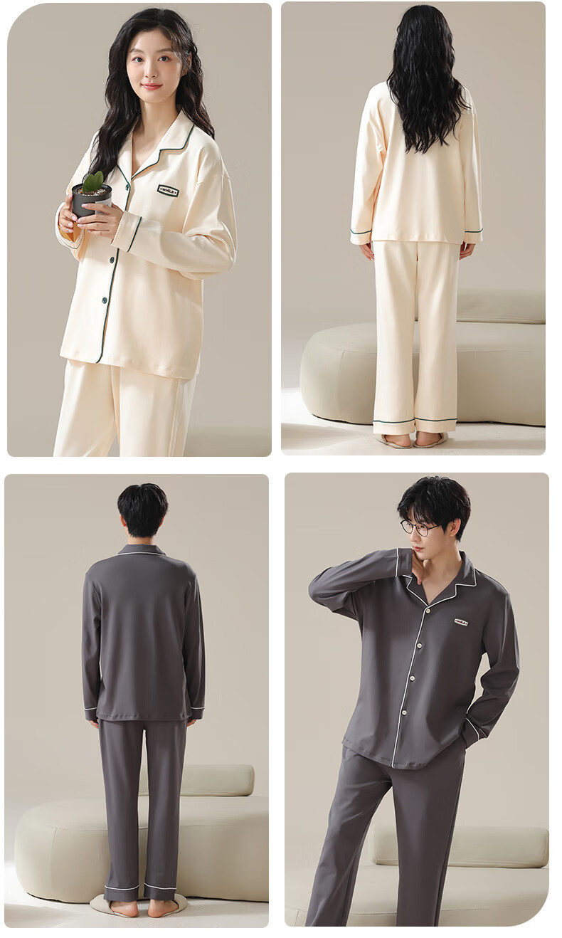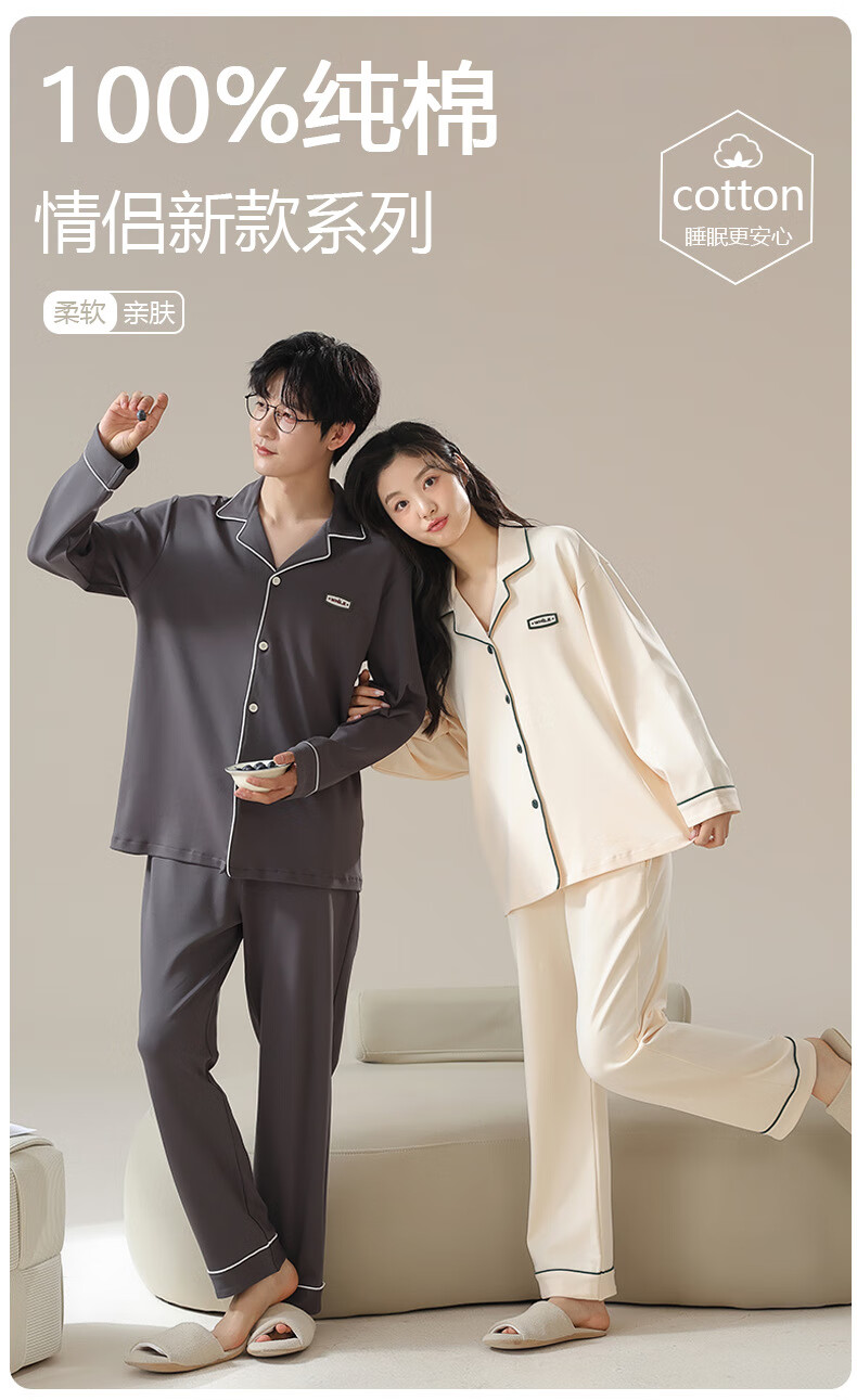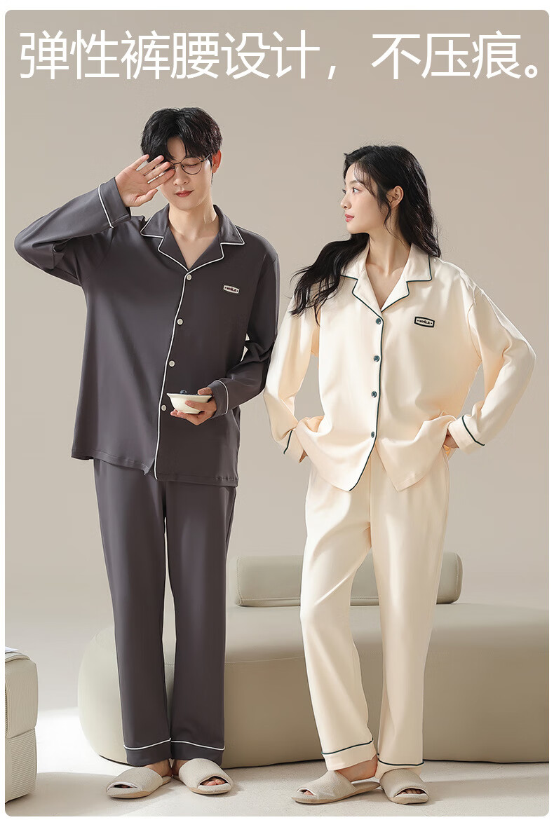 Xia Wa Zhi Xiu Couple Pajamas Pure Cotton Long Sleeves Spring and Autumn Style Women's Simple Casual Men's Comfortable Cardigan Cotton Home Clothes Set Z58330 Women's L
