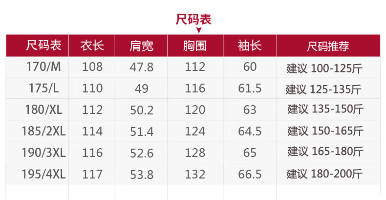 China (cm) 165 / 88-90 170 / 96-98 175 / 108-110 180 / 118-122 185 / 126-130