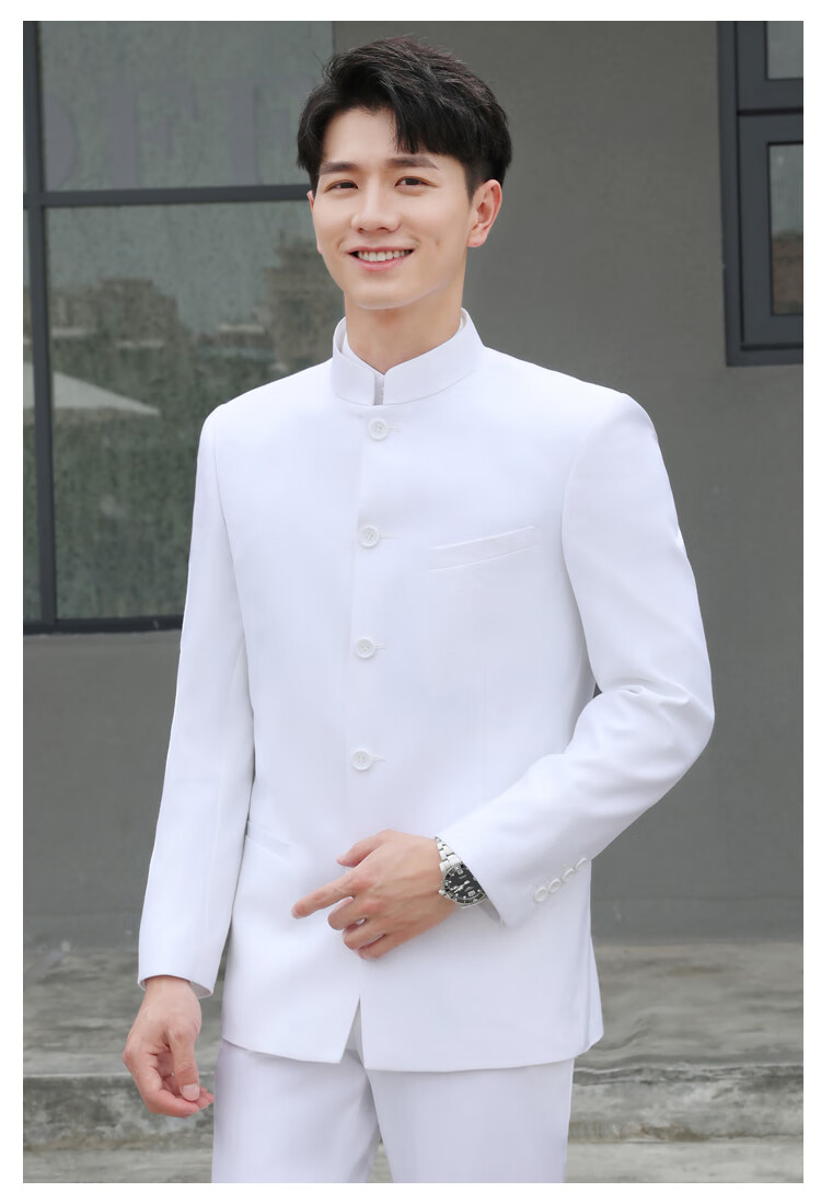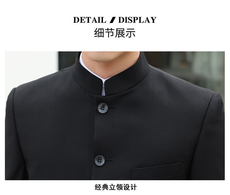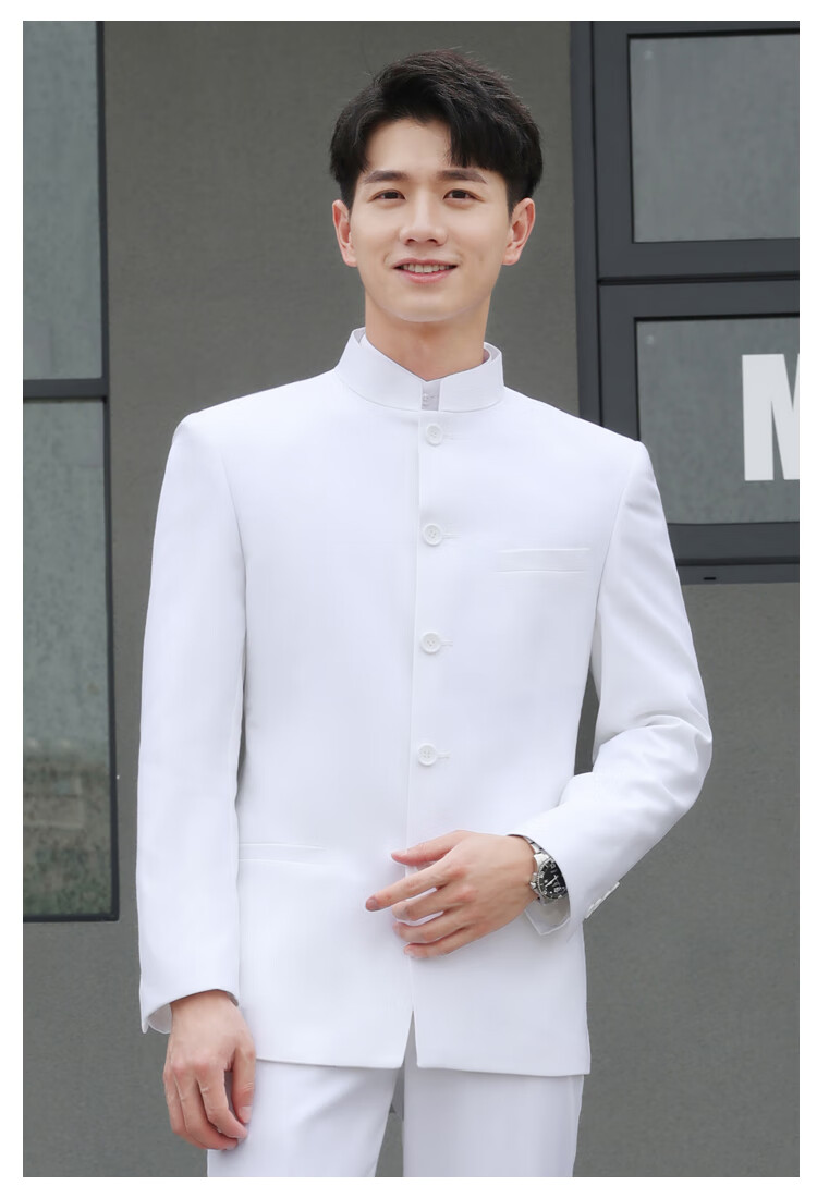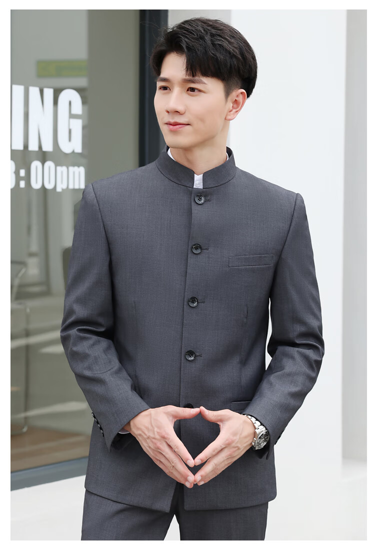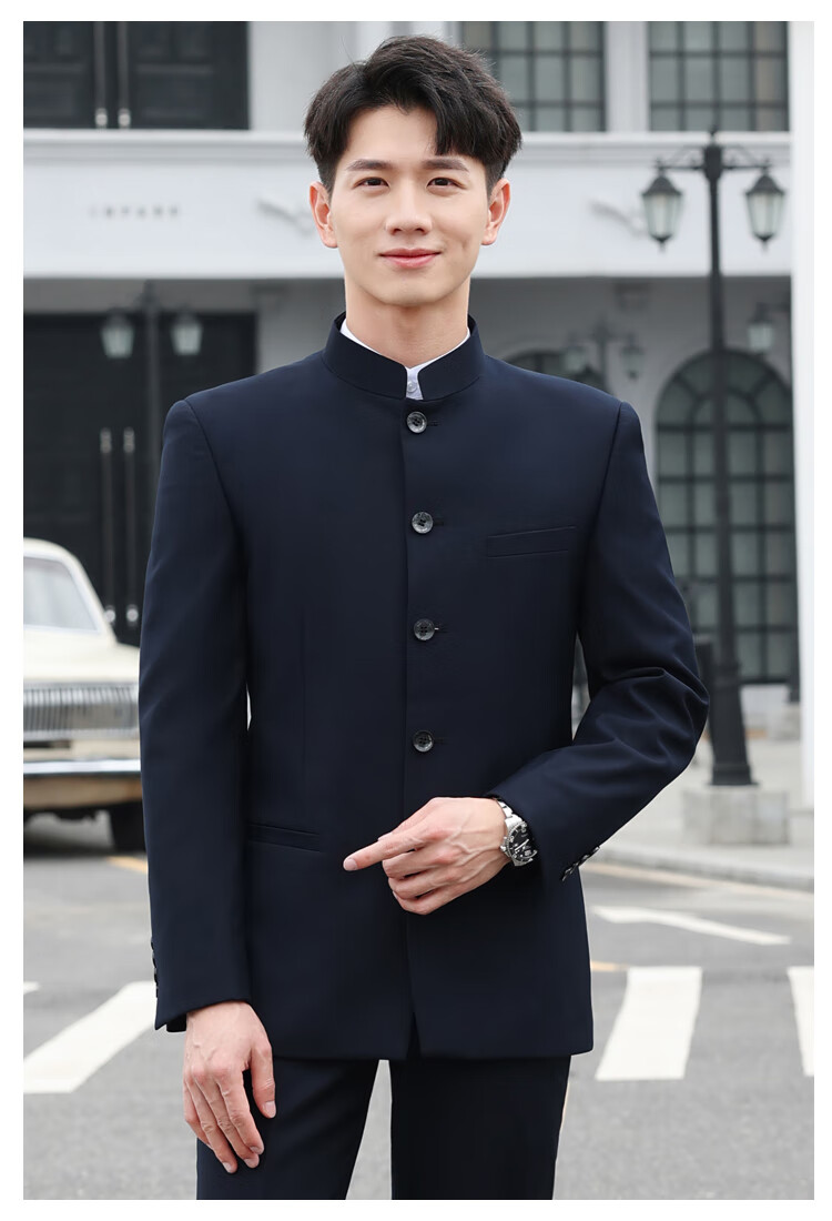 Luo Meng tunic suit men's youth slim Chinese stand collar suit new Chinese style wedding dress Chinese style Tang clothes navy blue top + pants 3XL recommended 150-165Jin Jin equals 0.5 kg