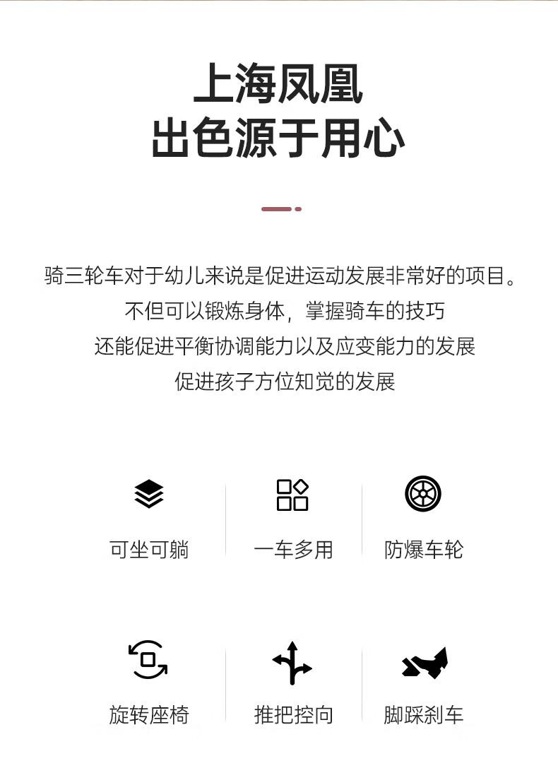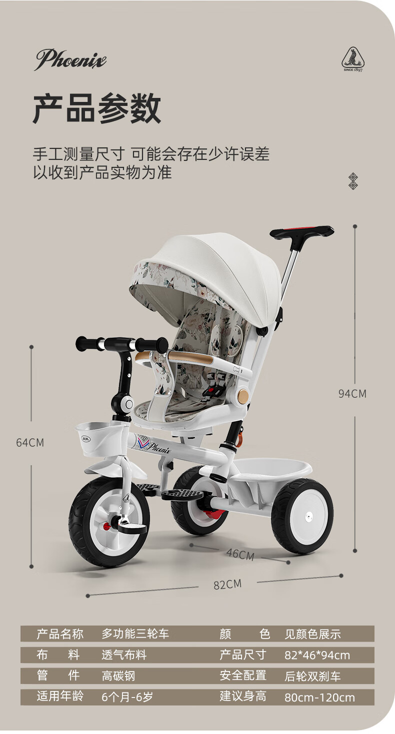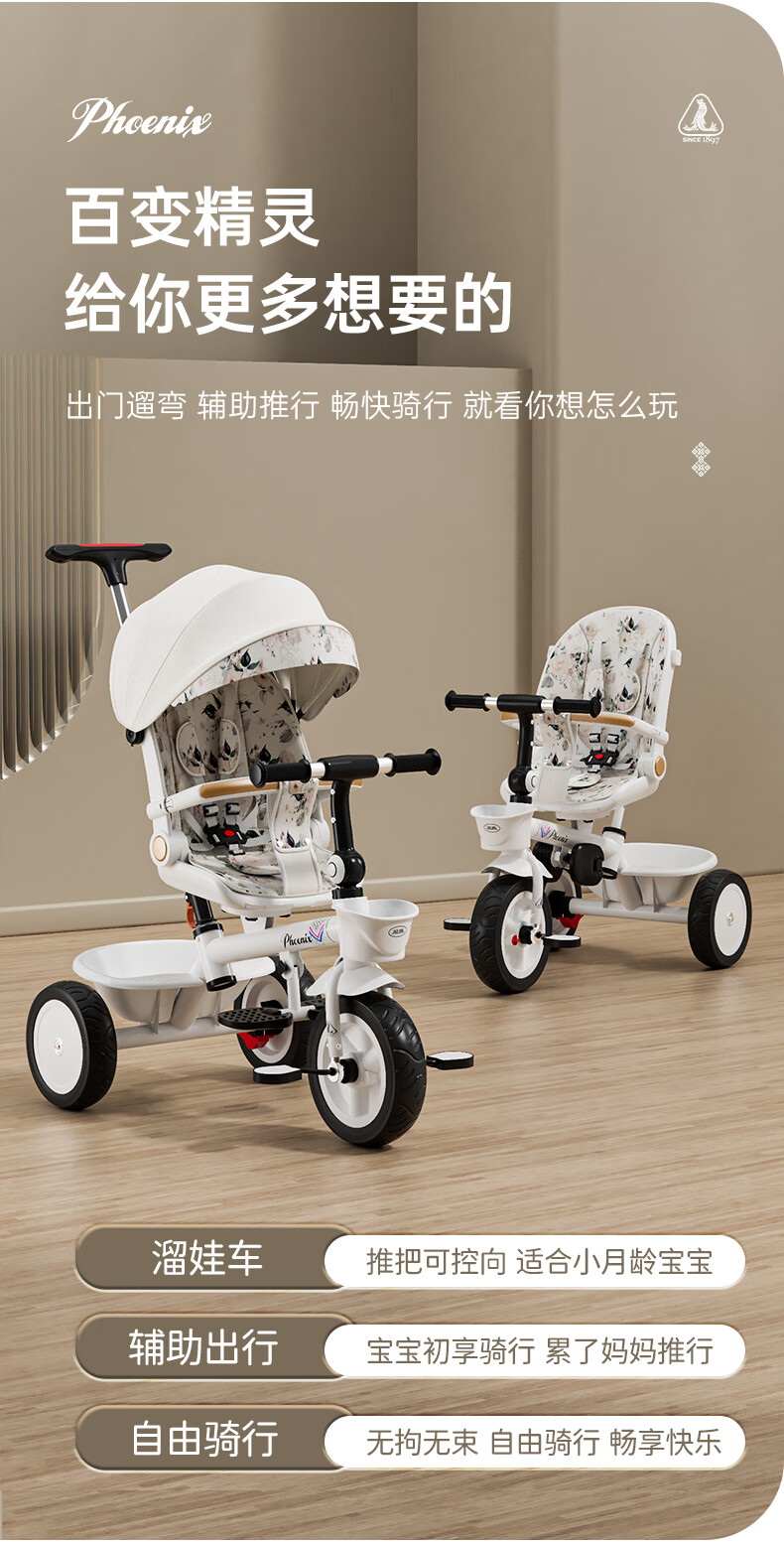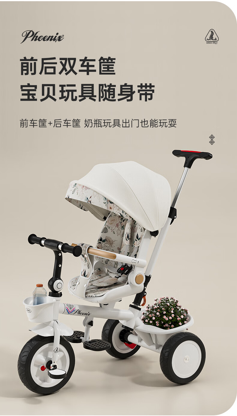 Phoenix children's tricycle bicycle 1-3-6 years old large baby stroller baby bicycle D Phoenix champagne color reclining sunshade footrest dinner plate