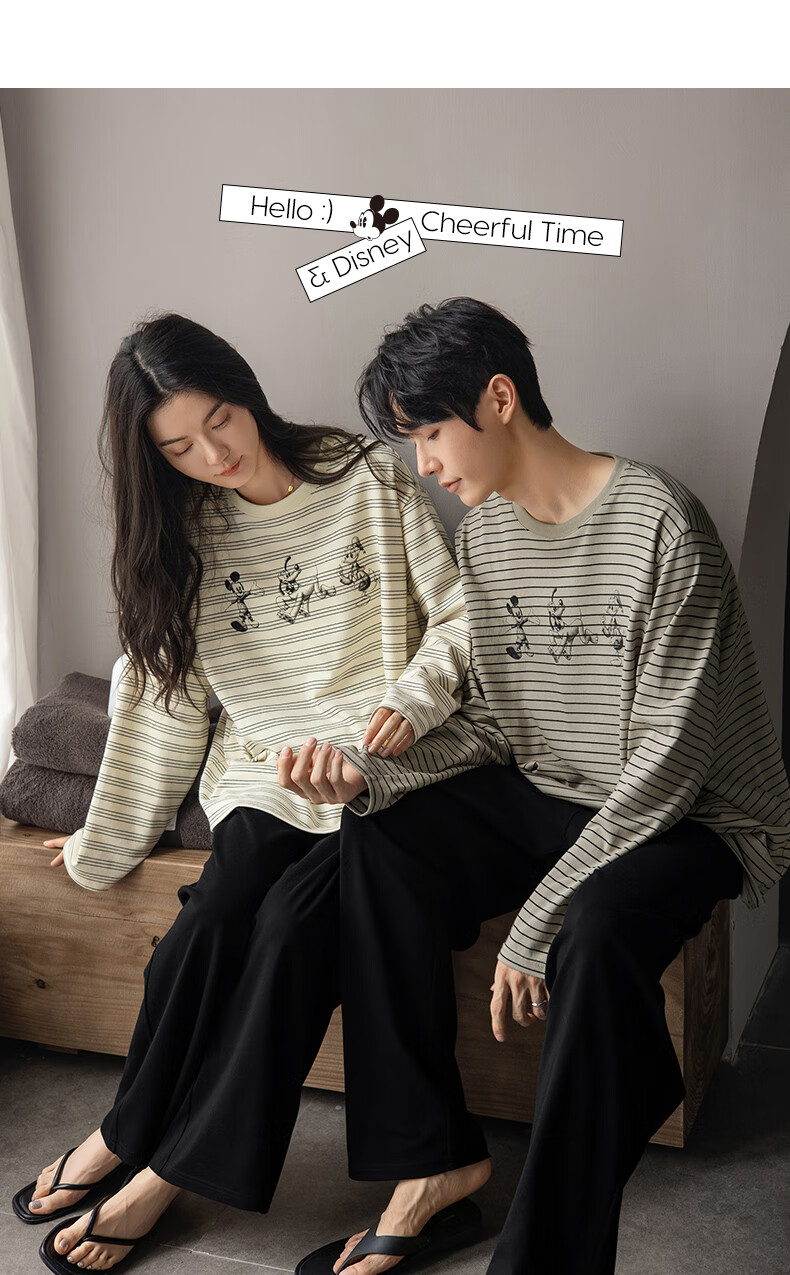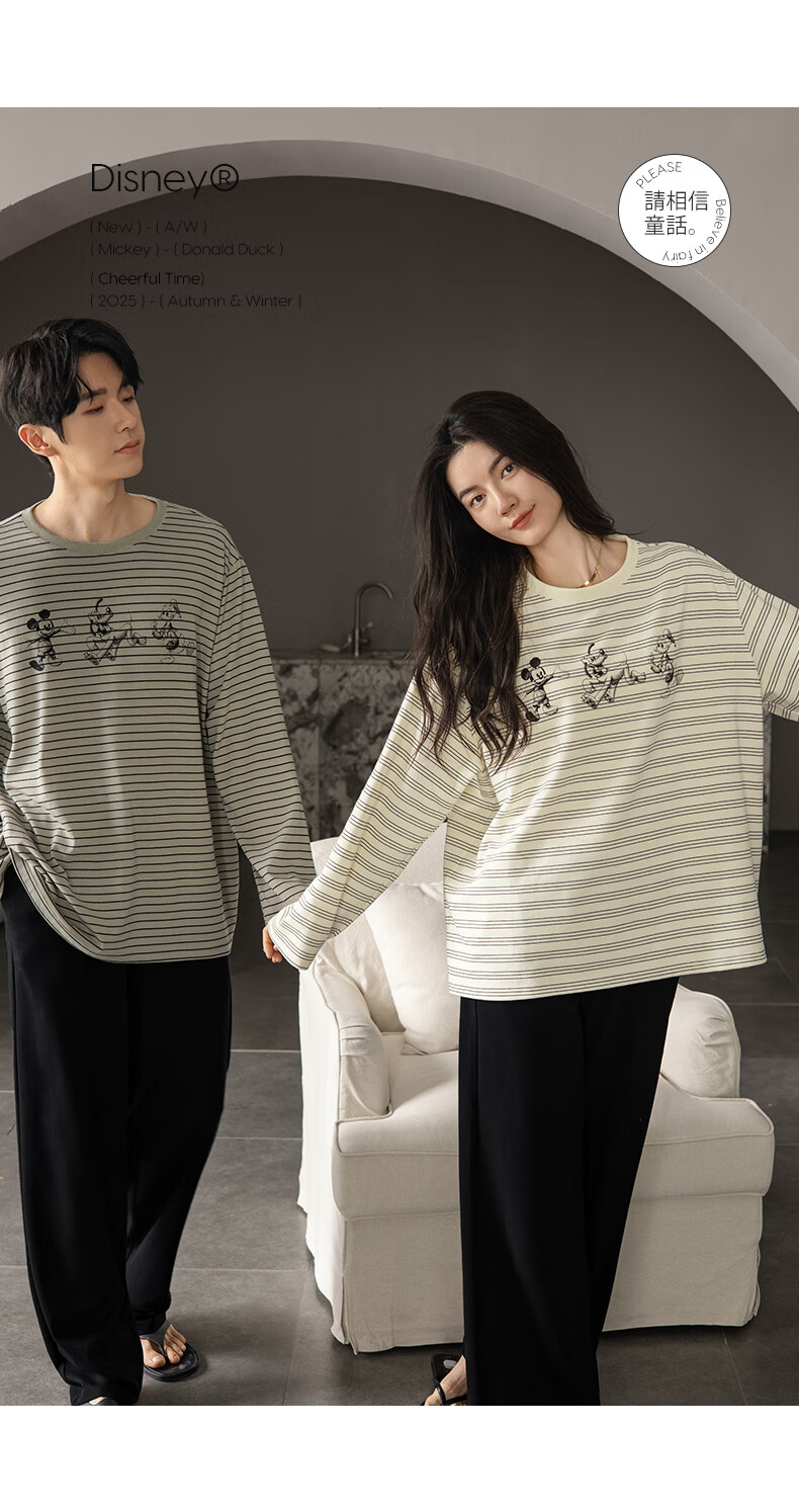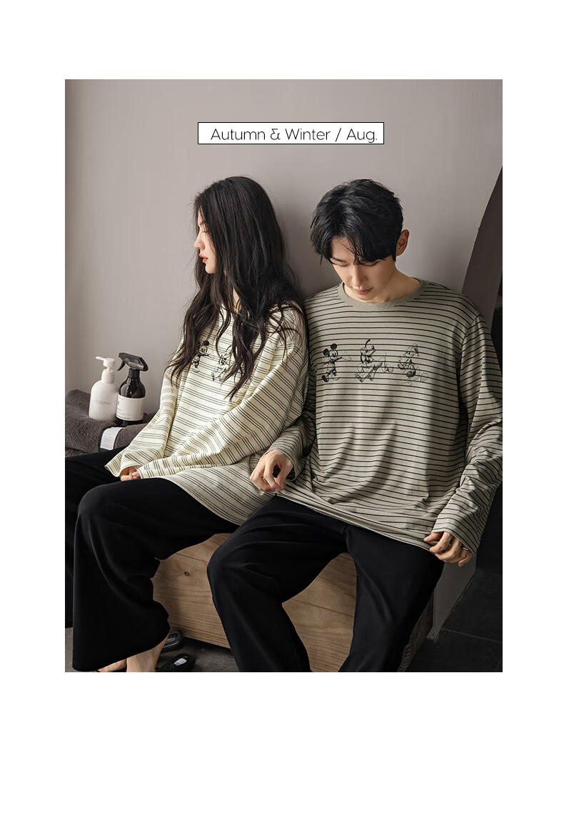 Beiyan couple pajamas for men and women new spring and autumn soft cotton long-sleeved large size suit cartoon striped home clothes can be worn outside C20967 Women's L