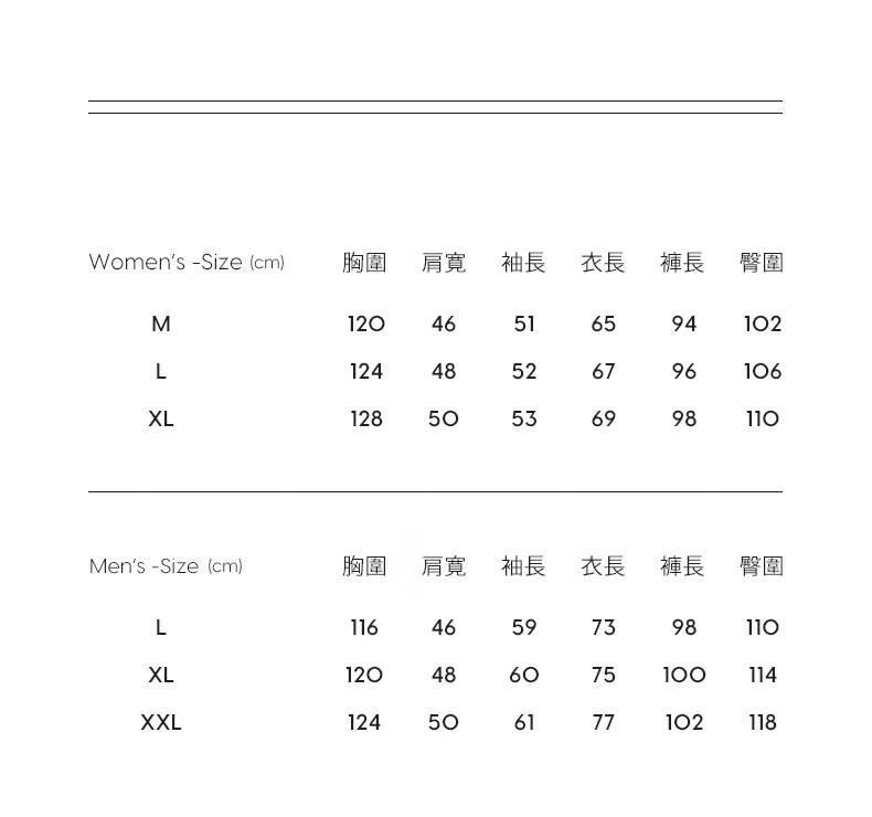 China (cm) 160-165/84-86 165-170 / 88-90 167-172 / 92-96 168-173 / 98-102 170-176 / 106-110