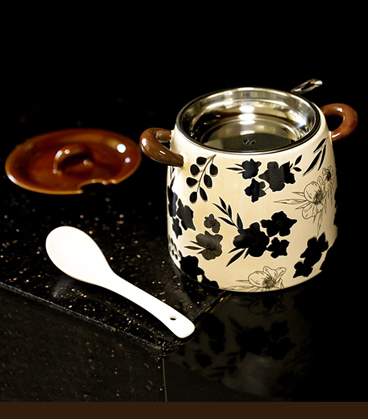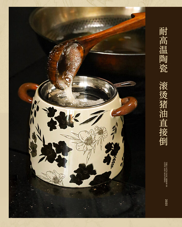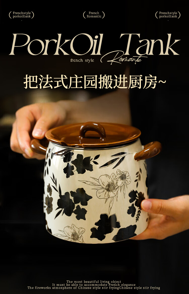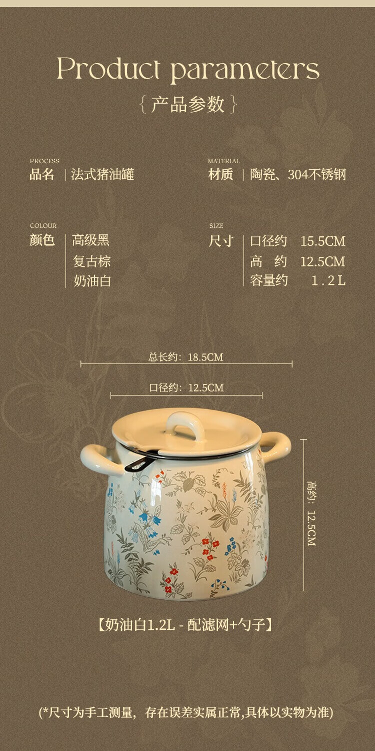 Sanmu Qinghe high-end ceramic lard oil tank large capacity high temperature resistant chili oil special tank national style storage tank household food grade ceramic cream white matching spoon + filter 1.2L