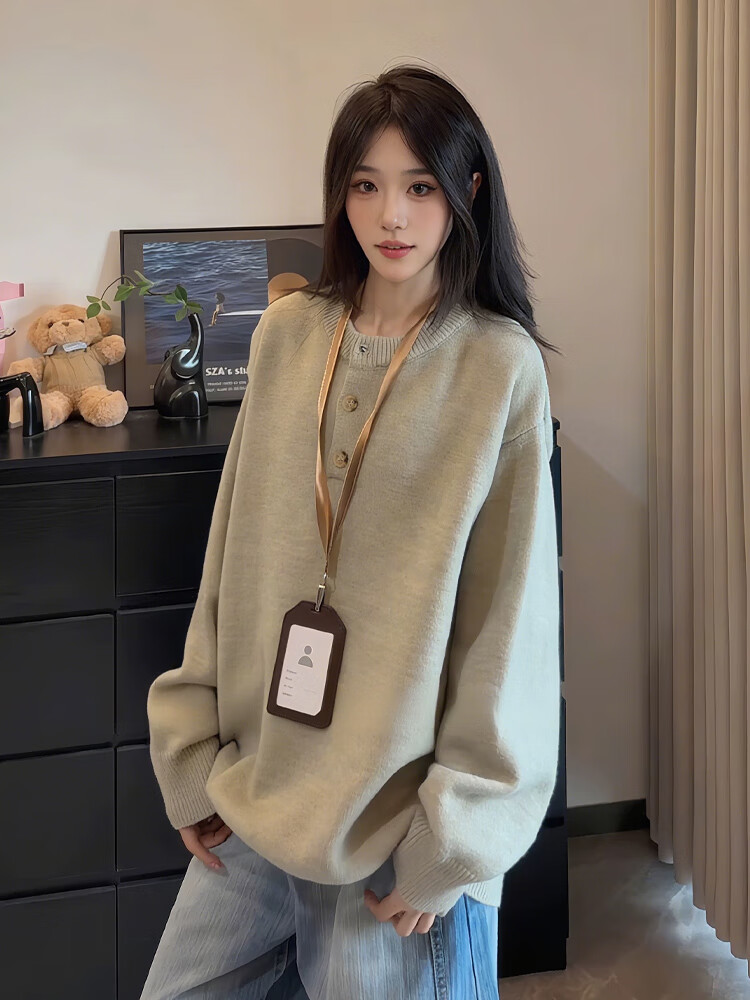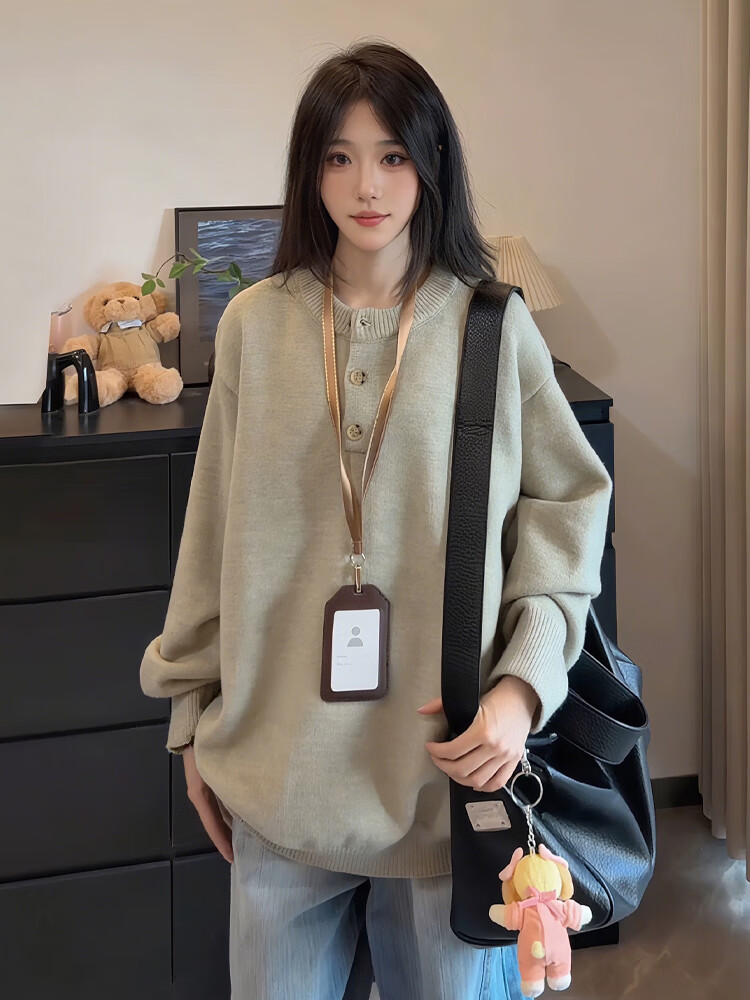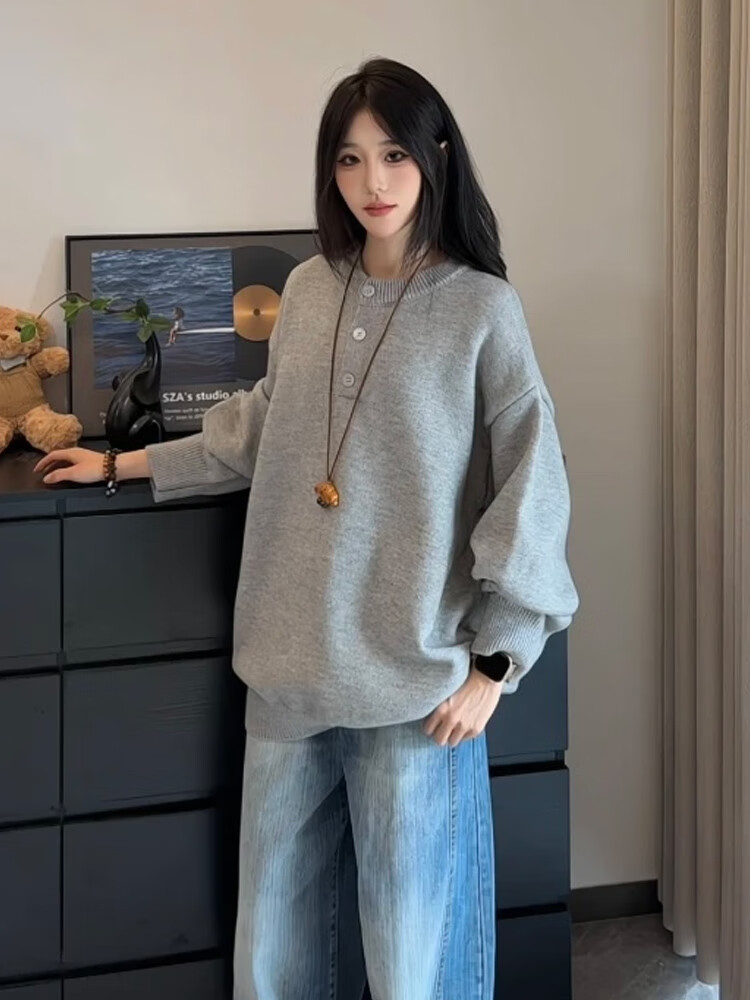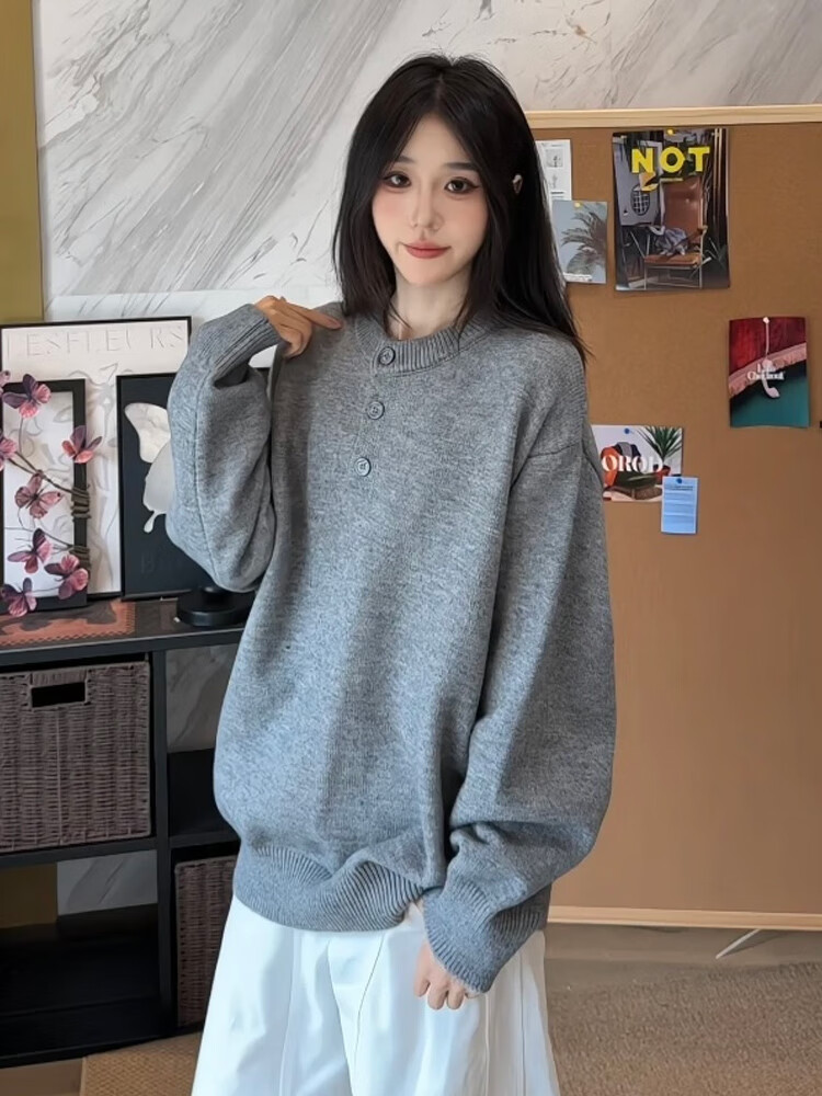 XUANSENTU (XUANSENTU) American retro Henry collar sweater, lazy and relaxed, soft and waxy sweater for men and women, autumn and winter Korean style top, trendy, light gray, upgraded fabric M
