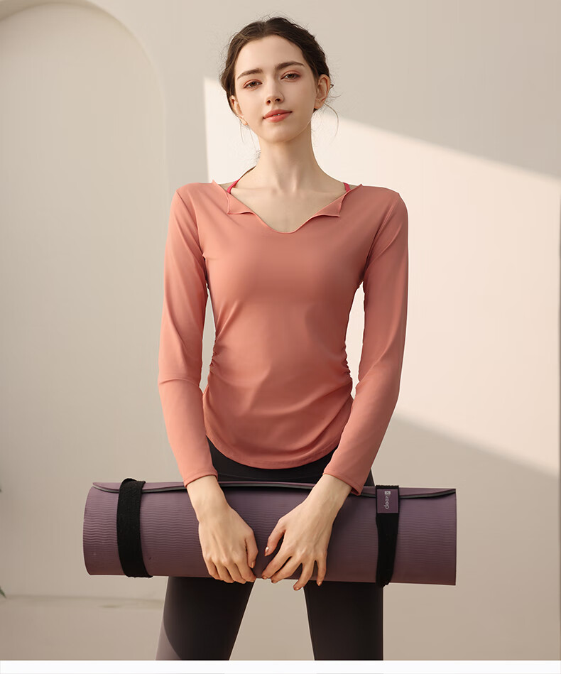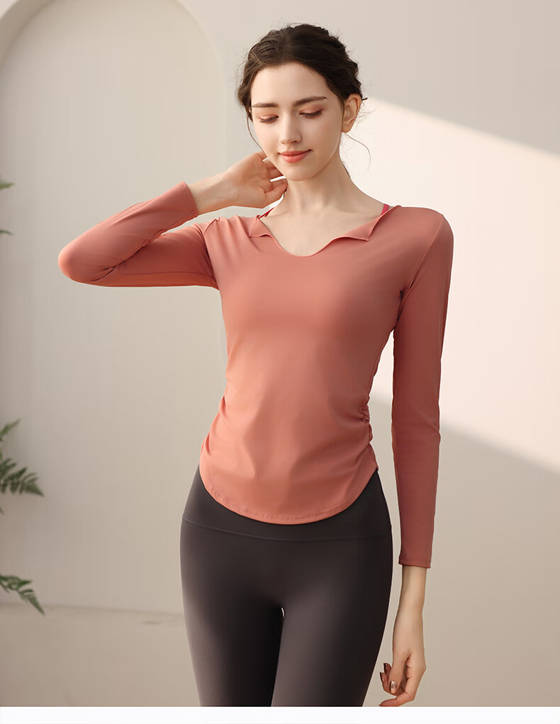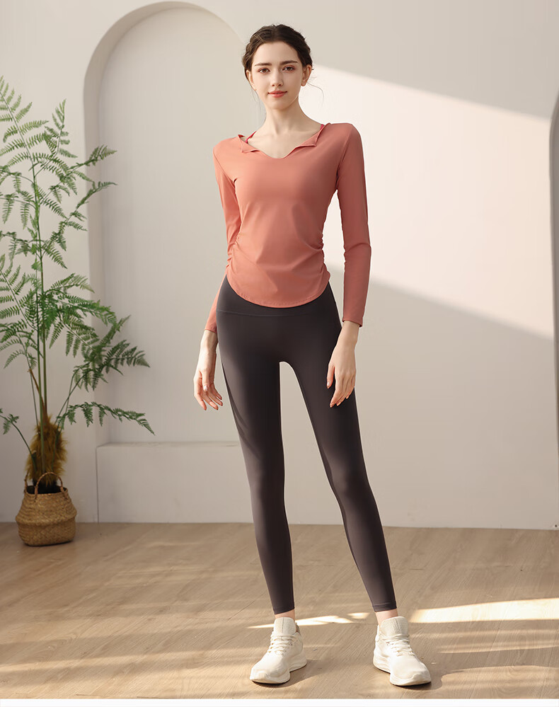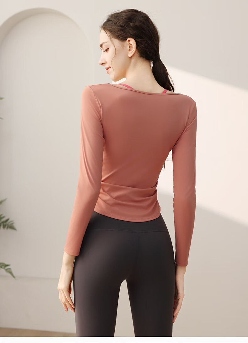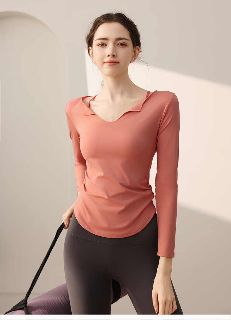 Yoga wear women's long-sleeved T-shirt temperament U-neck waist slimming sports long-sleeved Pilates training fitness top coral pink L