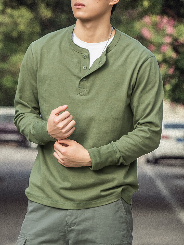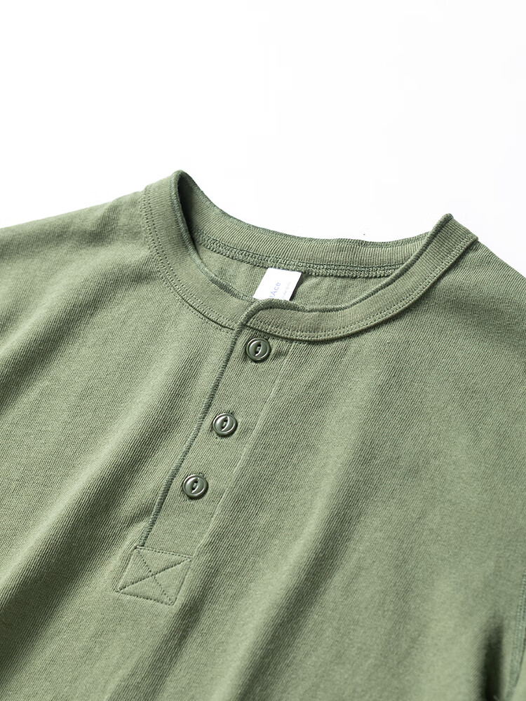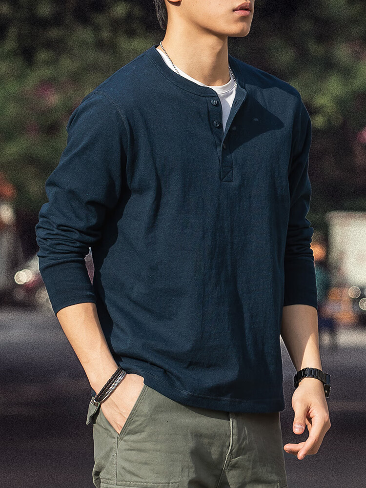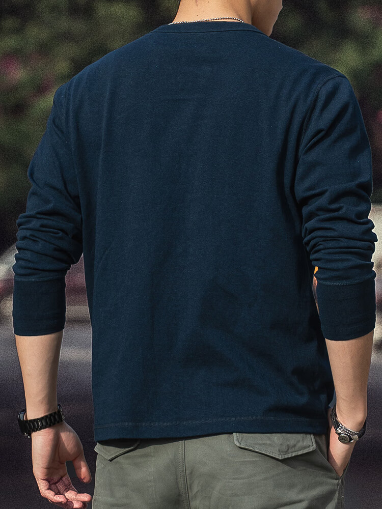 American vintage henley long-sleeved T-shirt for men 2025 autumn 250g sideways seamless henley collar bottoming shirt denim blue _ 250g L _reference 140-155Jin Jin equals 0.5 kg