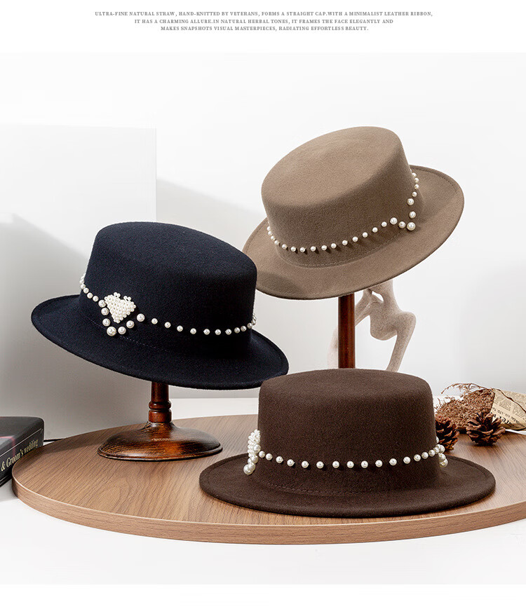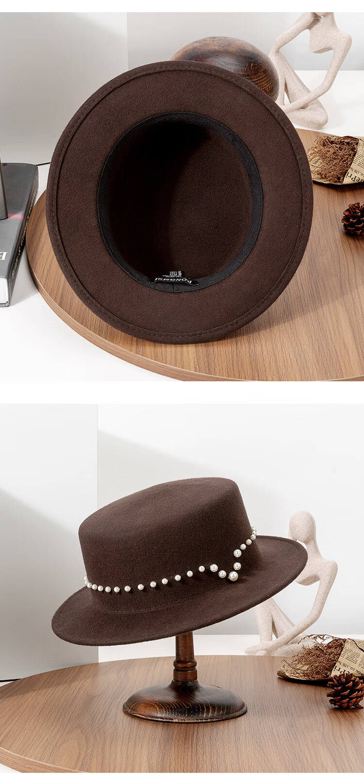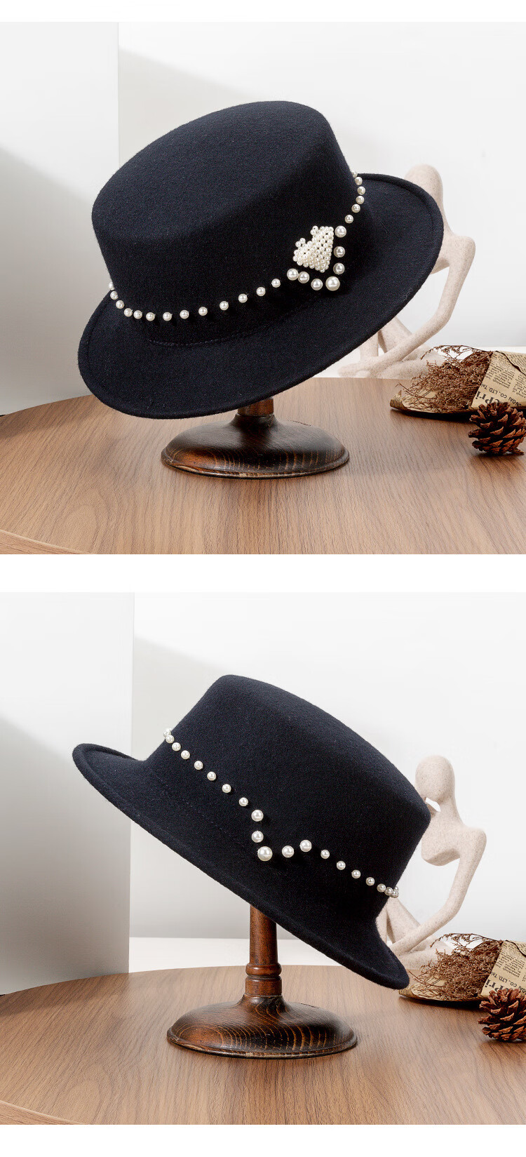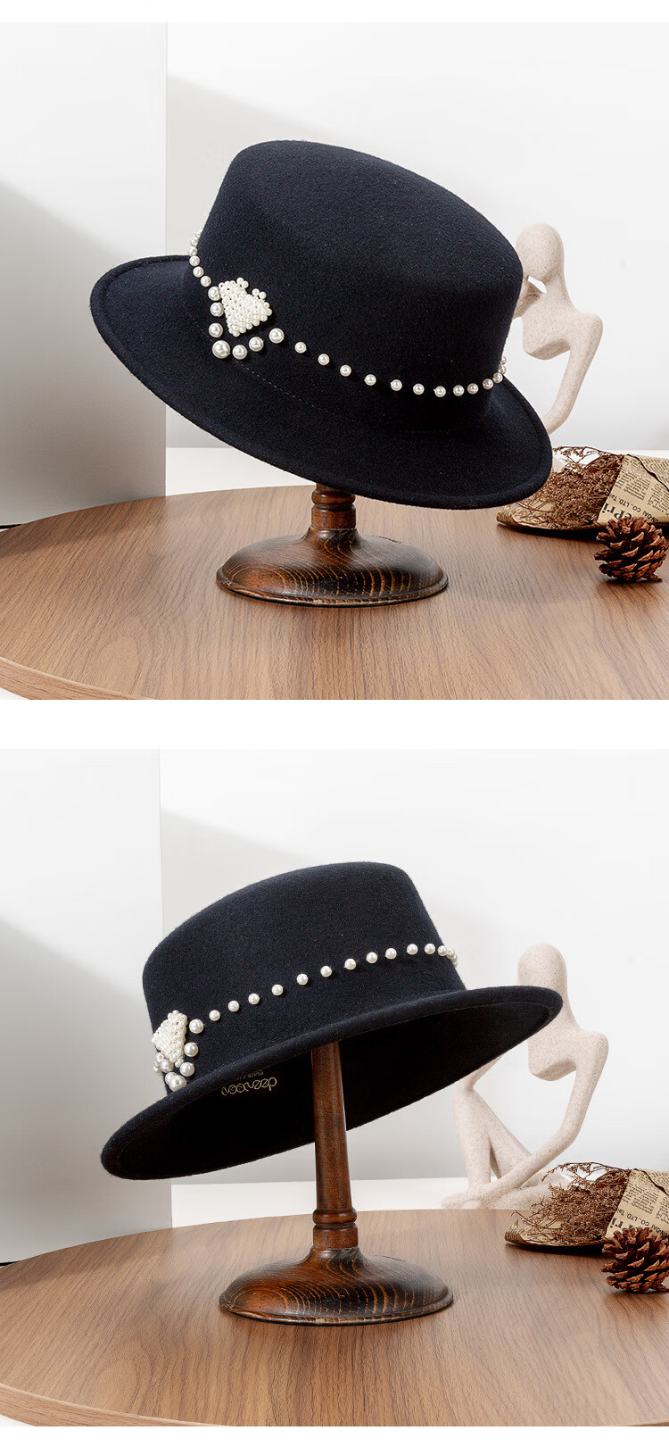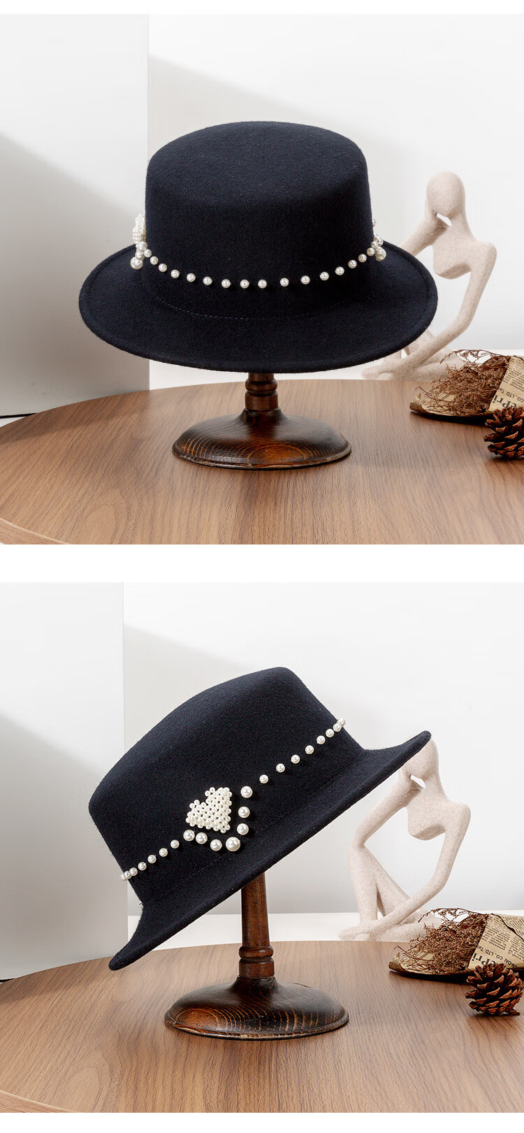 Lee dprre new autumn and winter British large brim flat top hat women's French retro elegant comfortable woolen felt top hat navy blue M size