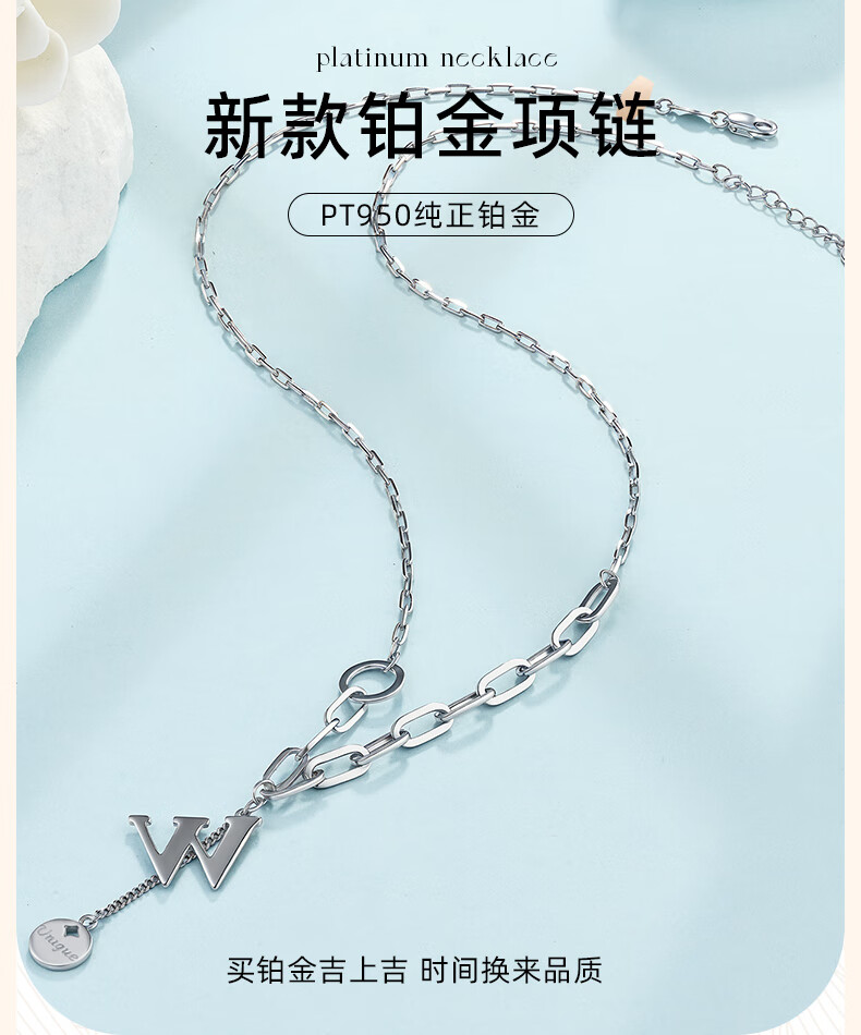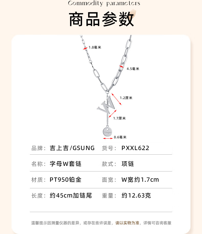 GsunG platinum letter W chain set for women PT950 pure platinum large letter pendant necklace fashionable sweater chain. Priced by gram. Contact before bidding.
