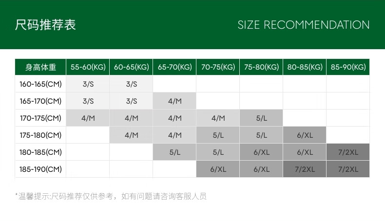 China (cm) 165 / 88-90 170 / 96-98 175 / 108-110 180 / 118-122 185 / 126-130
