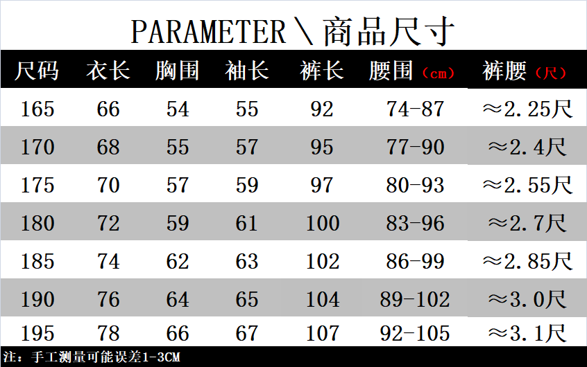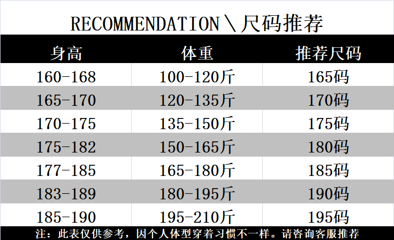 China (cm) 165 / 88-90 170 / 96-98 175 / 108-110 180 / 118-122 185 / 126-130