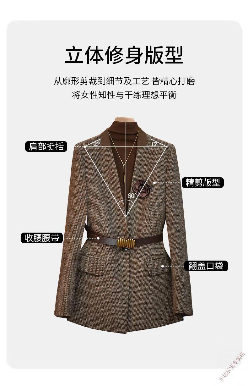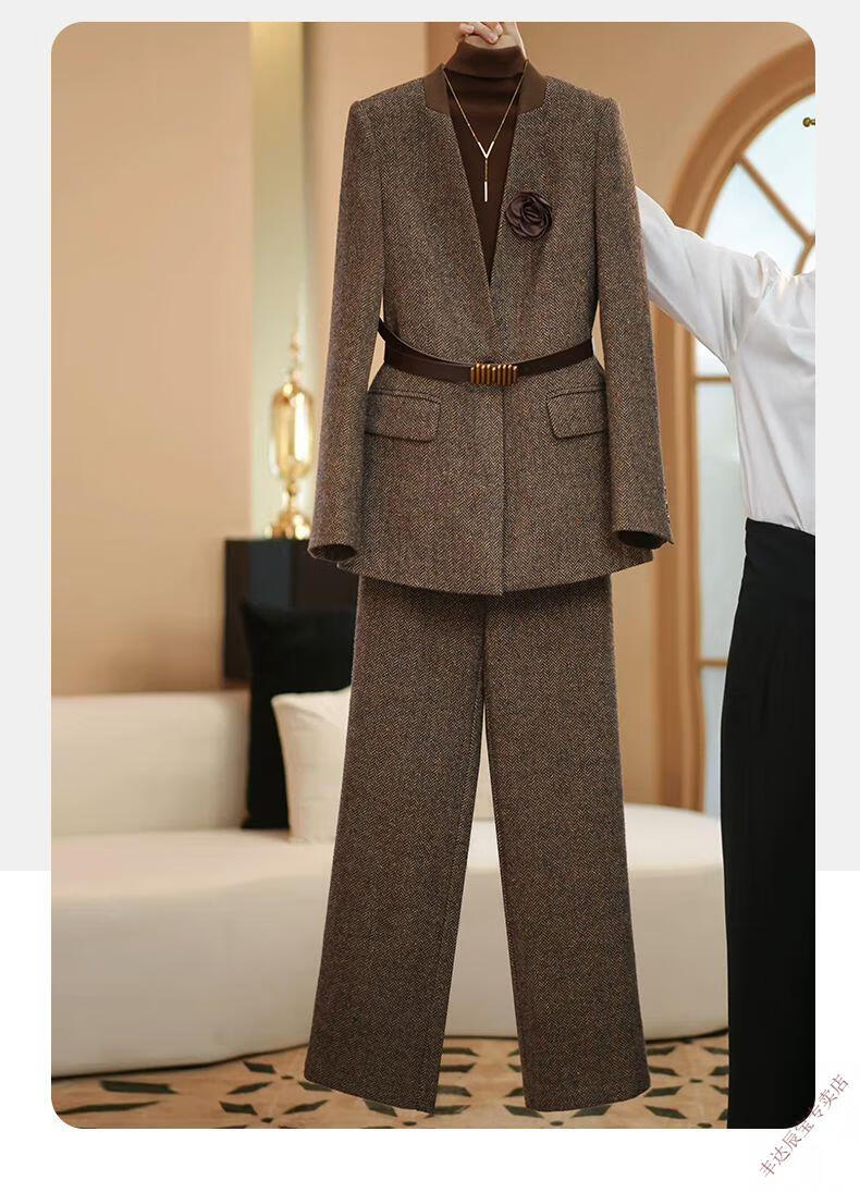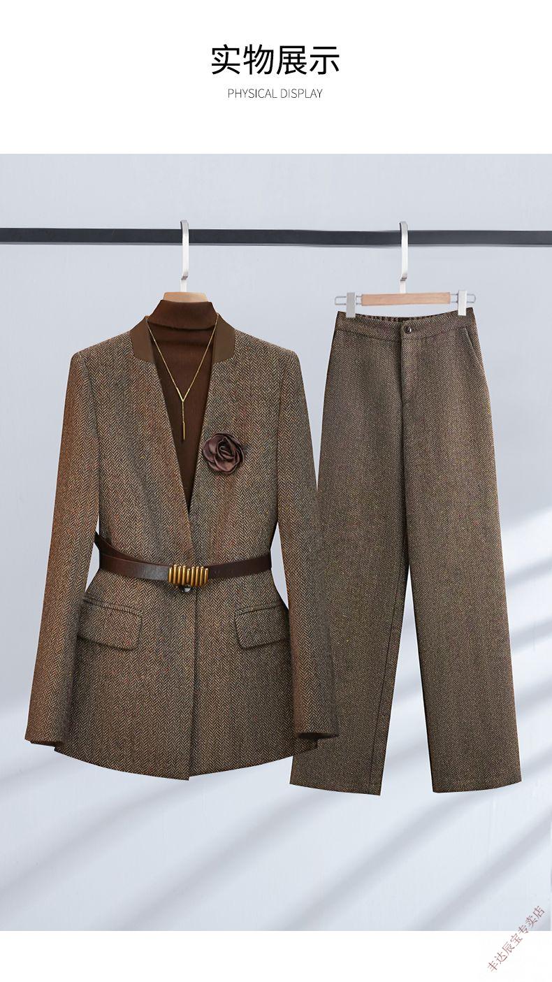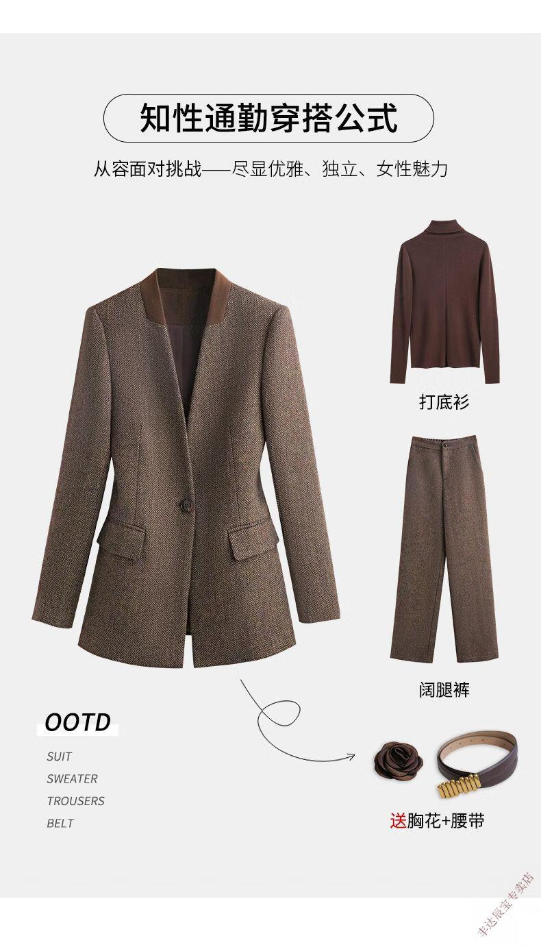 Pierre Cardin coffee color versatile suit suit for women in autumn and winter, thick herringbone pattern, fashionable and simple commuter suit, coffee color jacket + coffee color sweater + coffee color pants (comes with corsage + belt) 2XL 125-145Jin Jin is equal to 0.5 kg