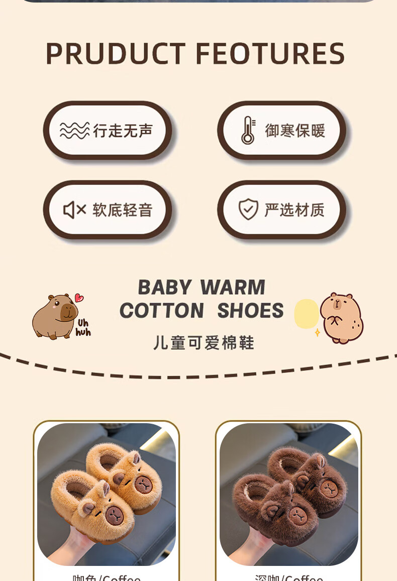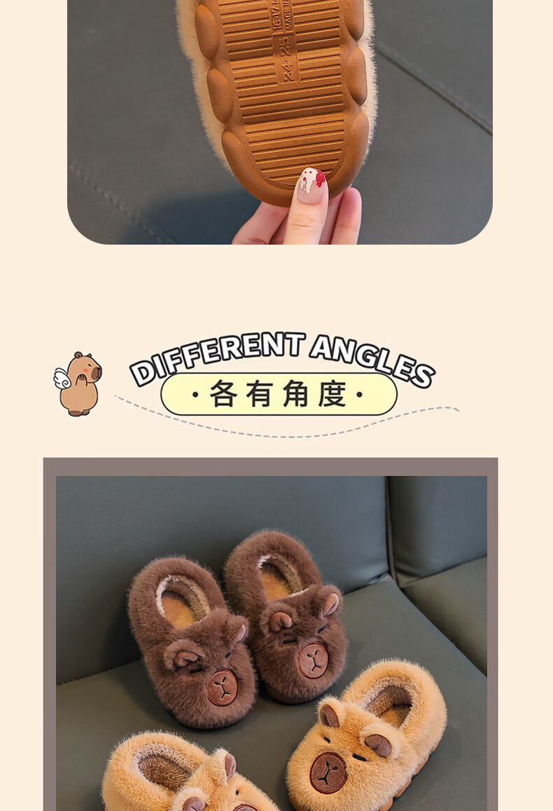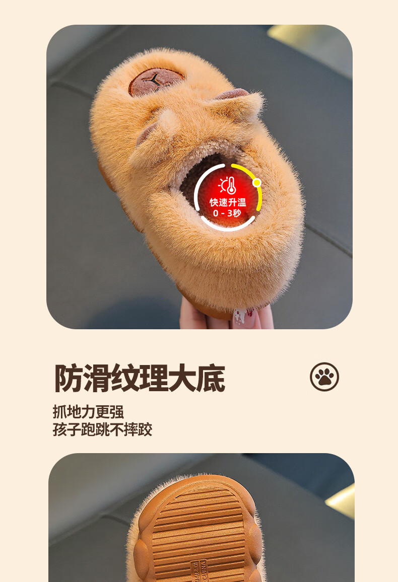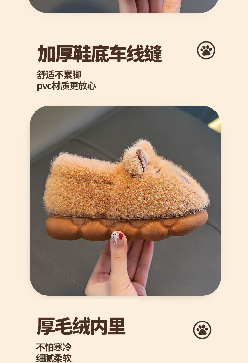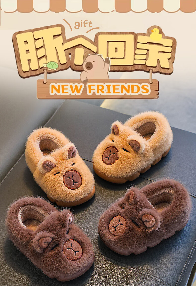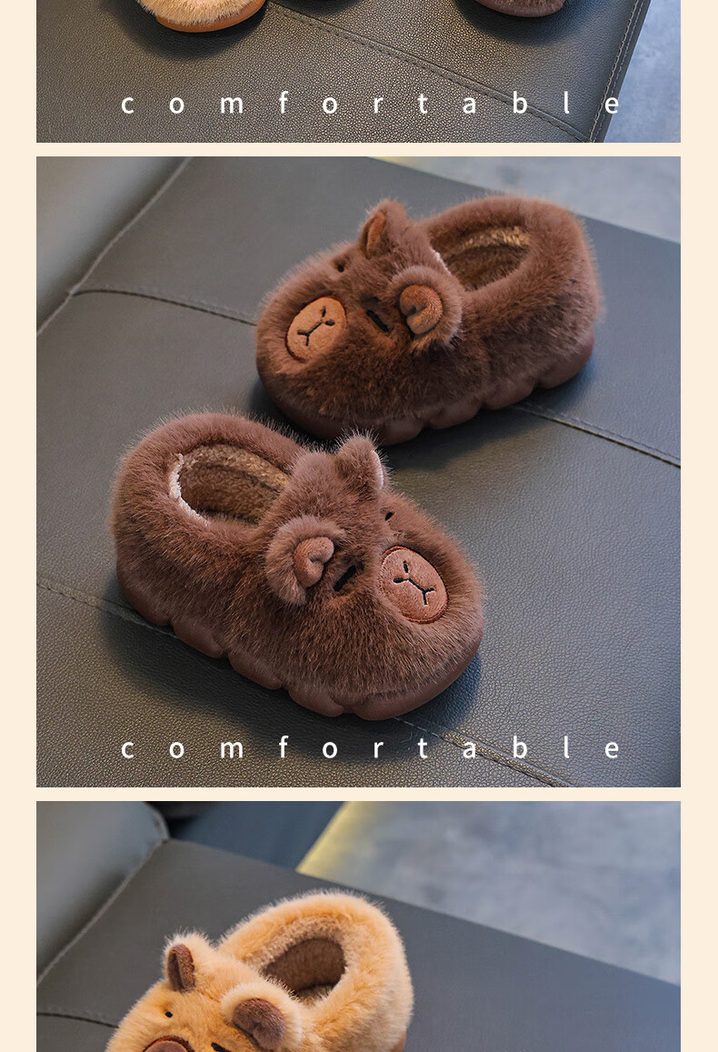 Kapibara children's cotton slippers, girls' winter cartoon cute non-slip soft-soled slippers, baby slippers, upgraded environmentally friendly material, light coffee (heel included) 12, 32/33 size (shoe inner length 19CM, suitable for feet 18