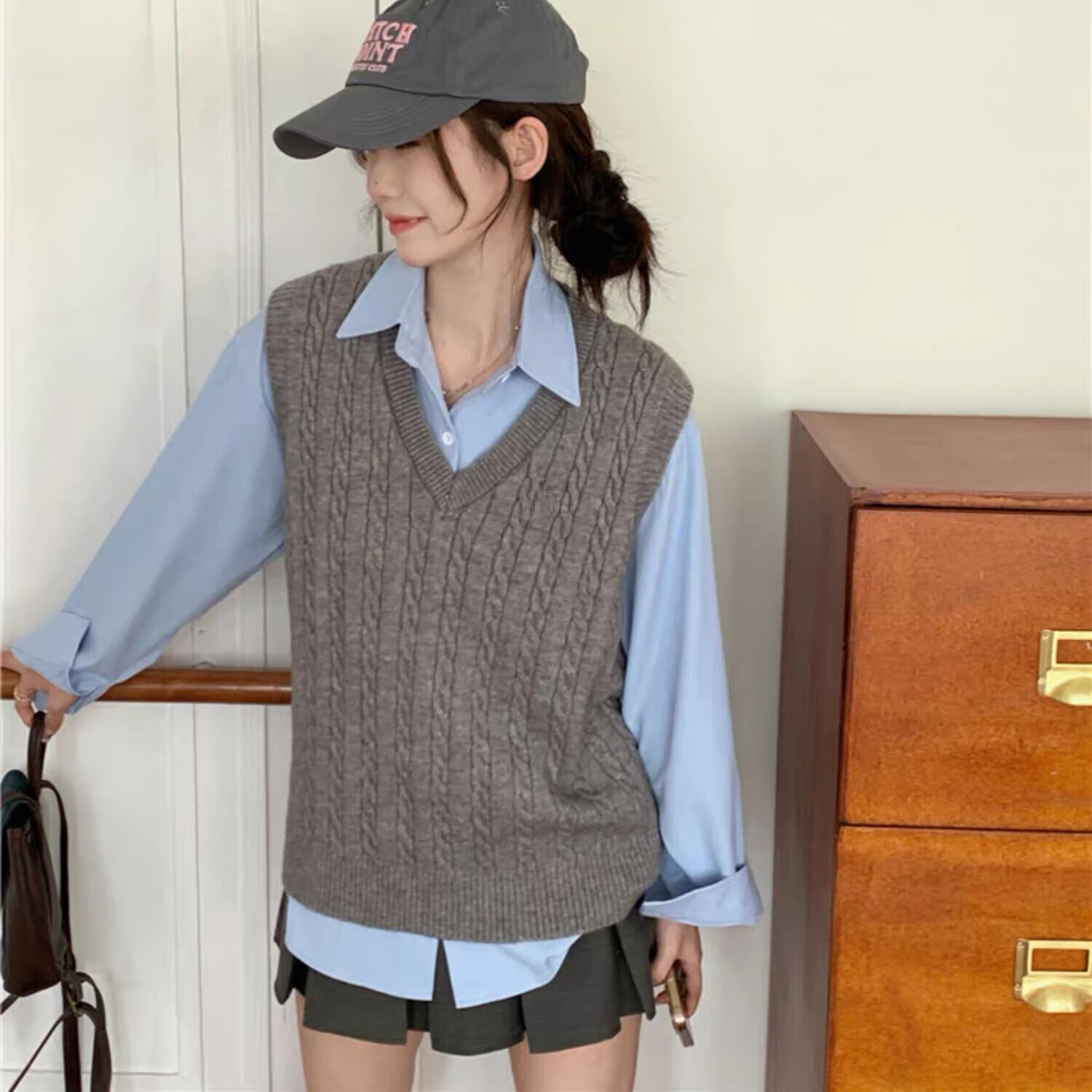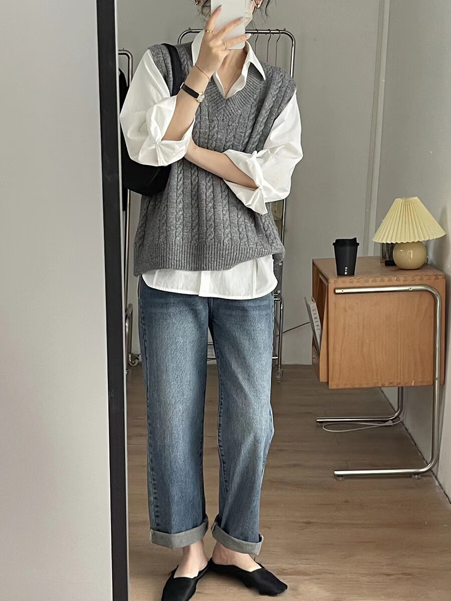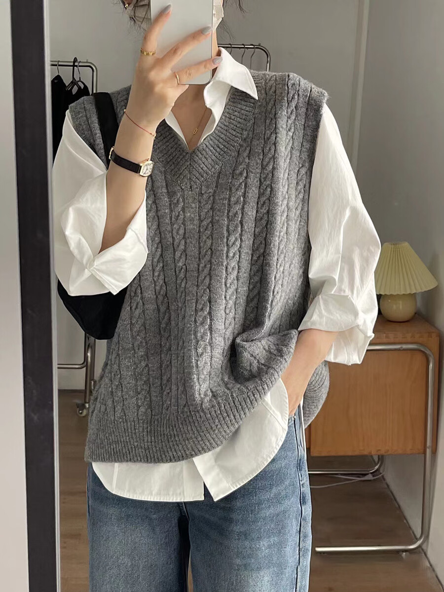 Ge Shihui Korean style twist V-neck pullover knitted vest for women 2025 autumn new women's sweater vest with inner loose twist knitted vest gray one size