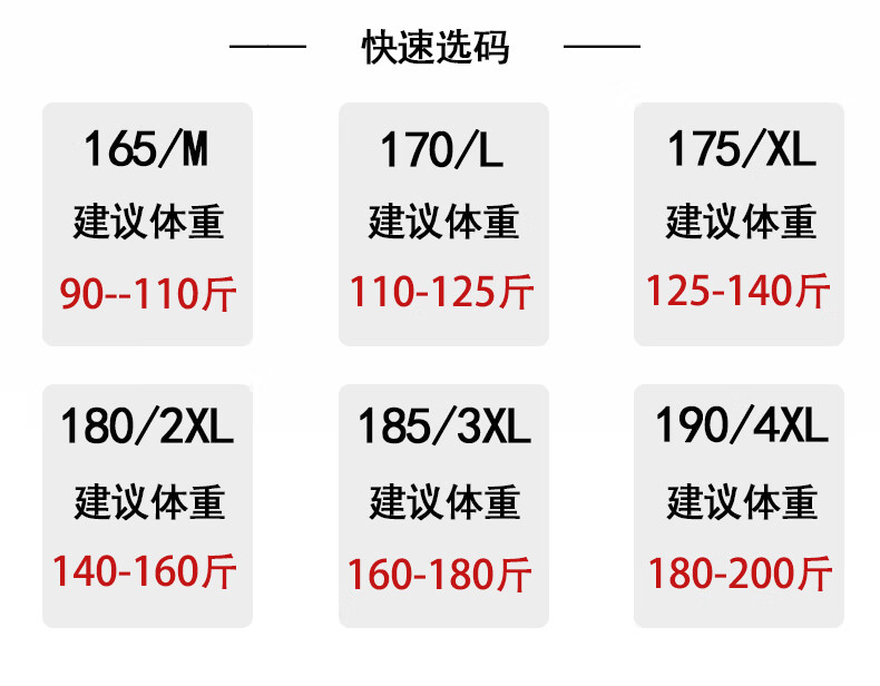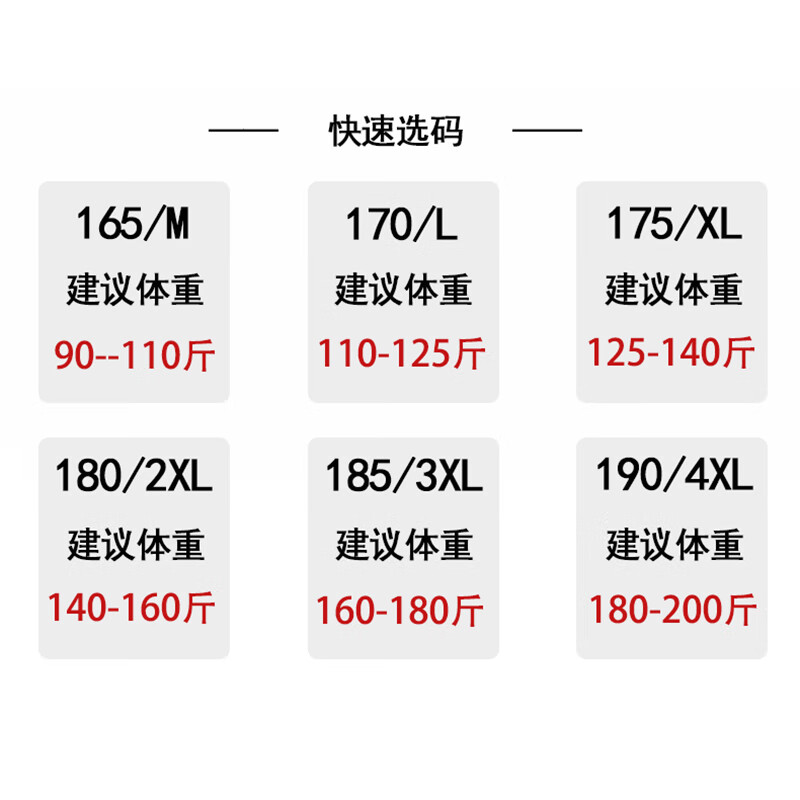 China (cm) 165 / 88-90 170 / 96-98 175 / 108-110 180 / 118-122 185 / 126-130