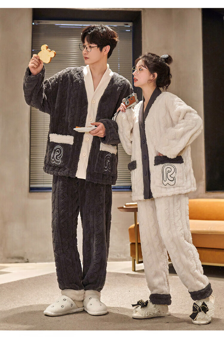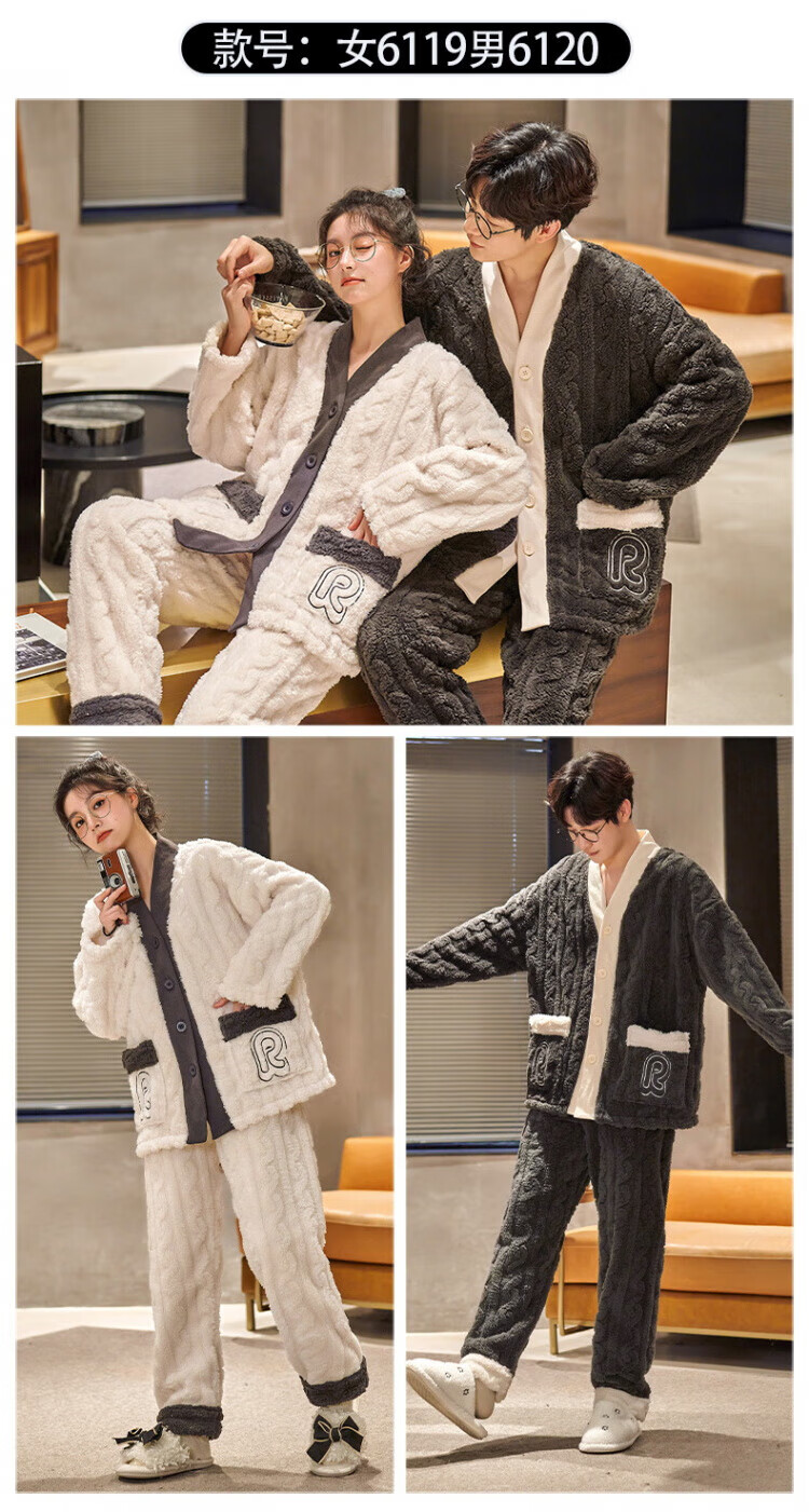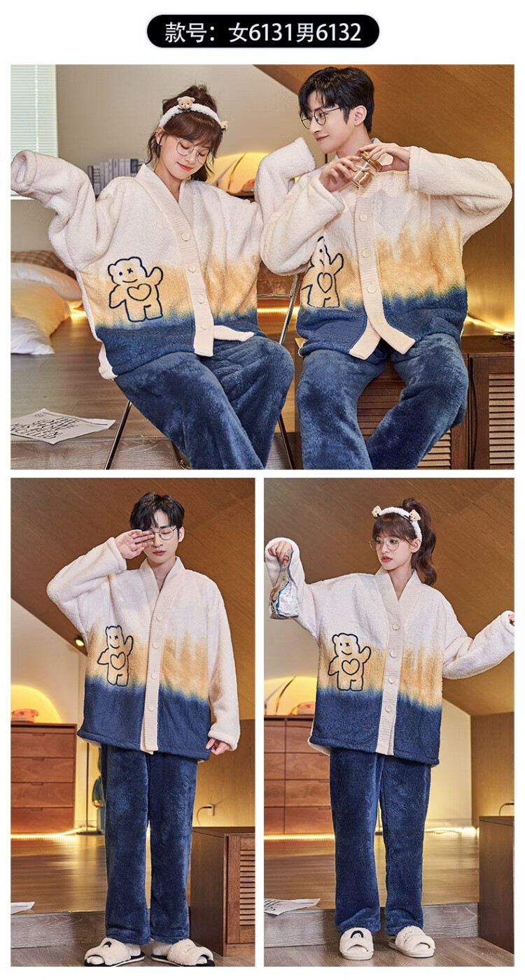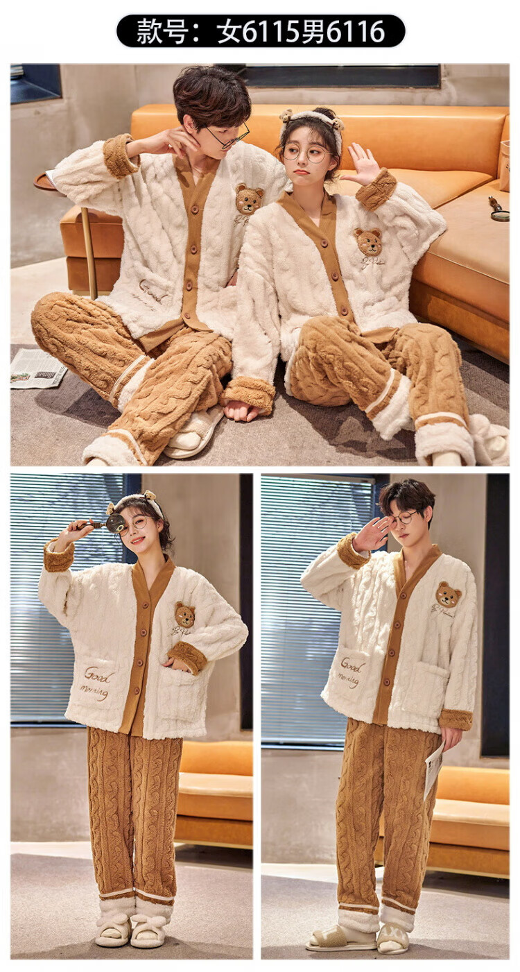 MiiOW couple pajamas autumn and winter style coral velvet V-neck cardigan for men and women thickened velvet flannel home wear set female B6119 male B6120 M female