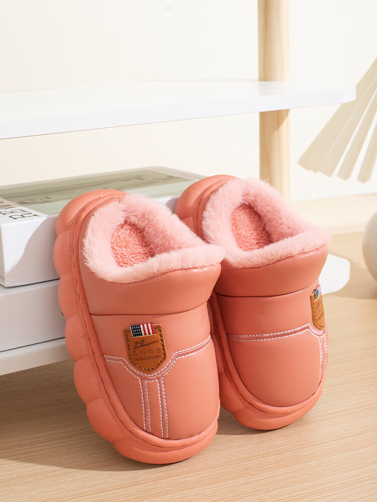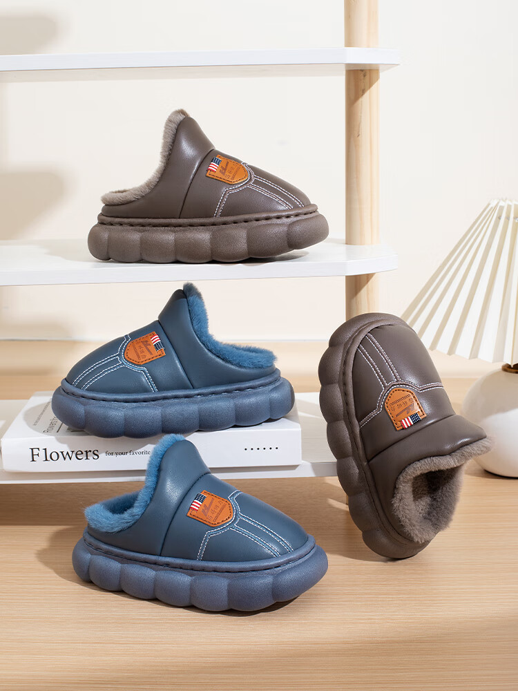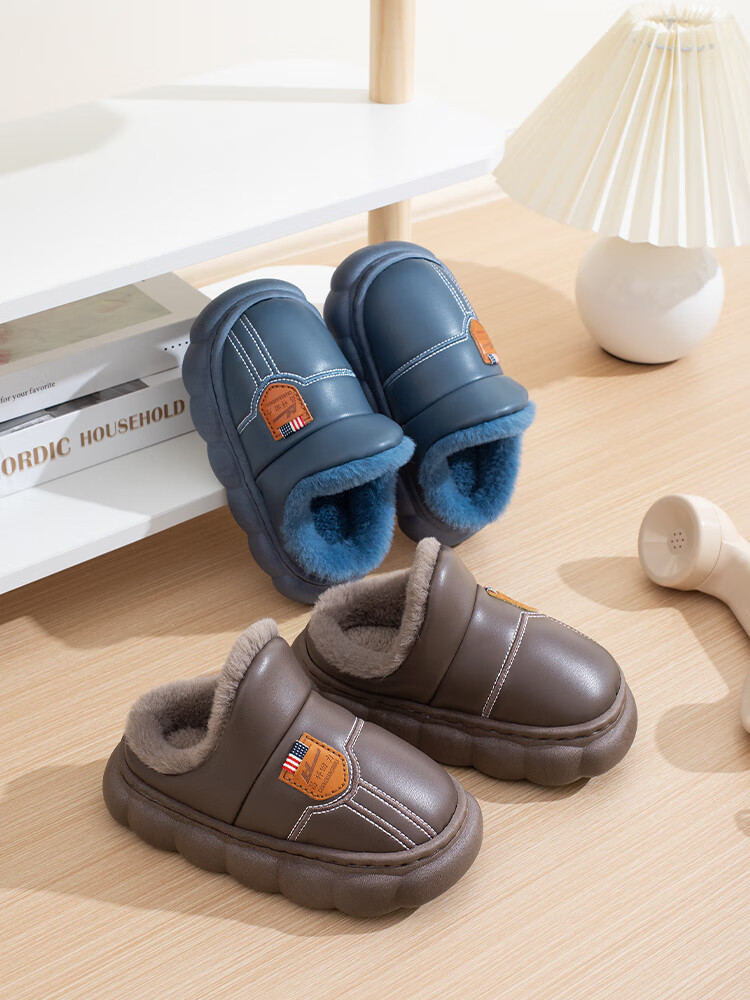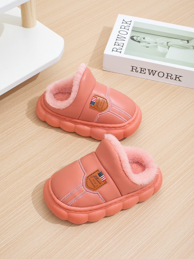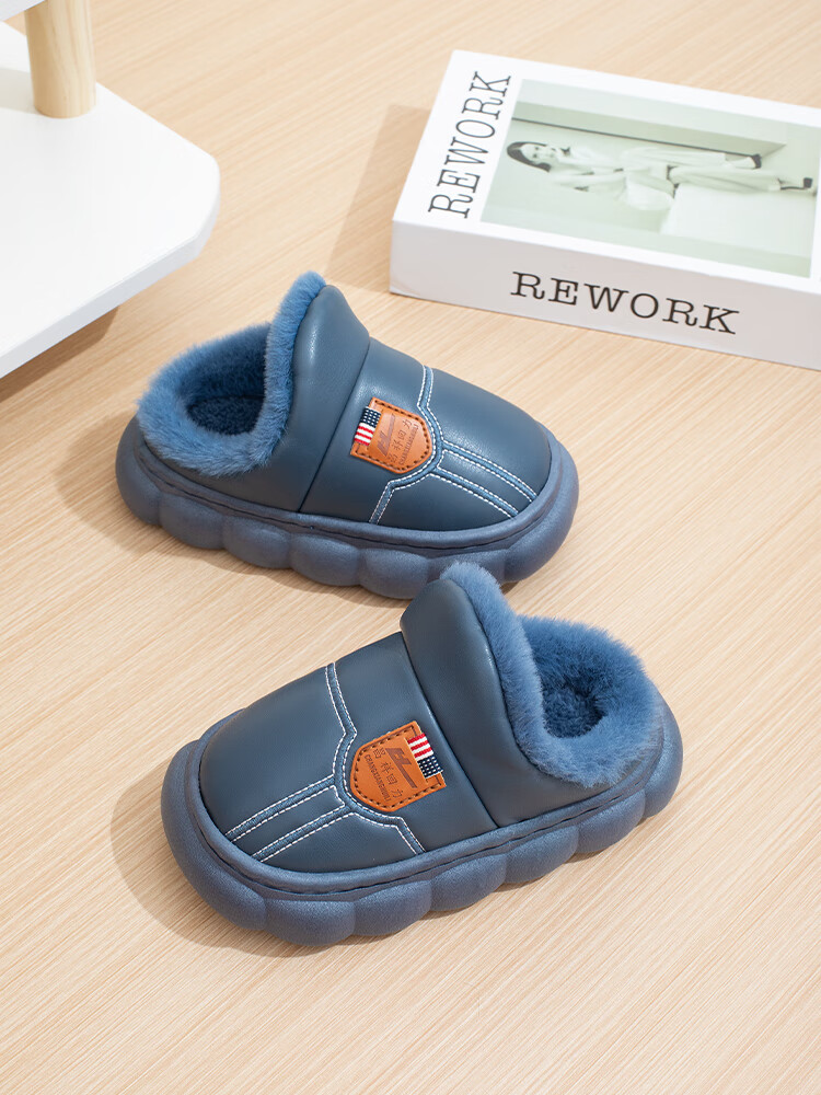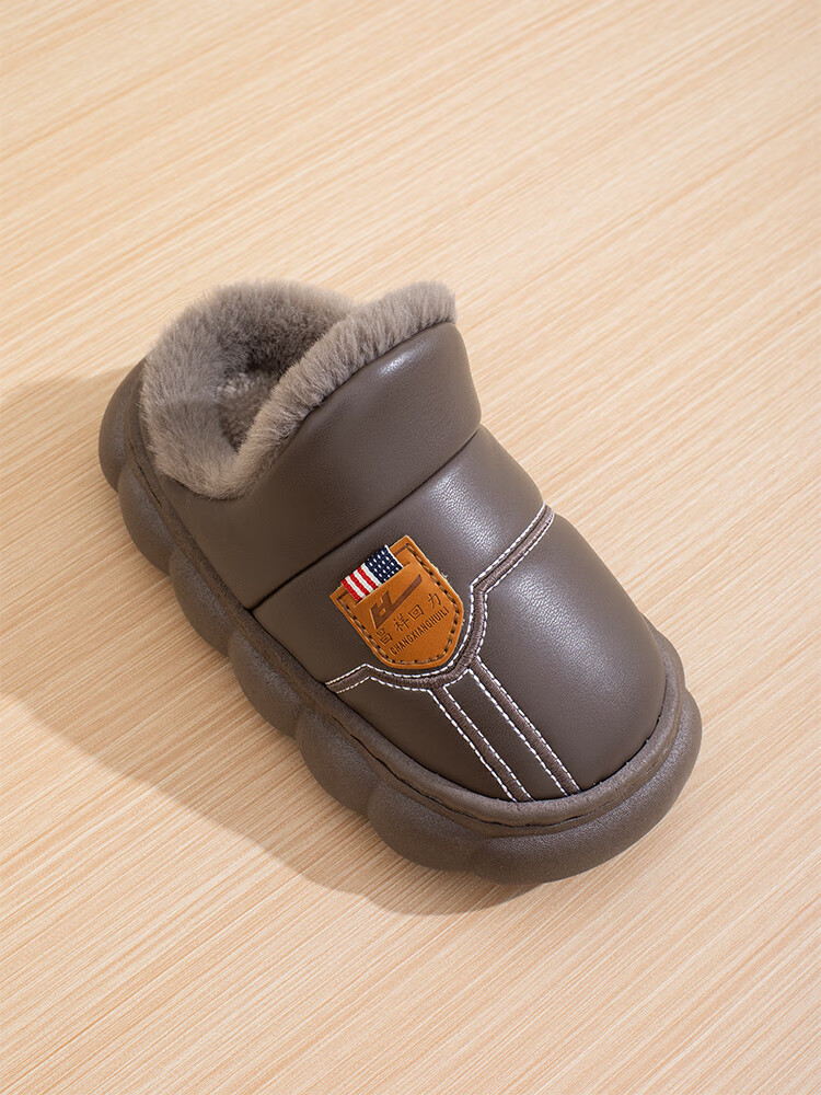 Autumn and winter cotton slippers for boys and girls, thick-soled non-slip cotton slippers for indoor and outdoor use, plus velvet and warm cotton slippers for boys and girls, leather label T-grey 12 38/39 adult one size smaller