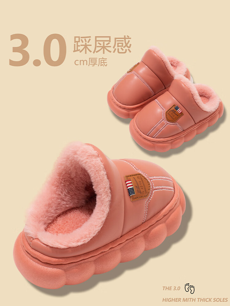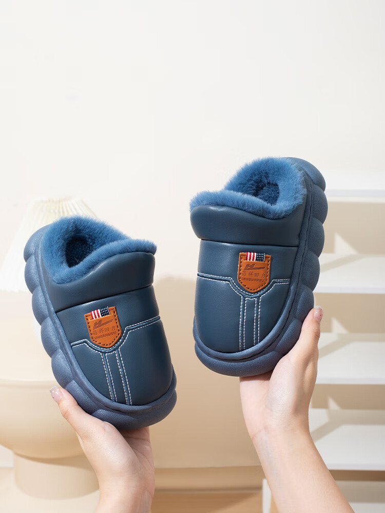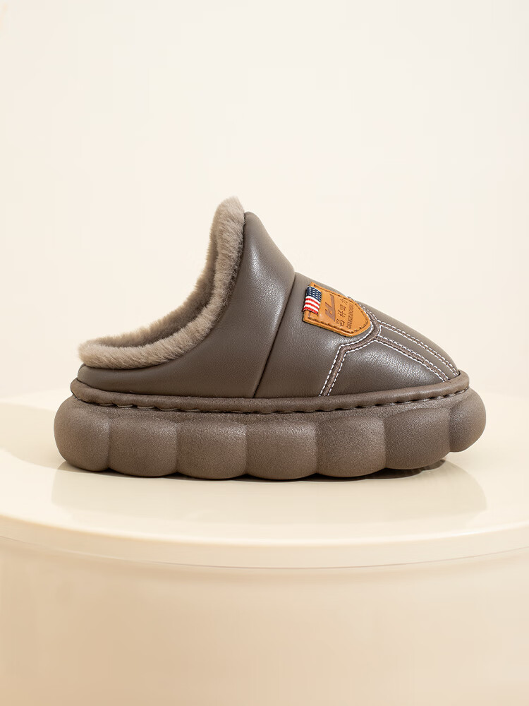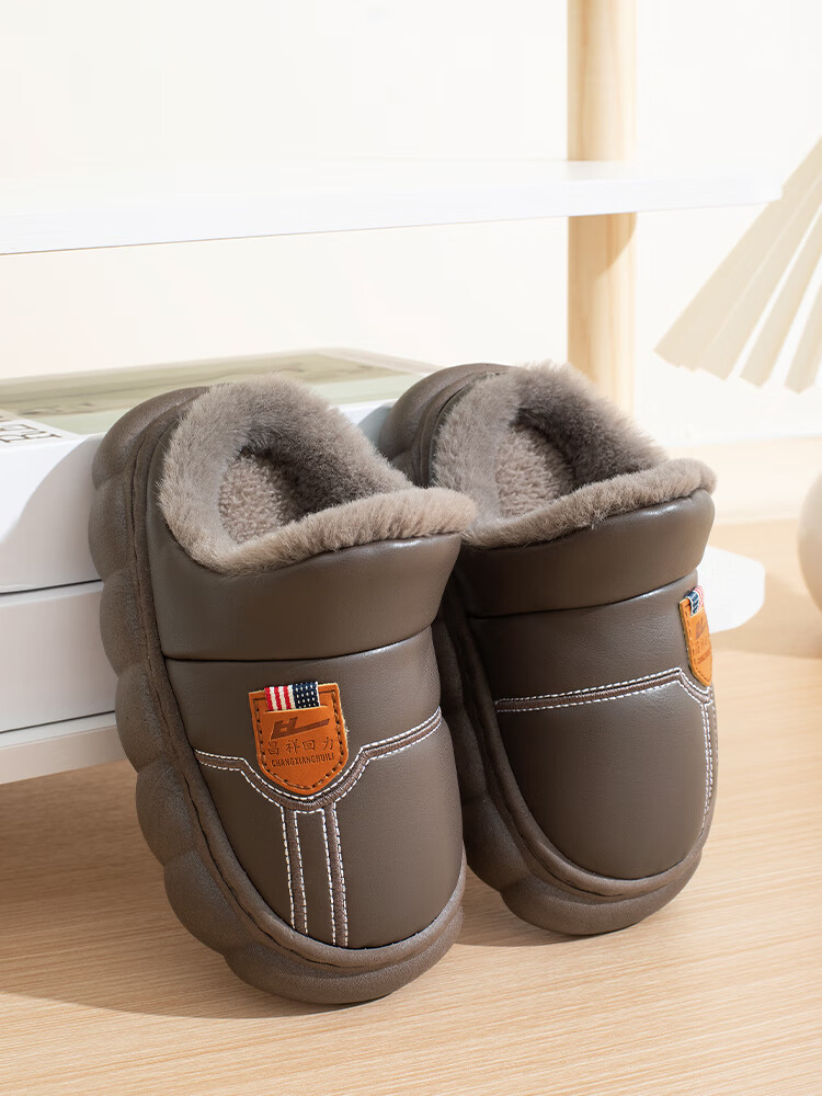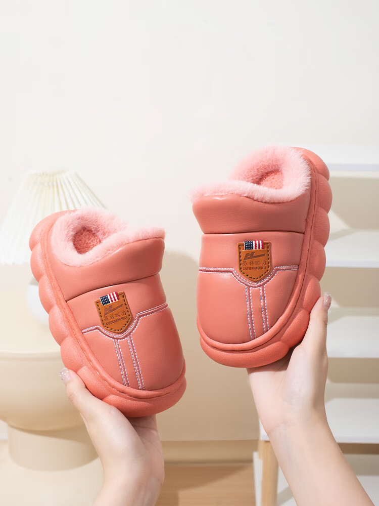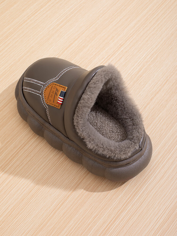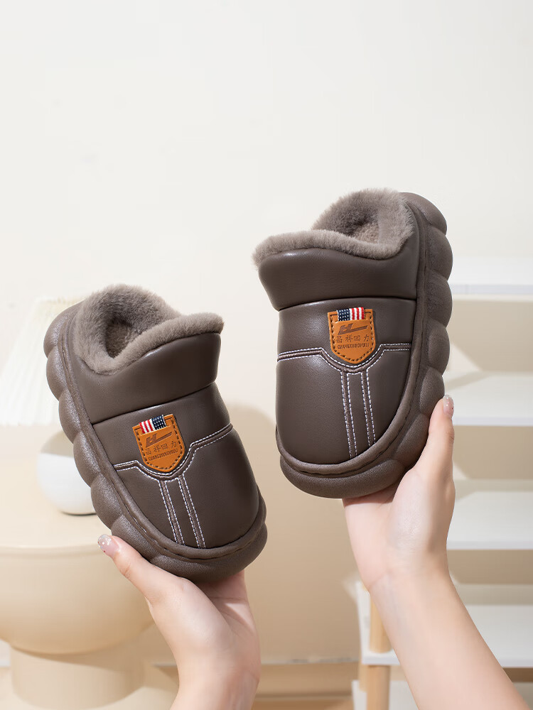 Autumn and winter cotton slippers for boys and girls, thick-soled non-slip cotton slippers for indoor and outdoor use, plus velvet and warm cotton slippers for boys and girls, leather label T-grey 12 38/39 adult one size smaller