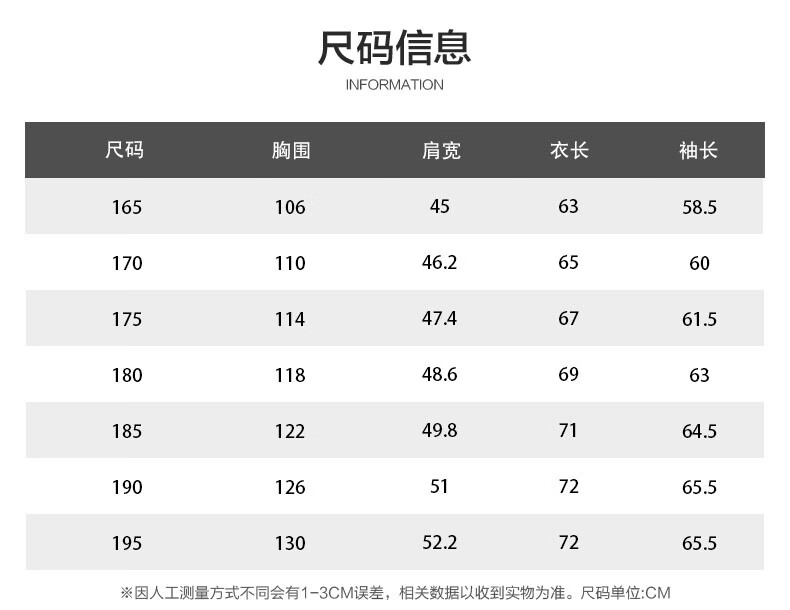 China (cm) 165 / 88-90 170 / 96-98 175 / 108-110 180 / 118-122 185 / 126-130