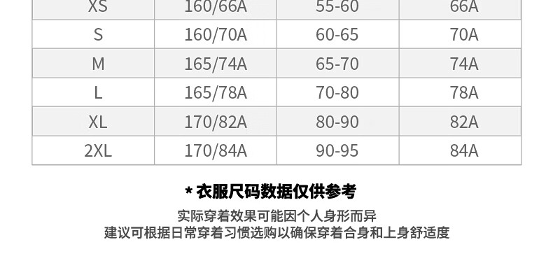 China (cm) 160-165/84-86 165-170 / 88-90 167-172 / 92-96 168-173 / 98-102 170-176 / 106-110