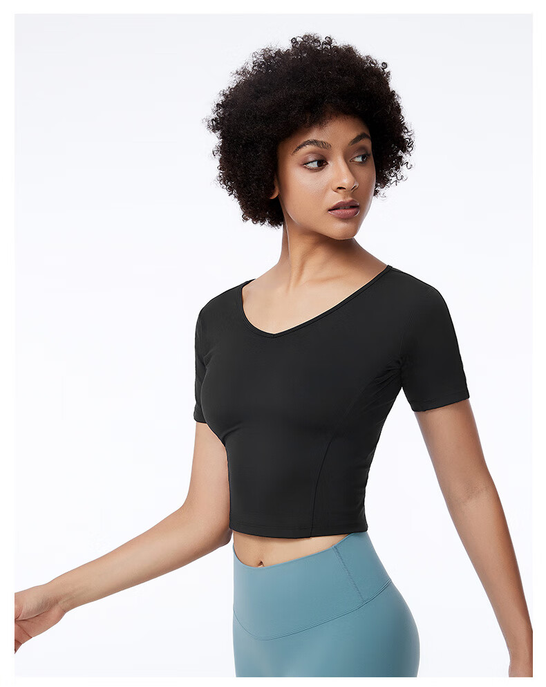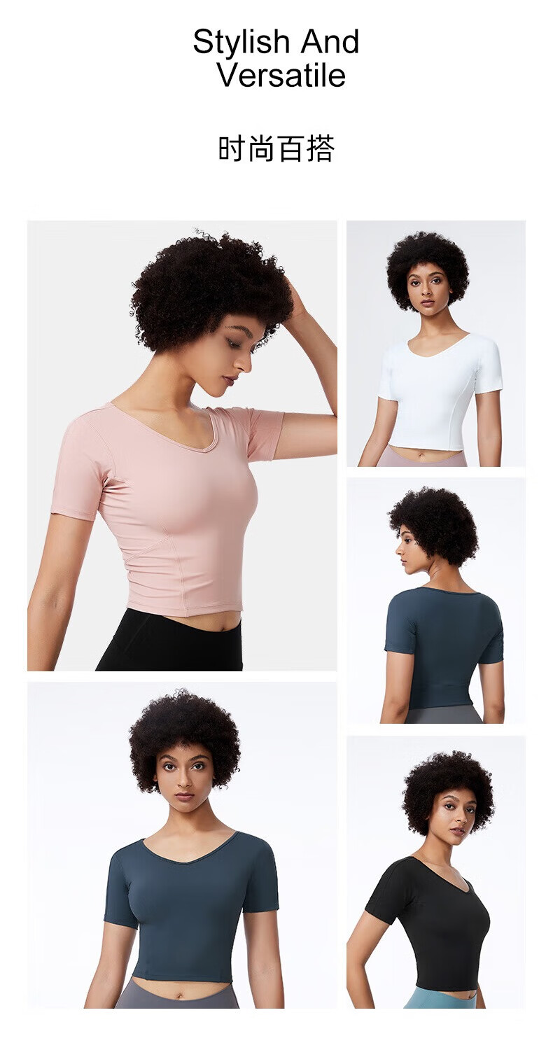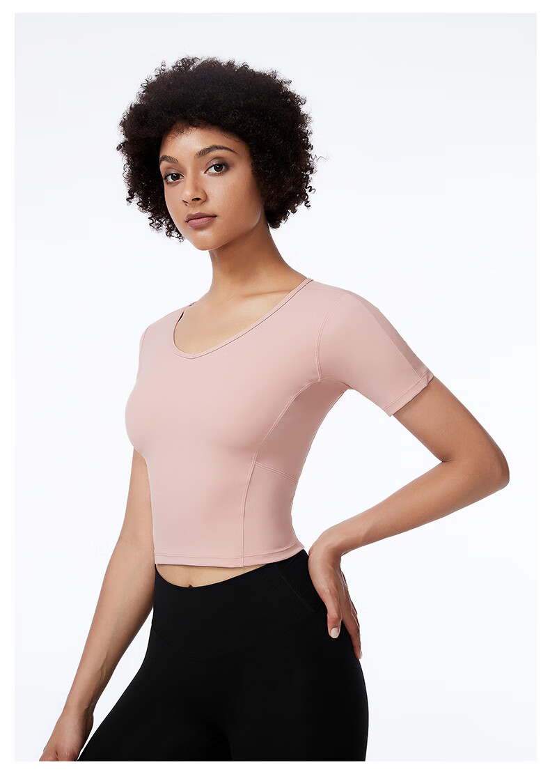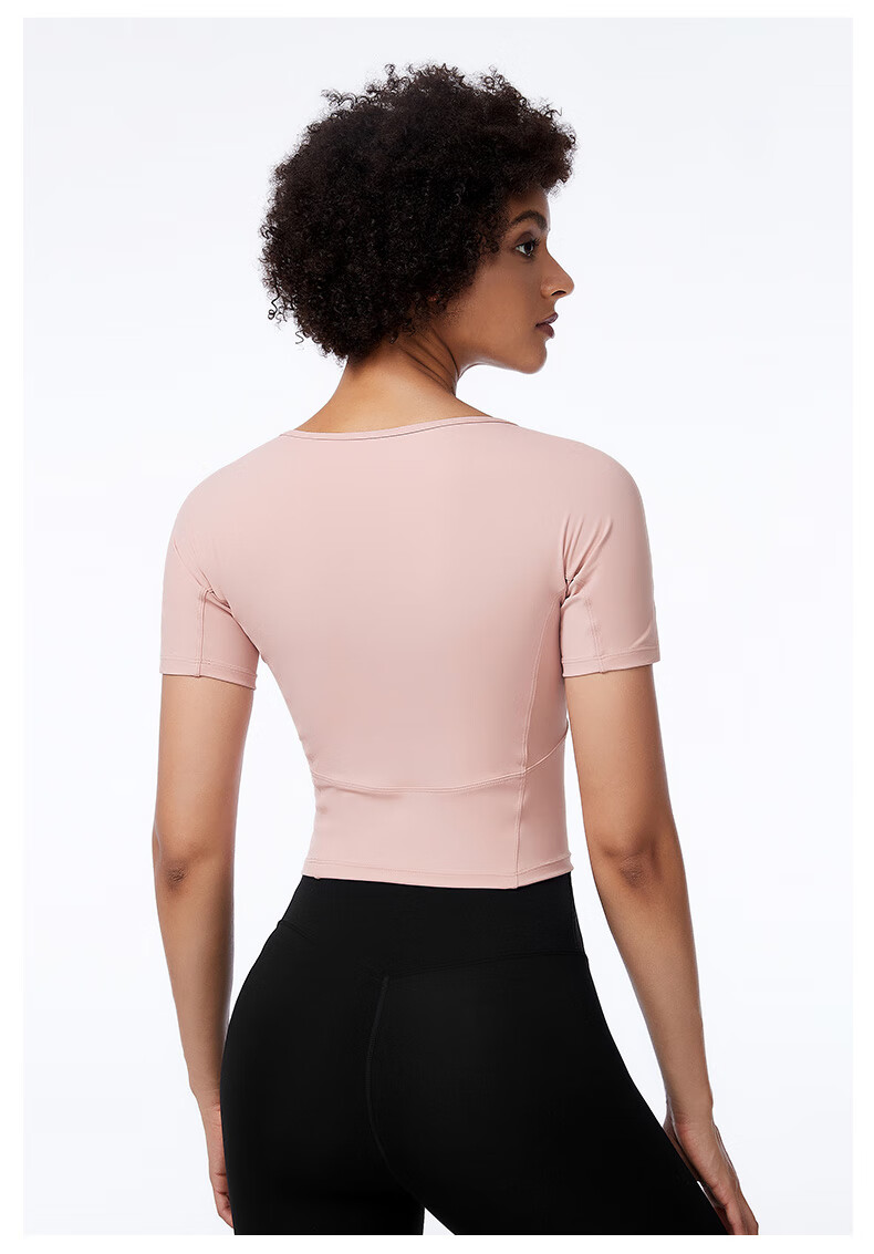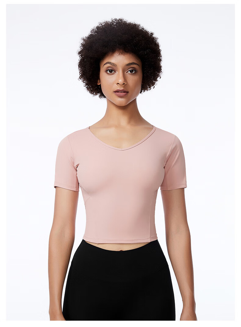 V-neck slim slimming yoga wear top for women professional Pilates short-sleeved T-shirt high elastic breathable sports fitness wear pink (YJY21-10-4) M