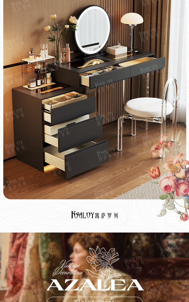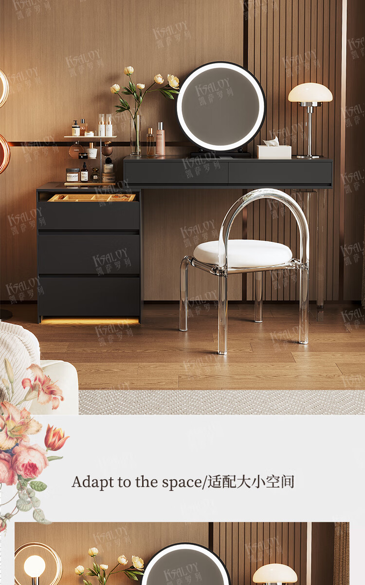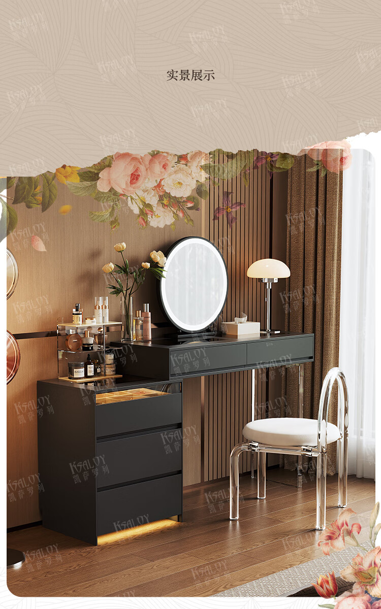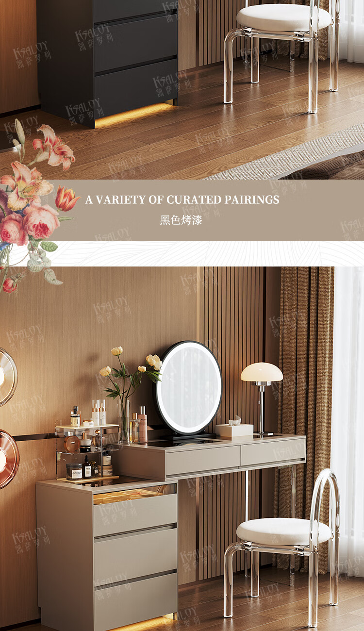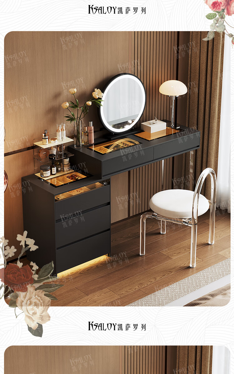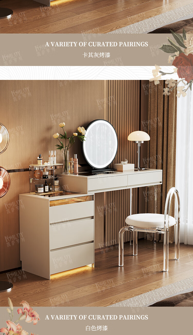 KSALOY Italian dressing table and drawer integrated bedroom small apartment storage cabinet light luxury high-end dressing table jewelry display cabinet warm white dressing table + 0.5 meter three drawer cabinet + LED round mirror + acrylic chair 100cm dressing table overall solid wood multi-layer