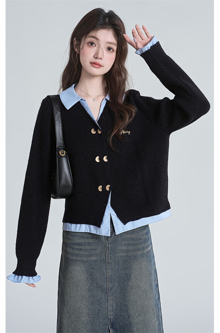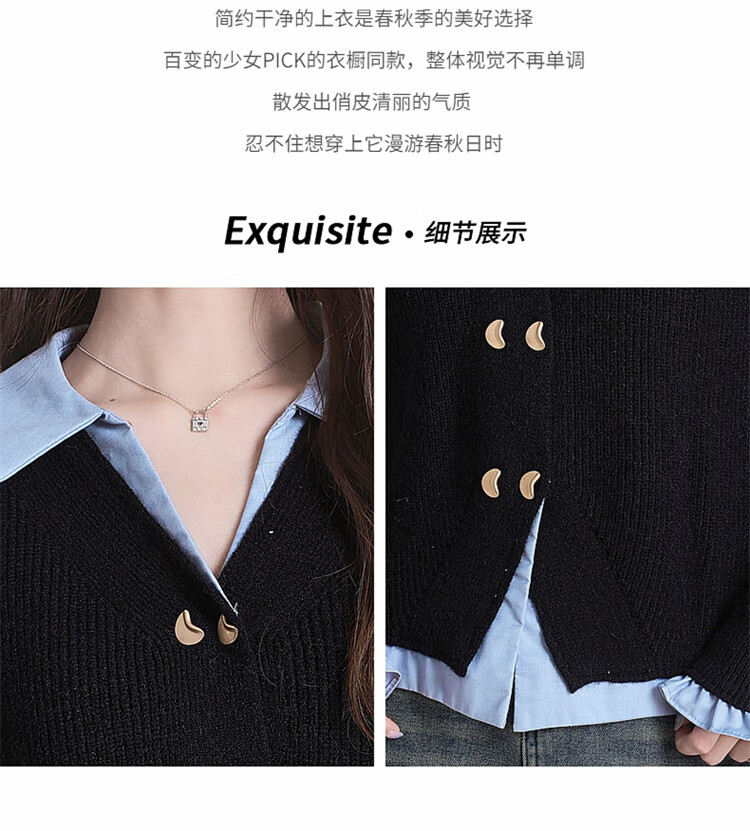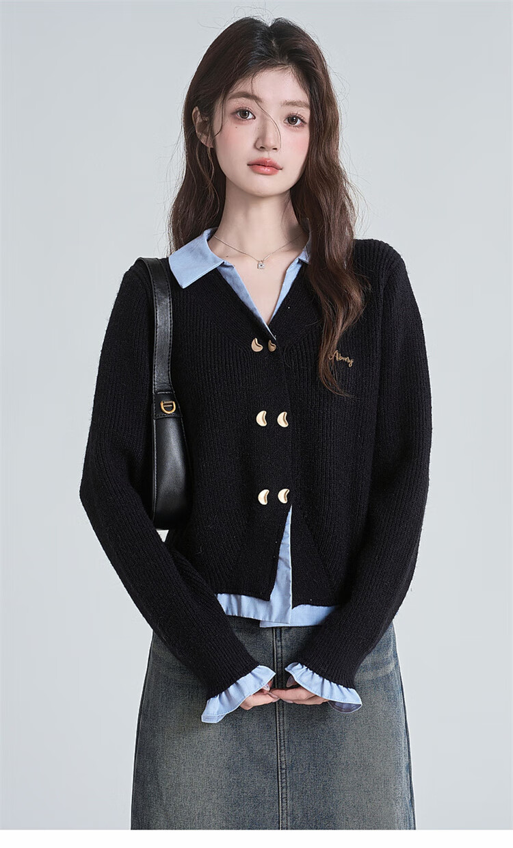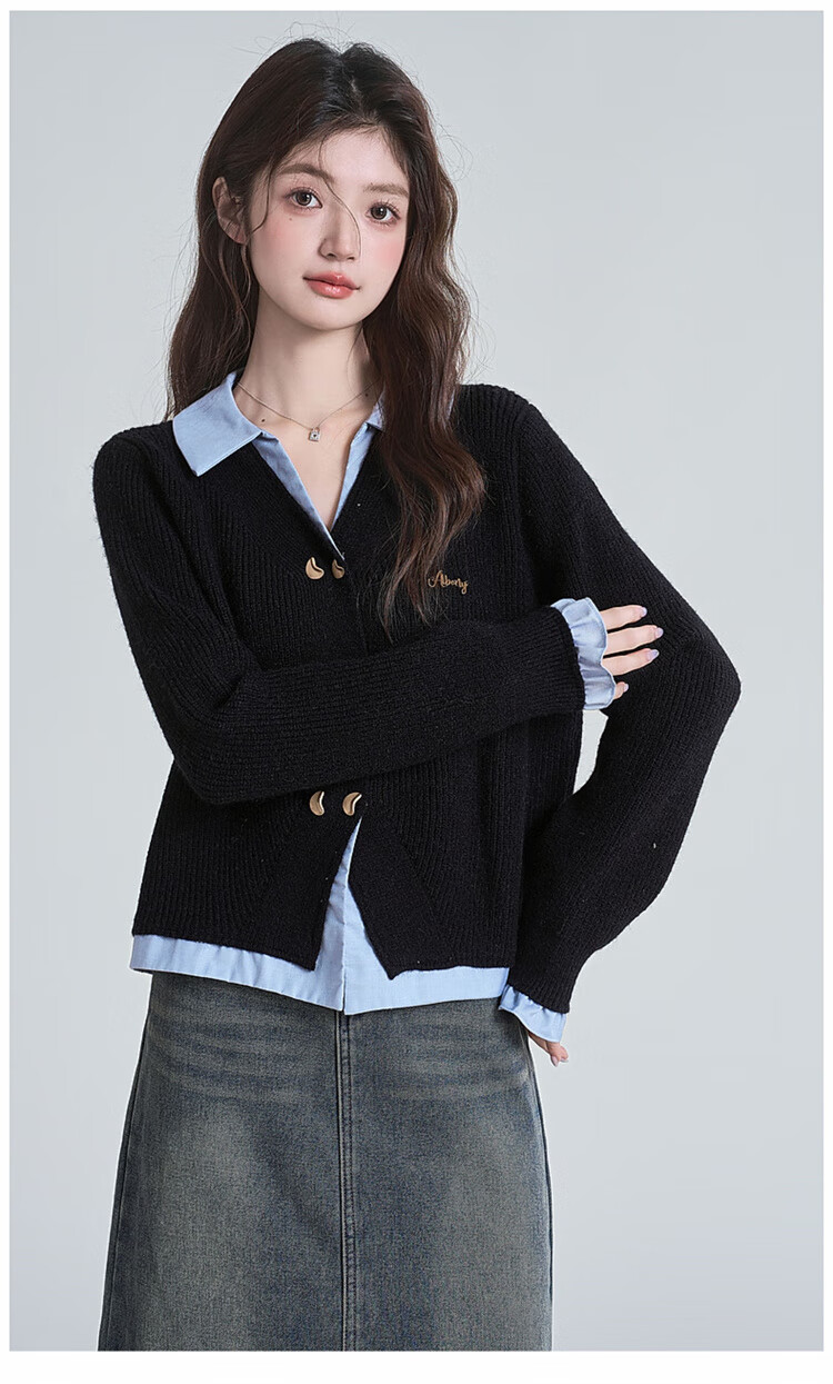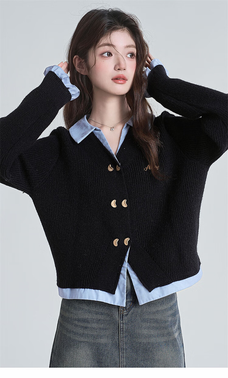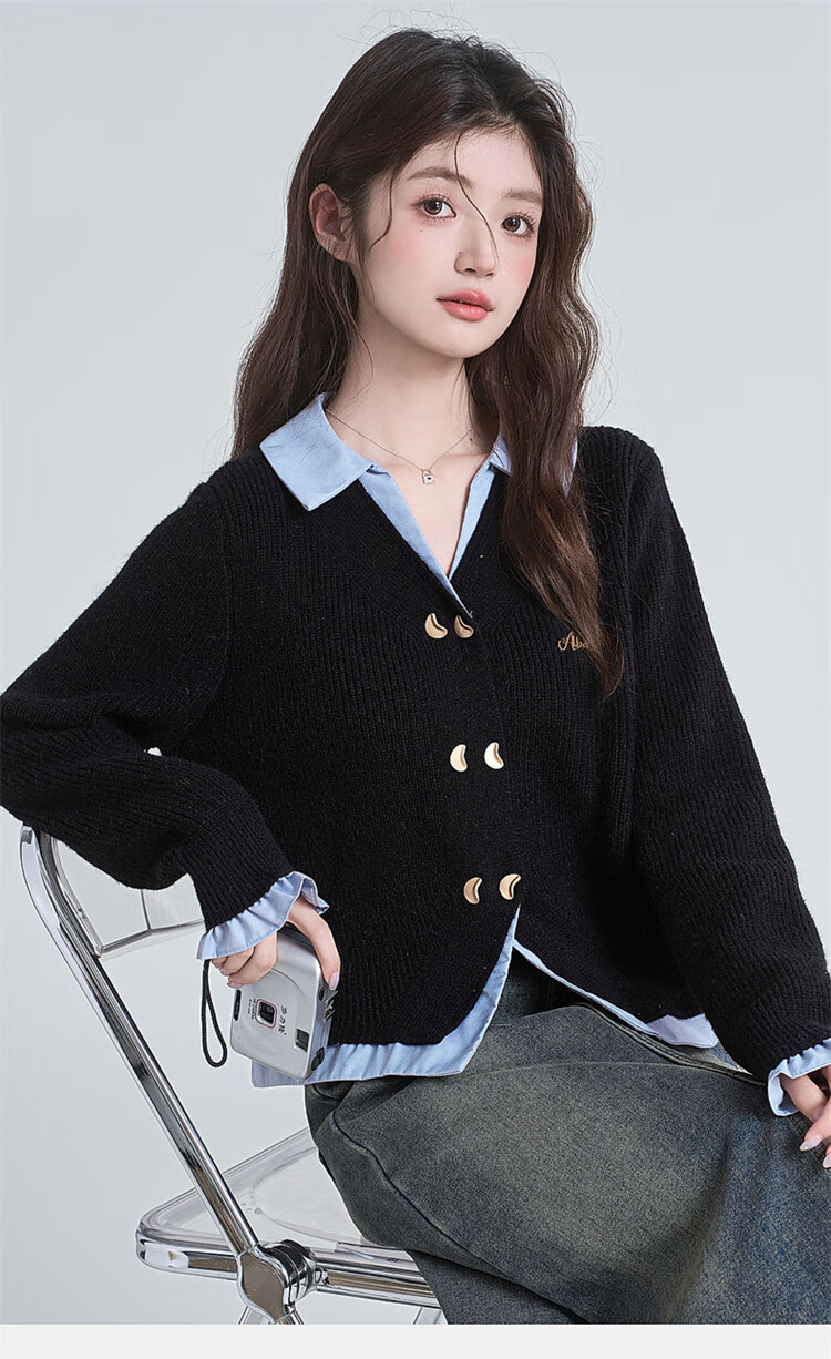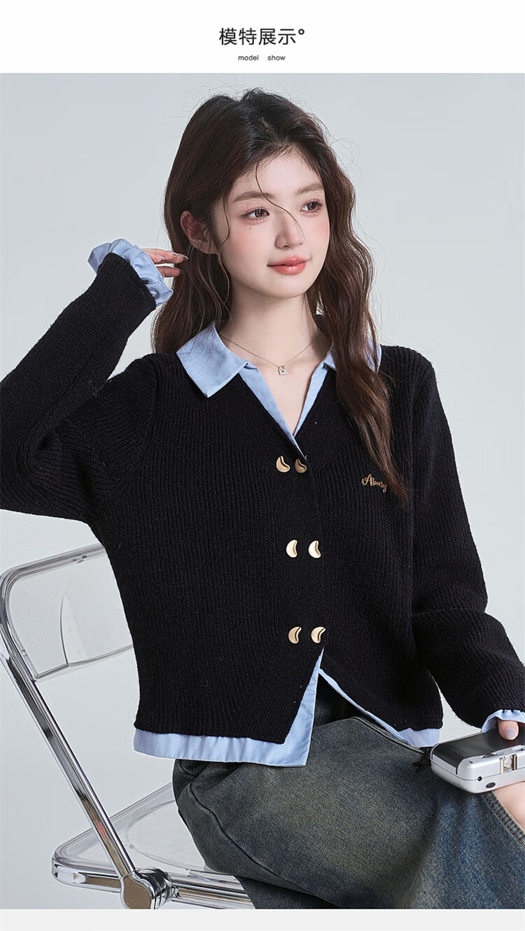 Muni black fake two-piece sweater for women 2025 new college style spliced POLO collar sweater jacket top autumn and winter fake two-piece PoLo collar sweater black (80-130Jin Jin is equal to 0.5 kg)