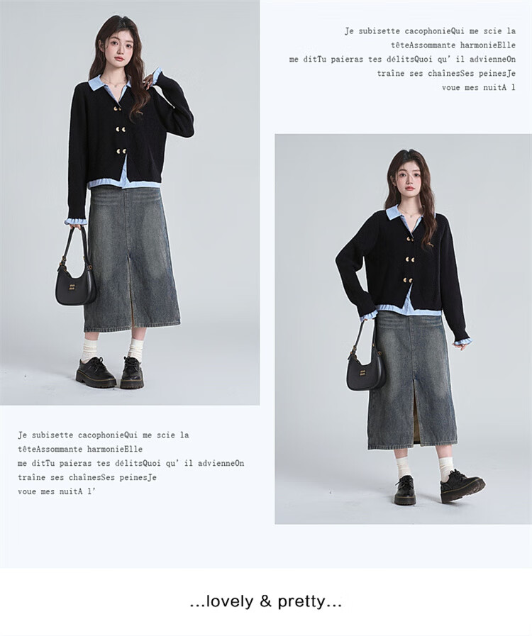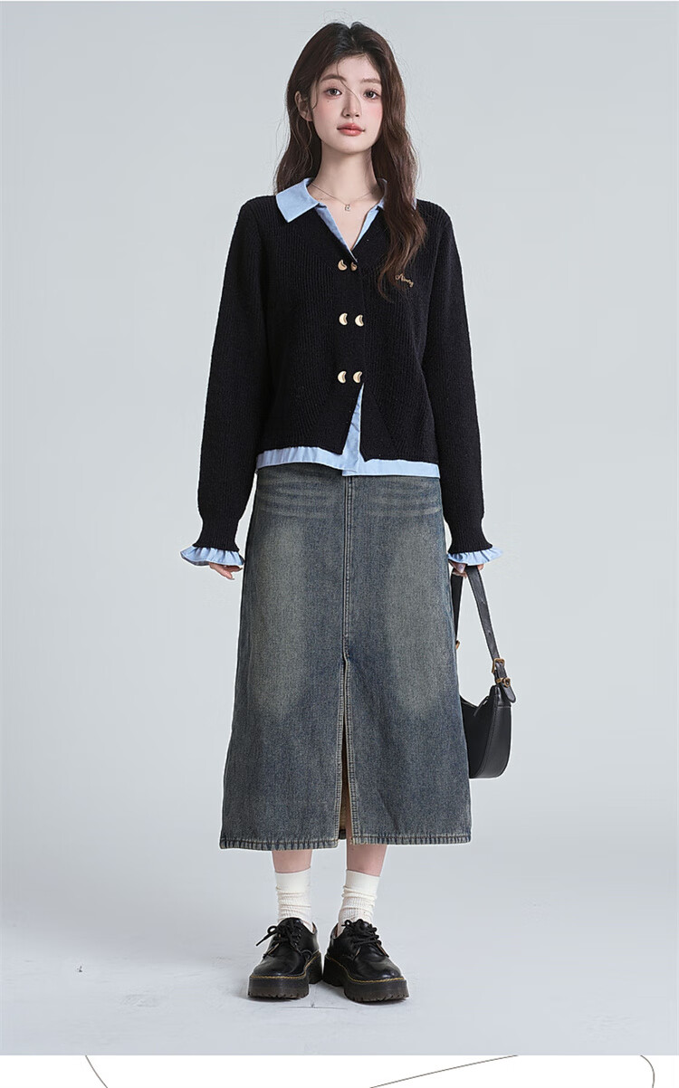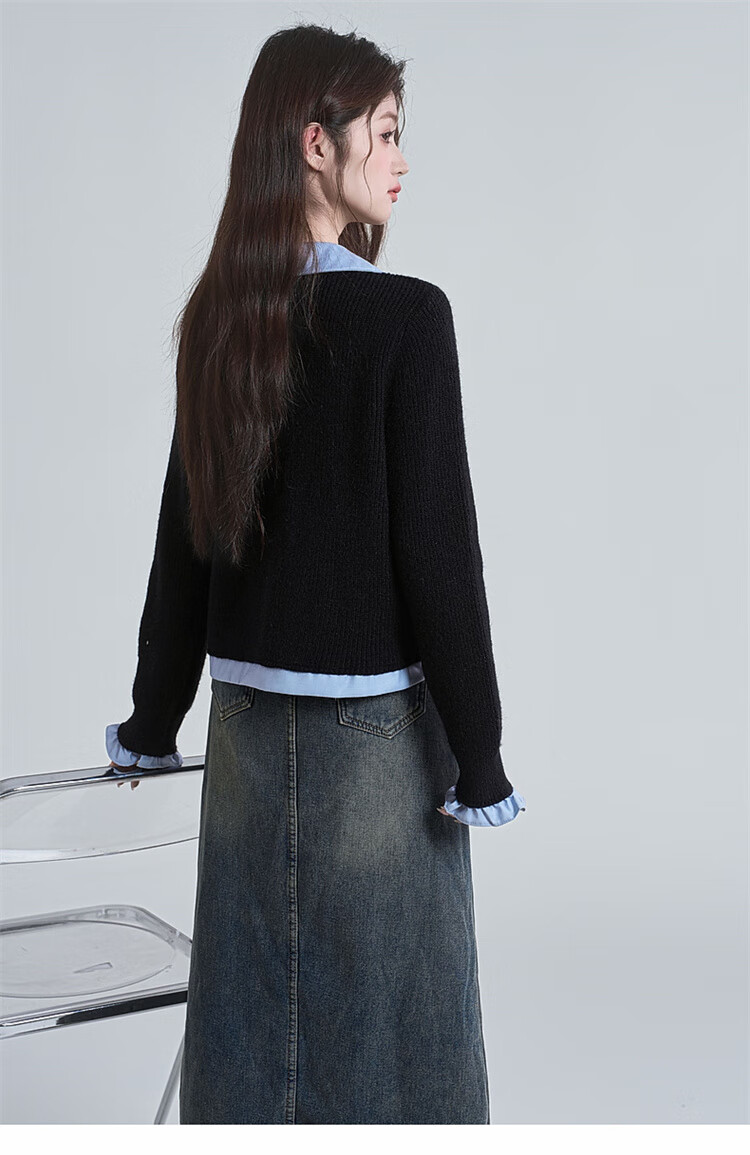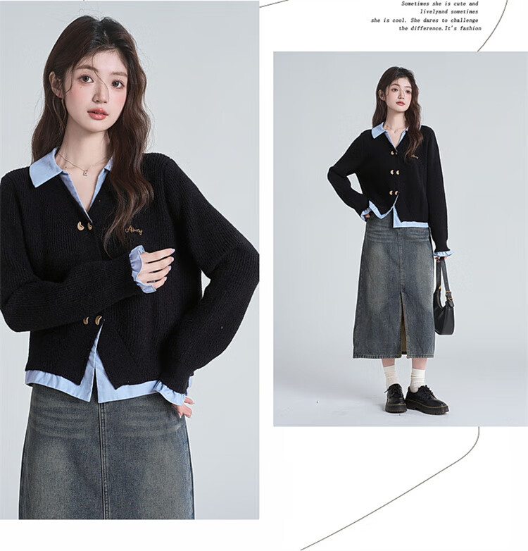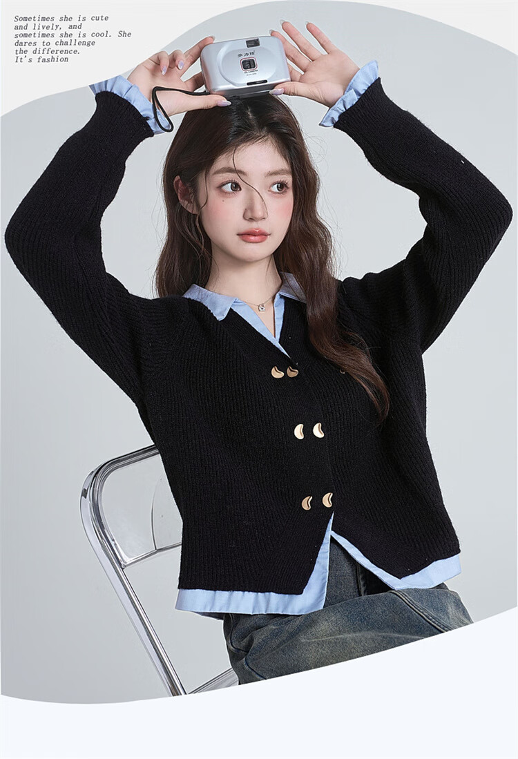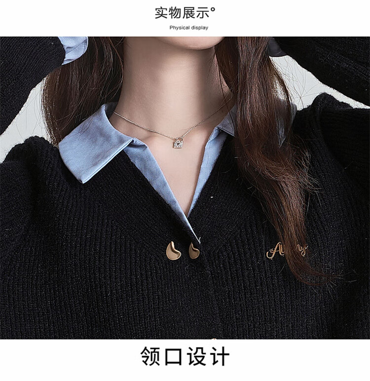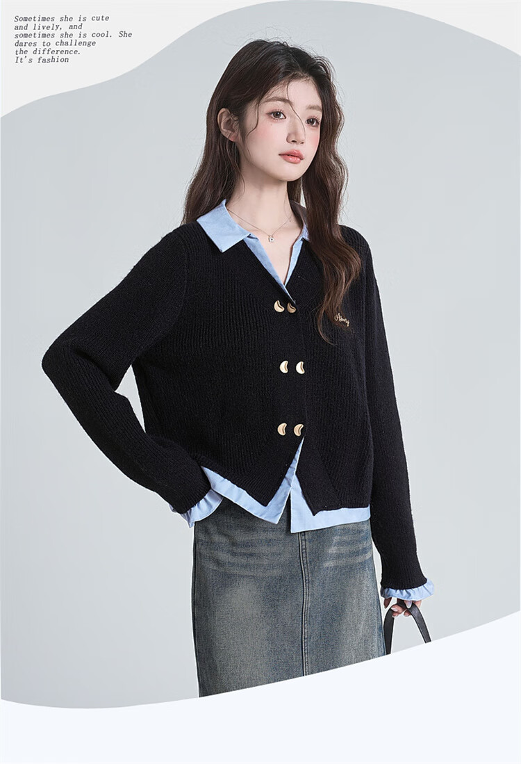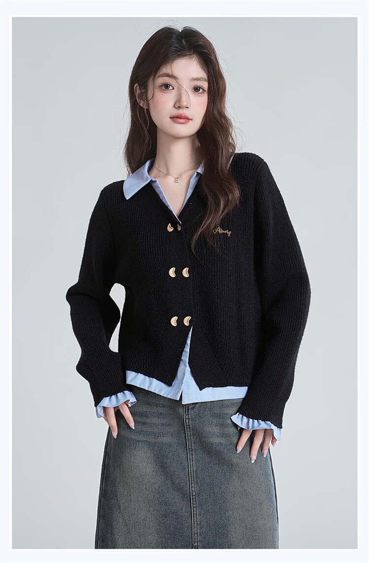 Muni black fake two-piece sweater for women 2025 new college style spliced POLO collar sweater jacket top autumn and winter fake two-piece PoLo collar sweater black (80-130Jin Jin is equal to 0.5 kg)