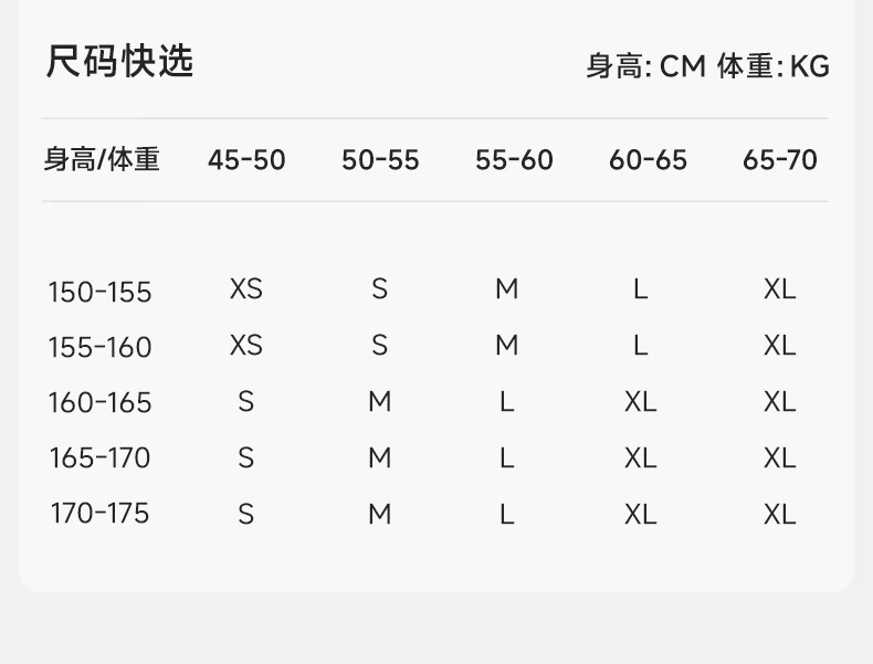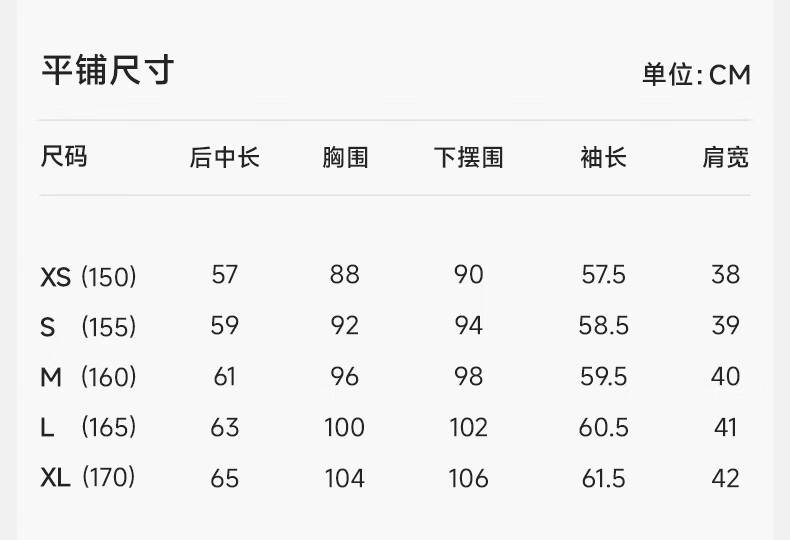 China (cm) 160-165/84-86 165-170 / 88-90 167-172 / 92-96 168-173 / 98-102 170-176 / 106-110