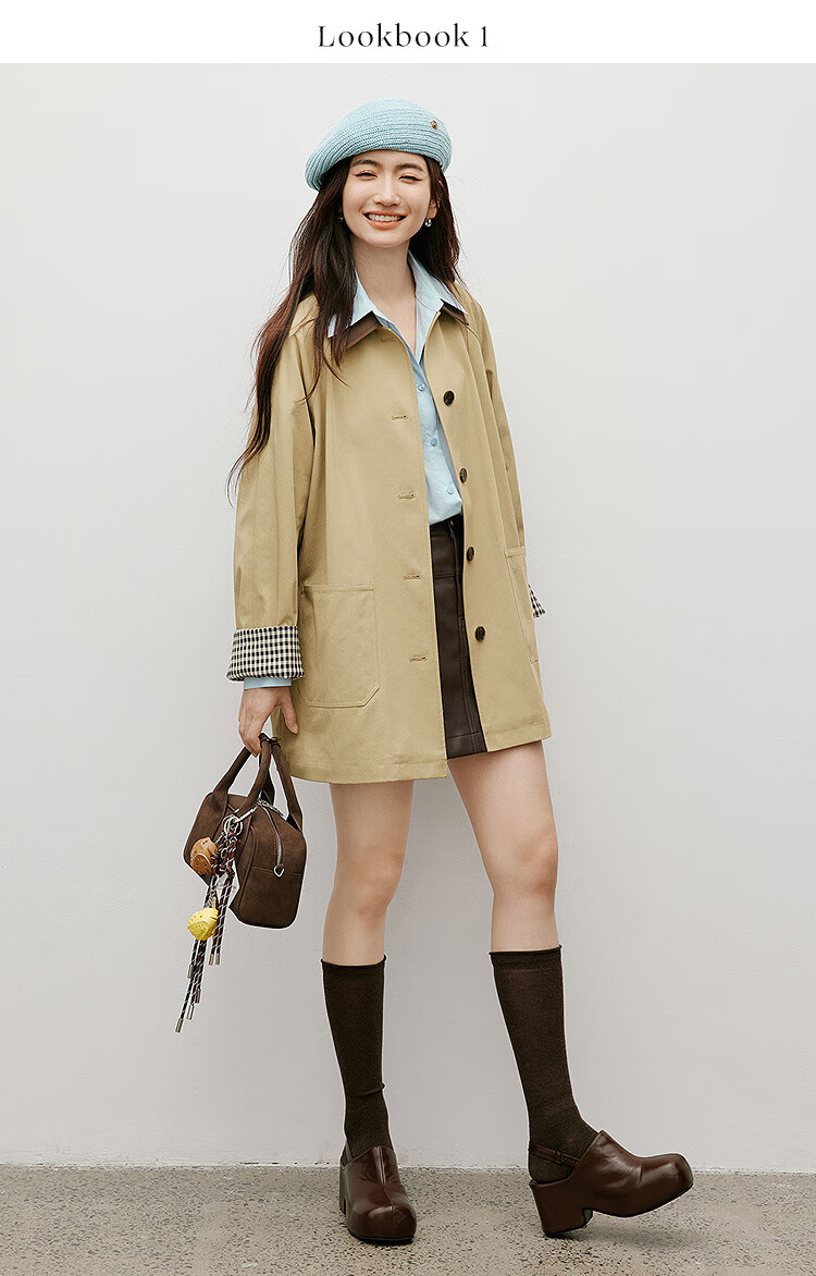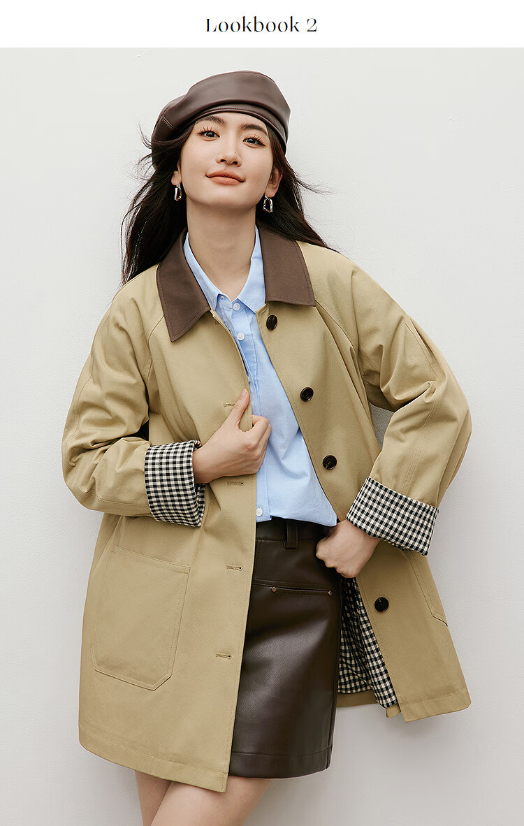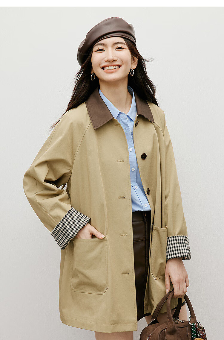 Red Sleeve Retro Casual Windbreaker 2025 Autumn New Women's Barn Style Contrast Color Plaid Splicing Lapel Temperament Jacket Khaki 3038 S
