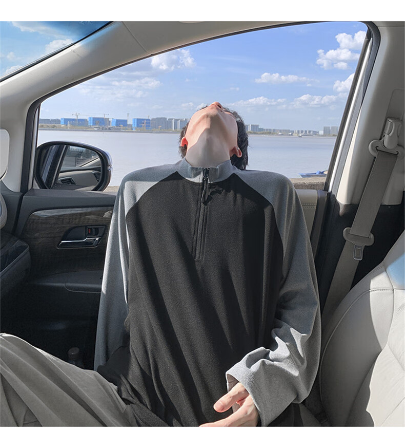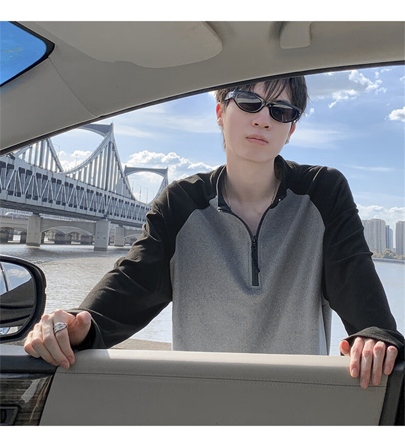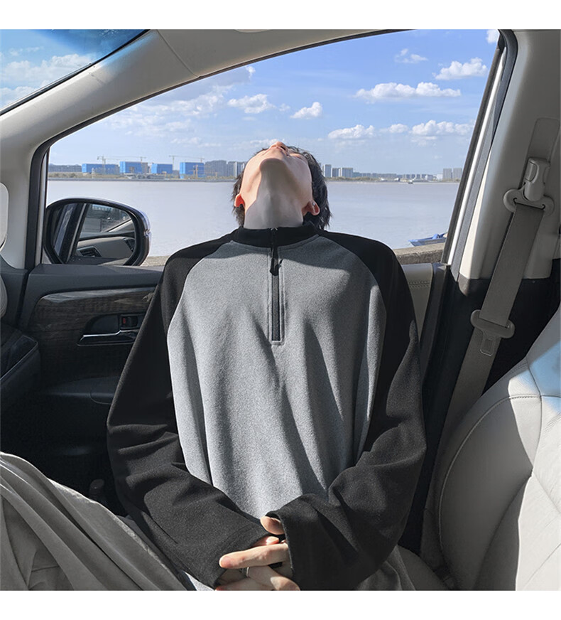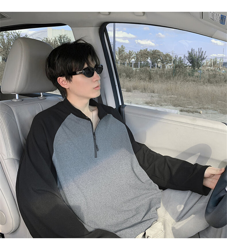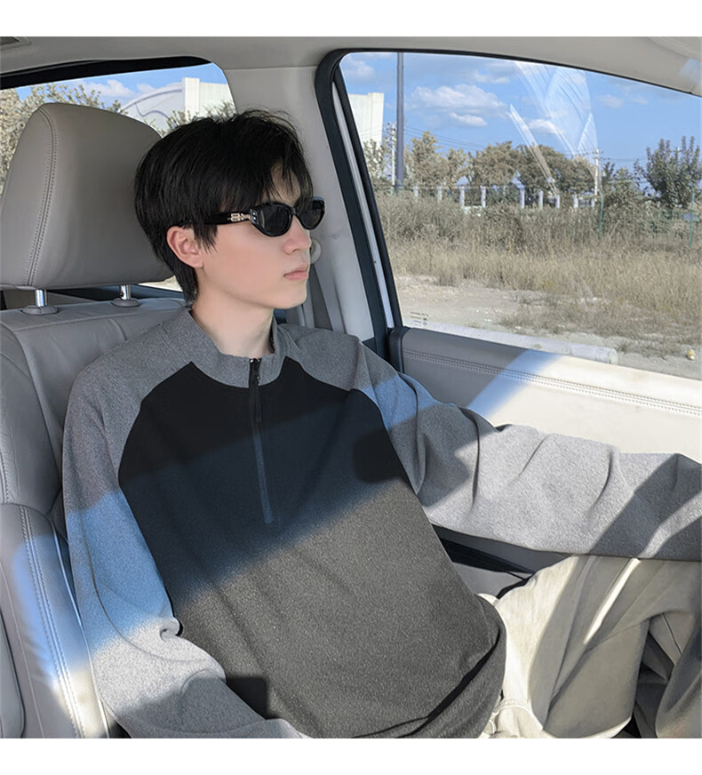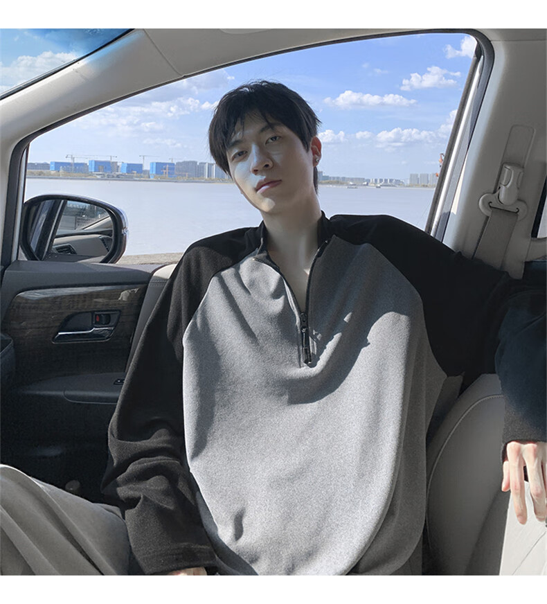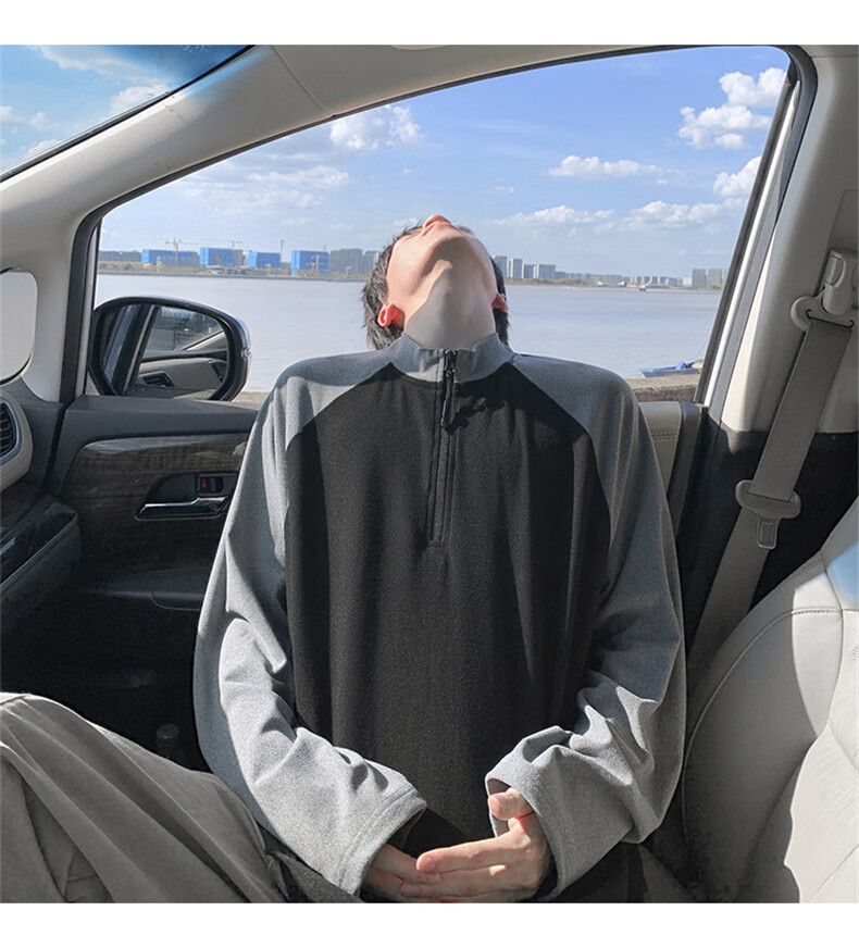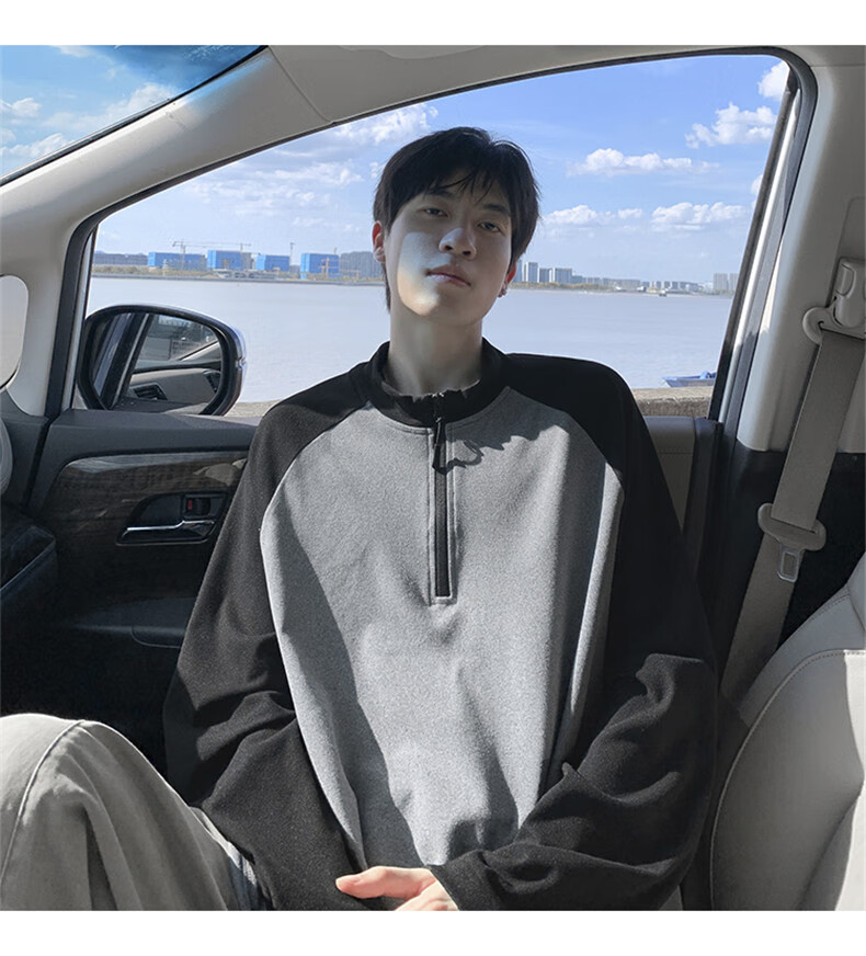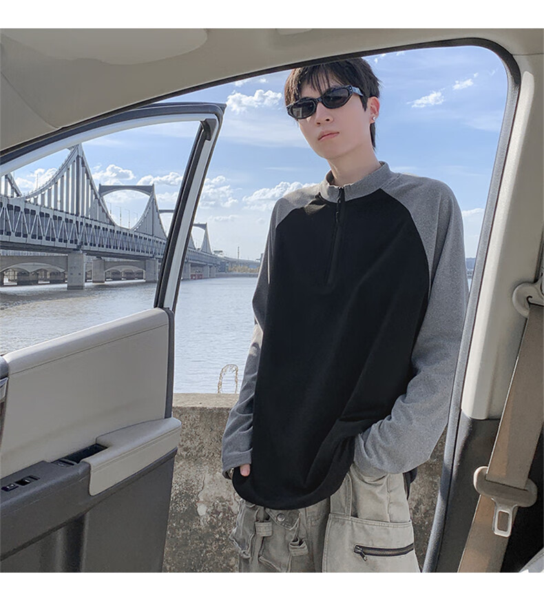 Cebrodz French half-zip long-sleeved T-shirt for men in spring and autumn, versatile youth outdoor sports cycling trendy brand heavy top, black XL