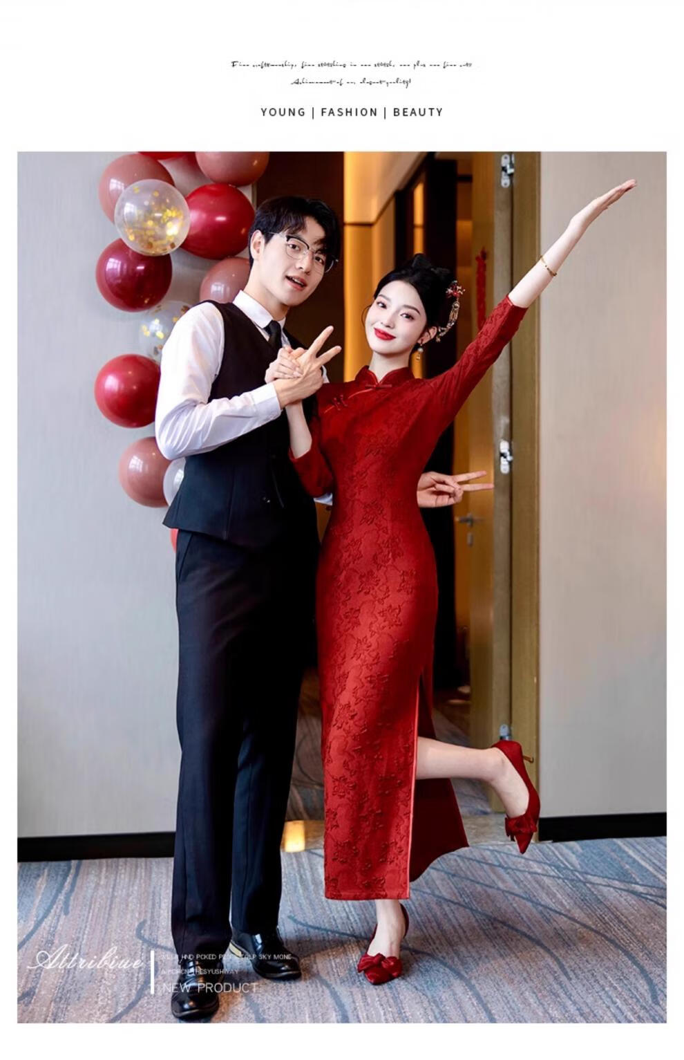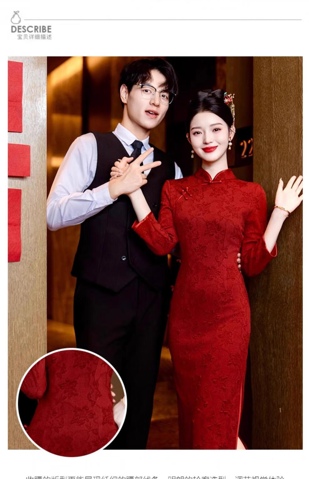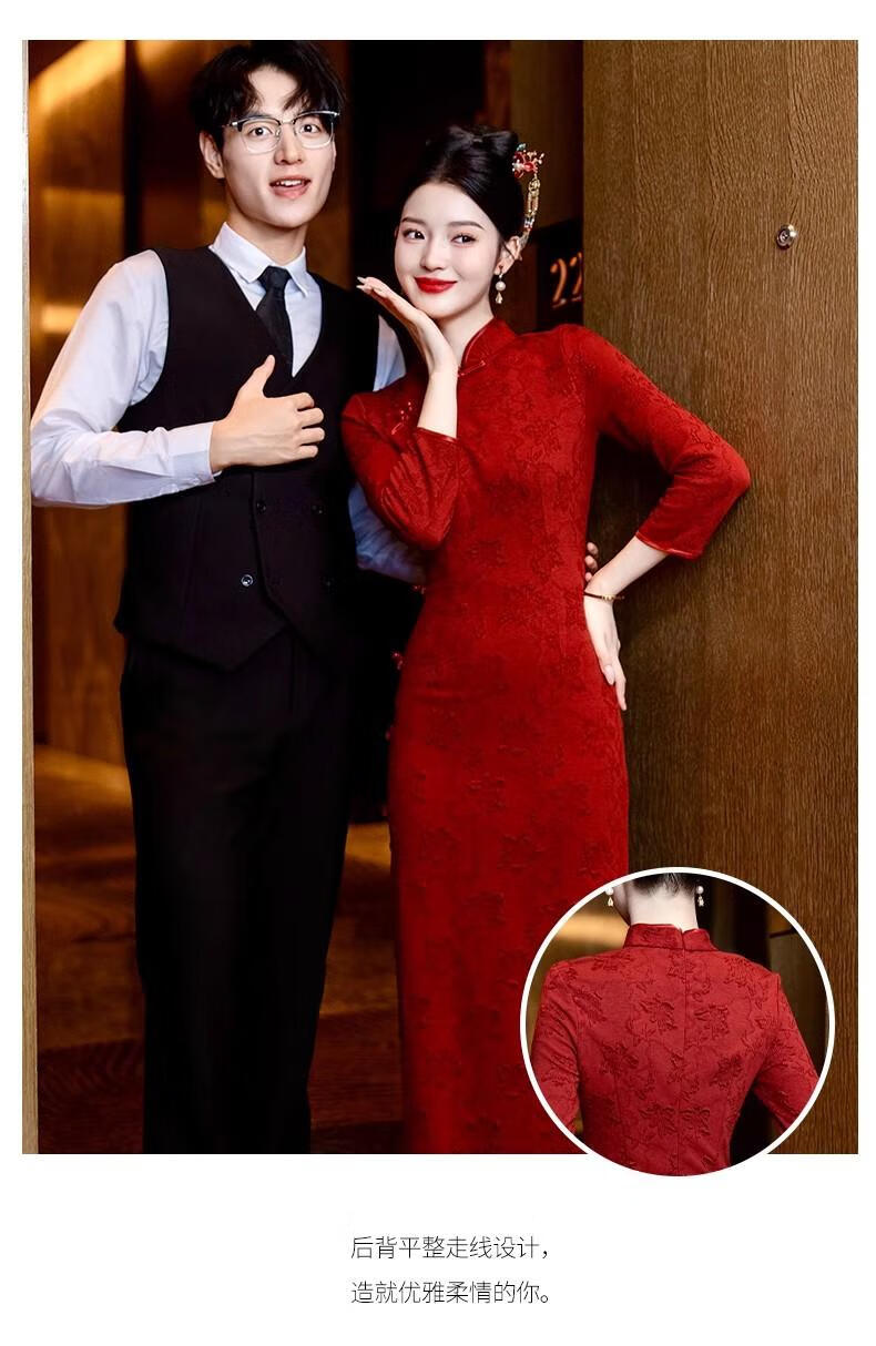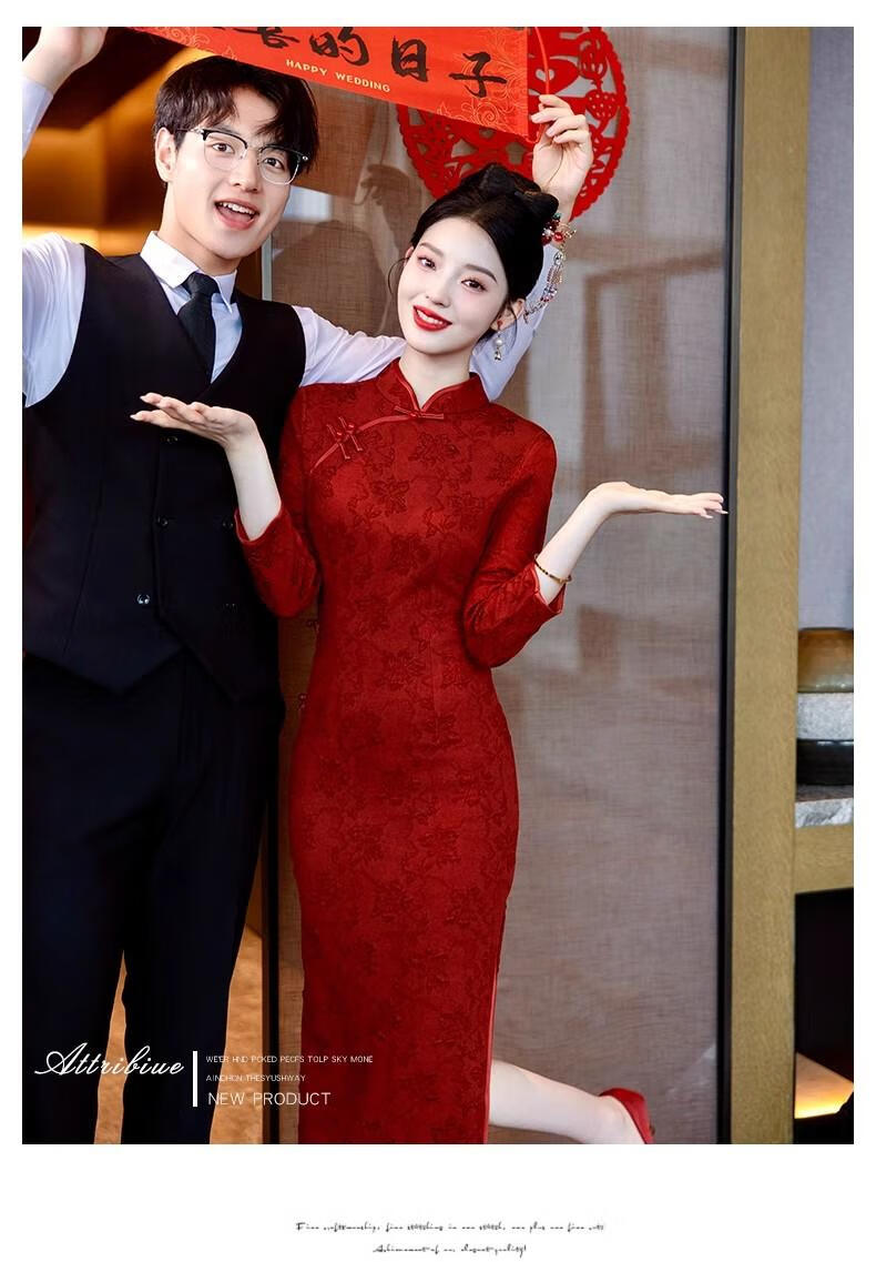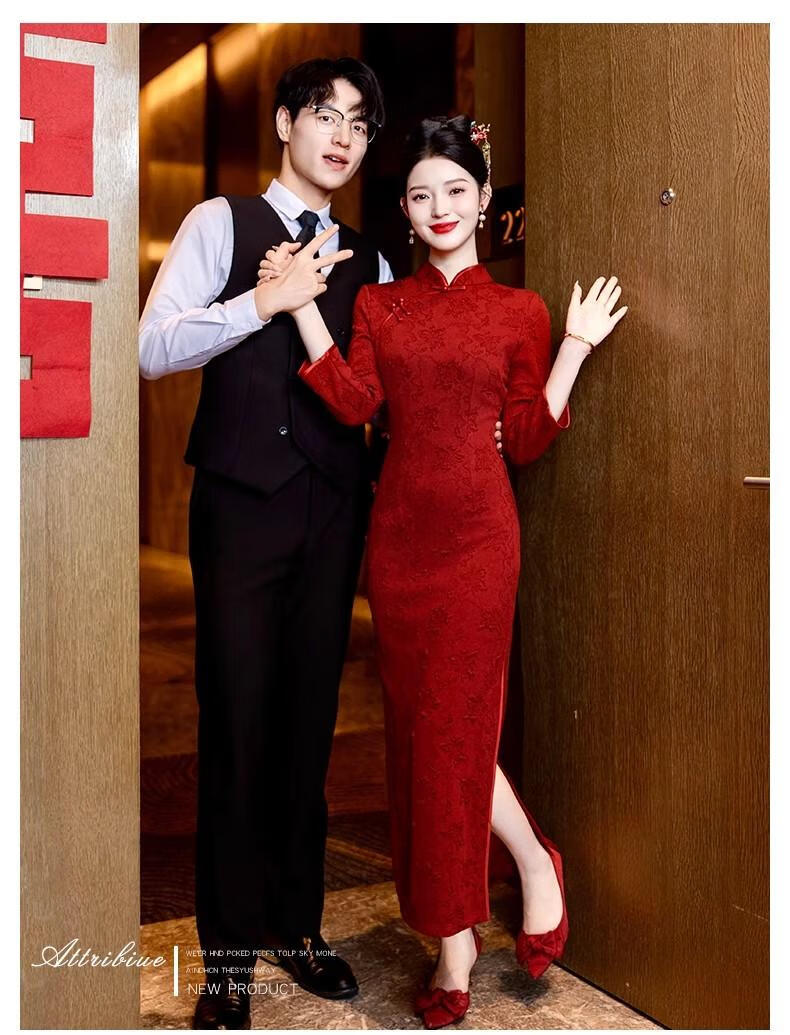 Pierre Cardin New Chinese Style Red Wedding Cheongsam Toast Wear 2025 New Bride Long Engagement Party Slim Dress Burgundy S