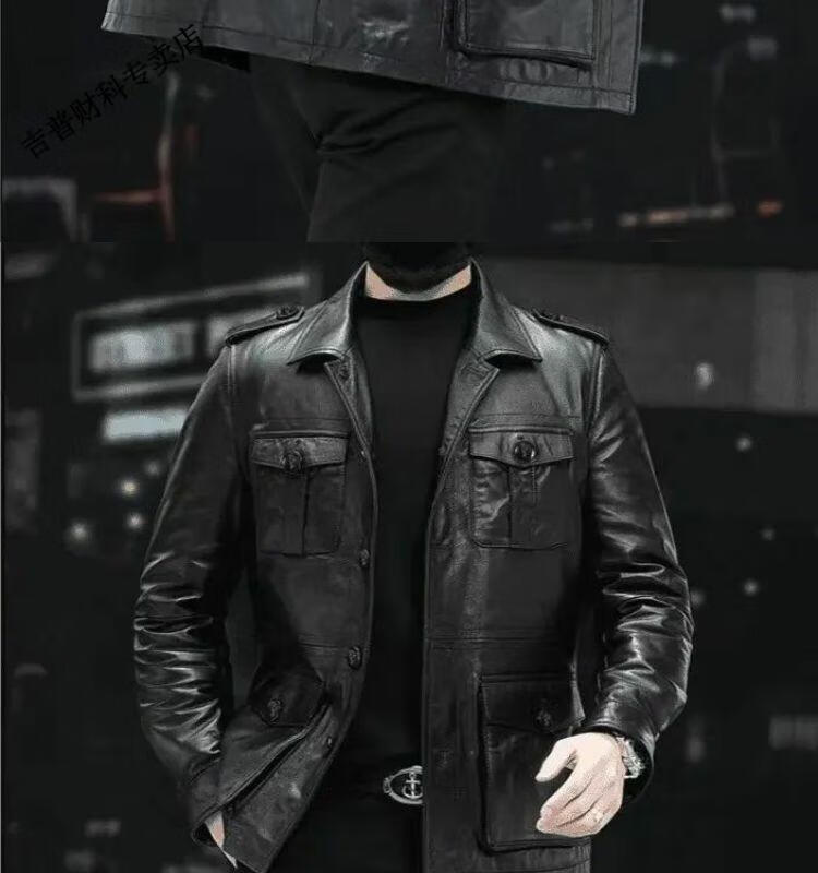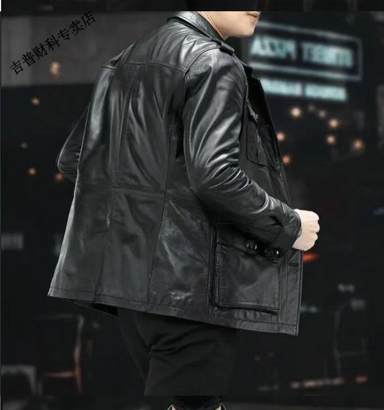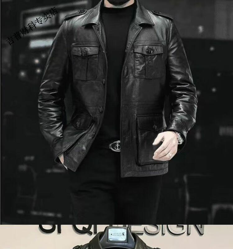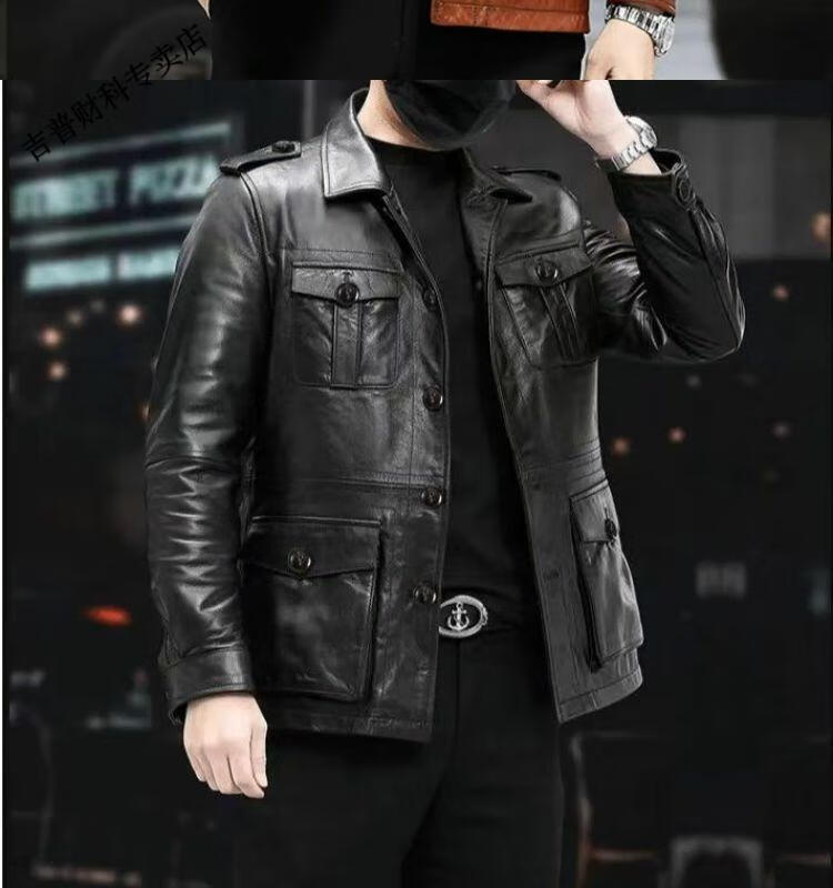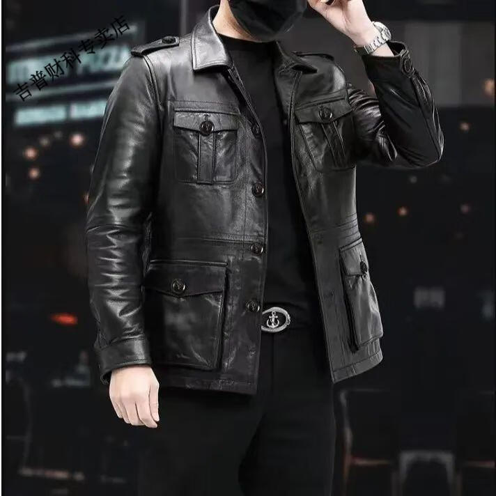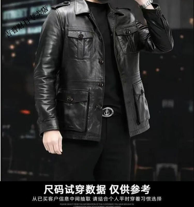 JEEP SPIRIT Heavy Industry Quality Motorcycle Leather Jacket Leather Jacket Slim Hunting Short Lapel Multi-Pocket Autumn and Winter New Men's Clothing Black M 90-110Jin Jin is equal to 0.5 kg
