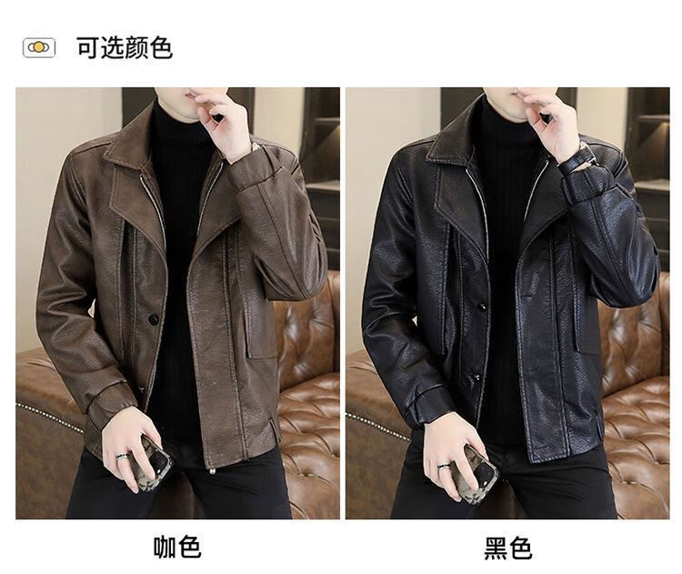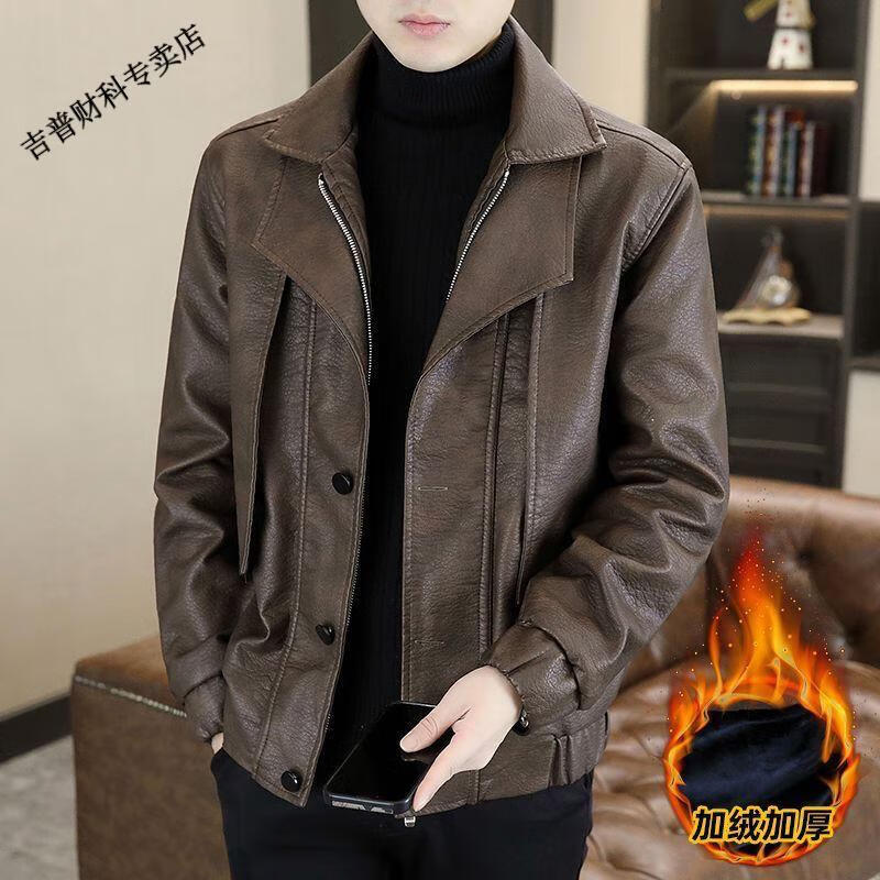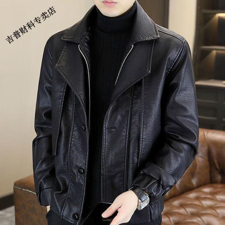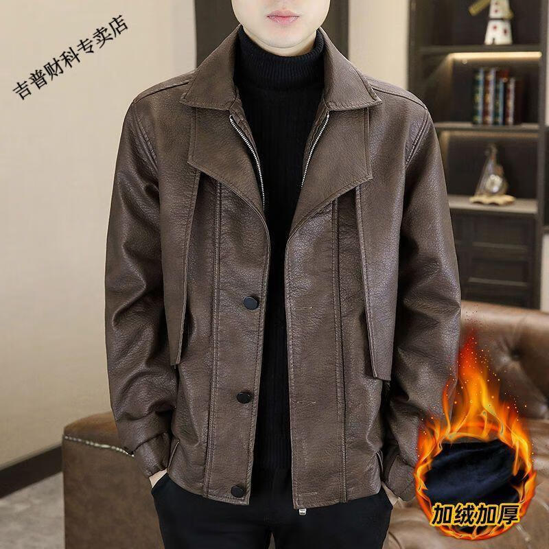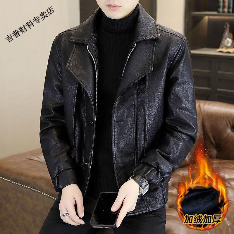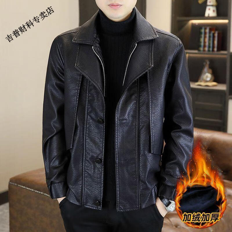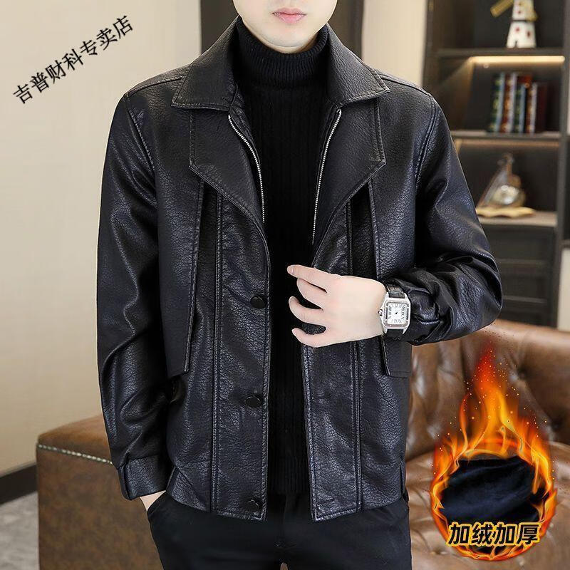 JEEP SPIRIT fake two-piece men's leather jacket 2025 new winter velvet warm casual motorcycle leather jacket top high-end black velvet M 100-120Jin Jin equals 0.5 kg