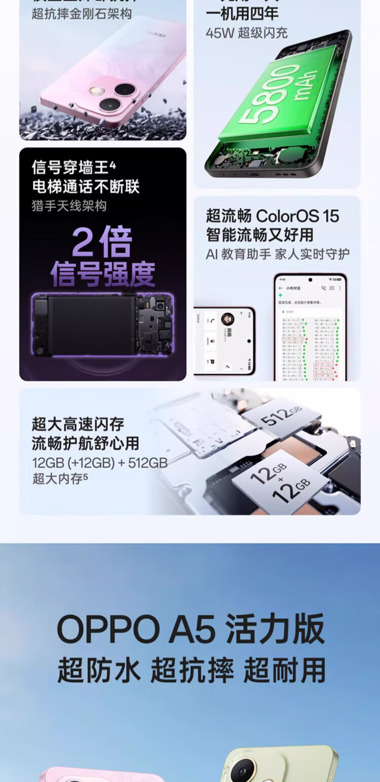 OnePlus 15% off subsidy OPPO A5 Vitality Edition New Product 5G Full Netcom IP69 Full Level Waterproof 360 Anti-fall Over Four Years Durable Large Battery Photo Game Agate Pink 8GB+256GB Active Edition National Joint Warranty