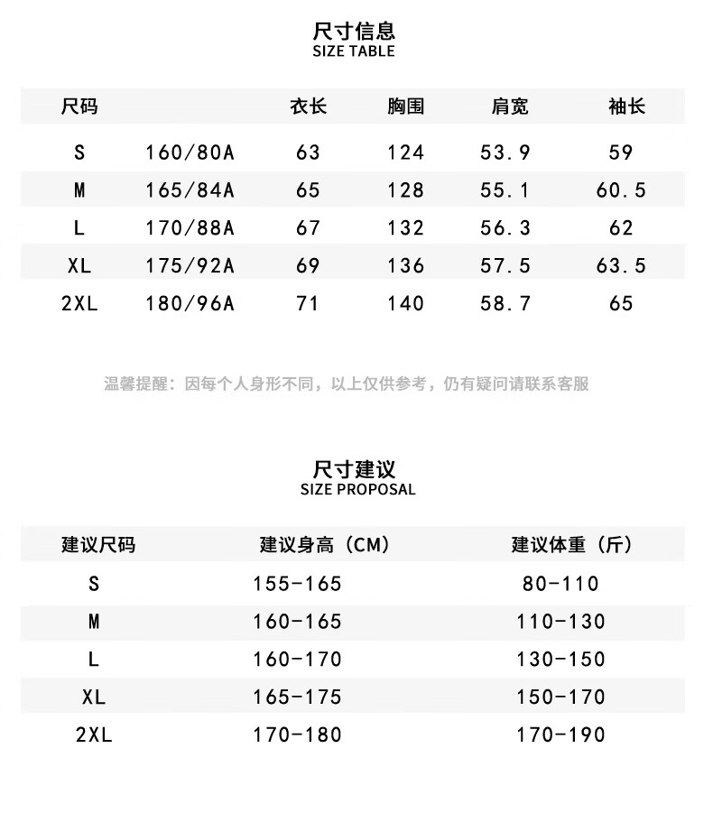 China (cm) 165 / 88-90 170 / 96-98 175 / 108-110 180 / 118-122 185 / 126-130
